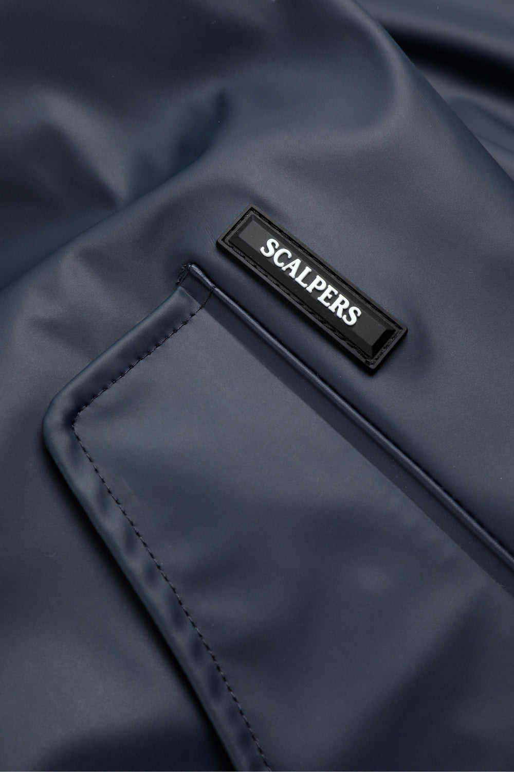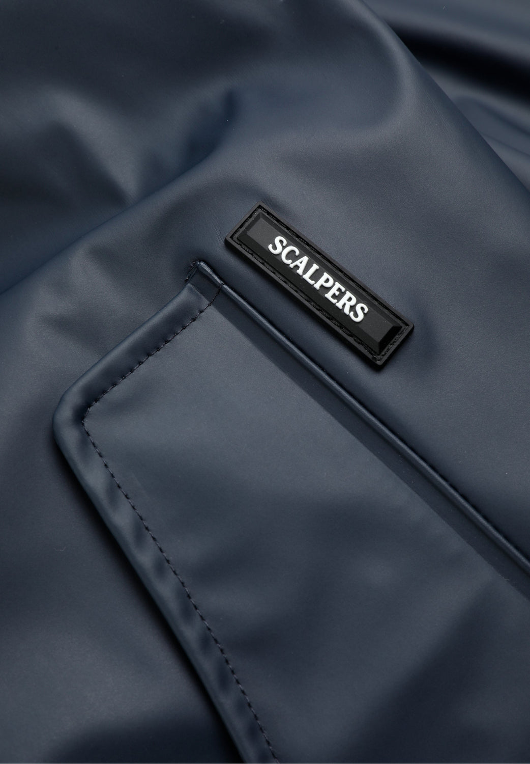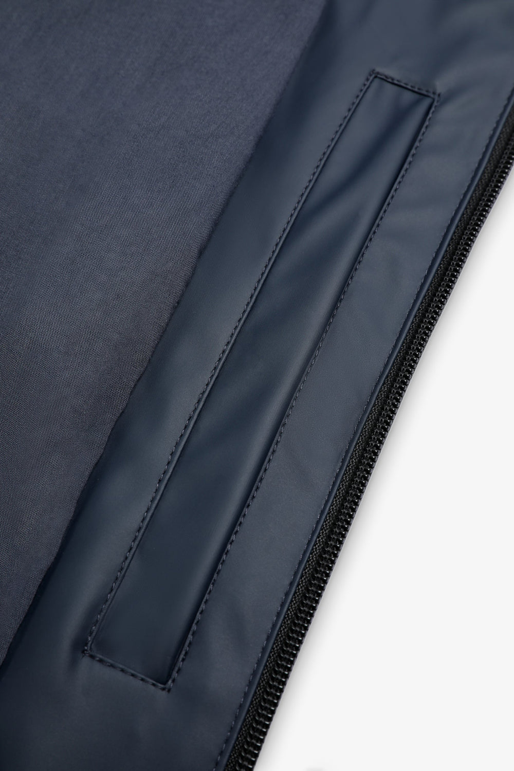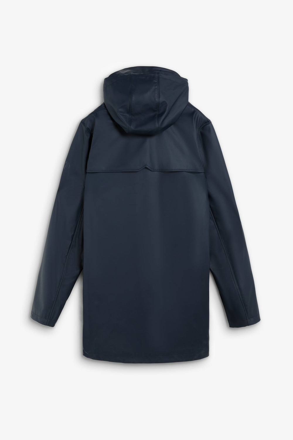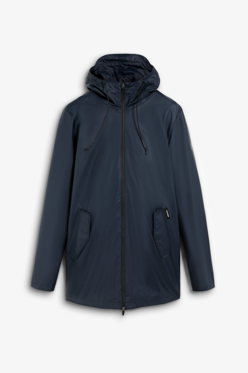 Waterproof jacket. Collar with an adjustable drawstring hood. Double slider thermo-sealed zip fastening. Long sleeves. Side pockets with placket and snap button. Contrast rubberised logo detail on lower front and matching skull on zip.