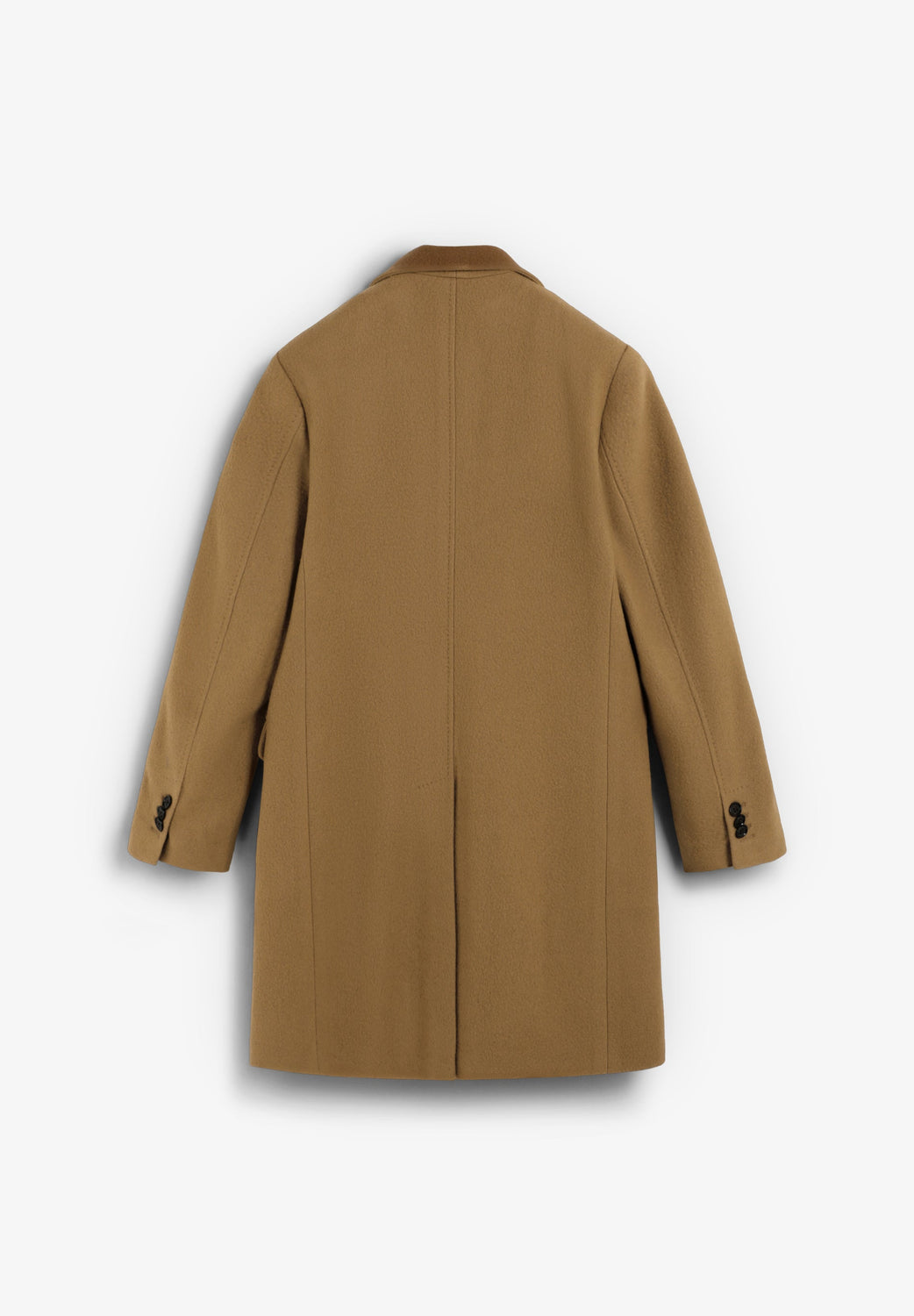Long coat made of a high quality virgin wool blend. Lapel collar. Long sleeves with buttoned cuffs. Front pockets with double flap. Front button fastening. Back vent.