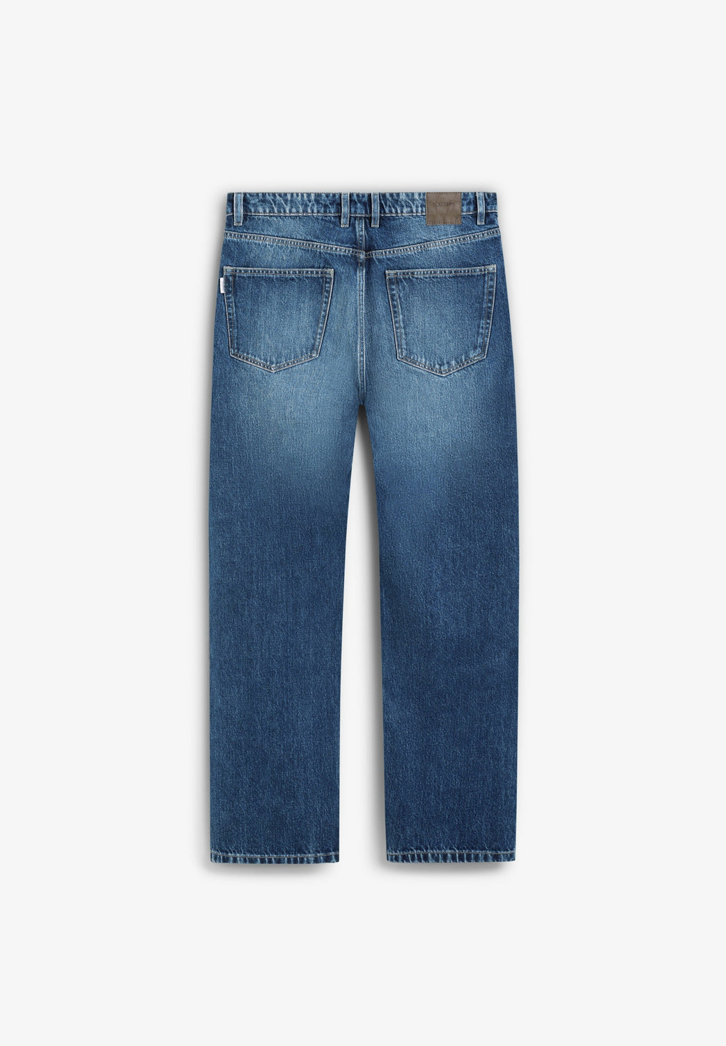 Regular fit jeans. Five pockets. Faded effect. Belt loops at the waist. Front zip and button fastening.