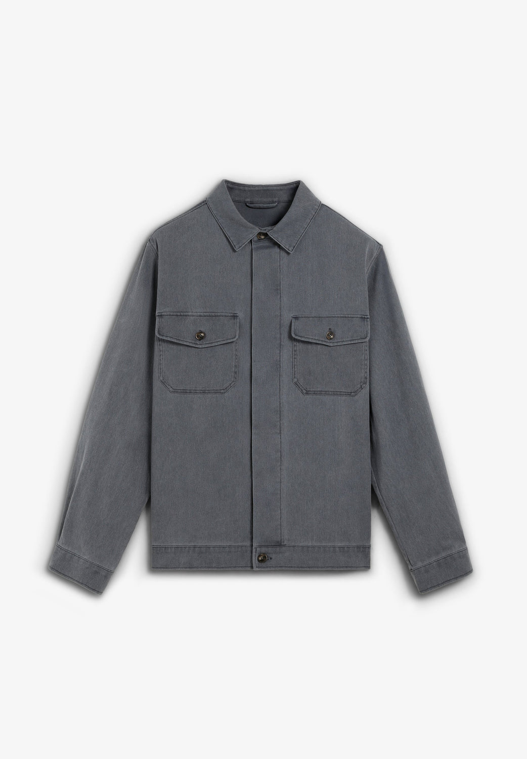 Jacket made of recycled cotton. Faded effect. Two flap pockets on the chest with button fastening. Front button fastening.
