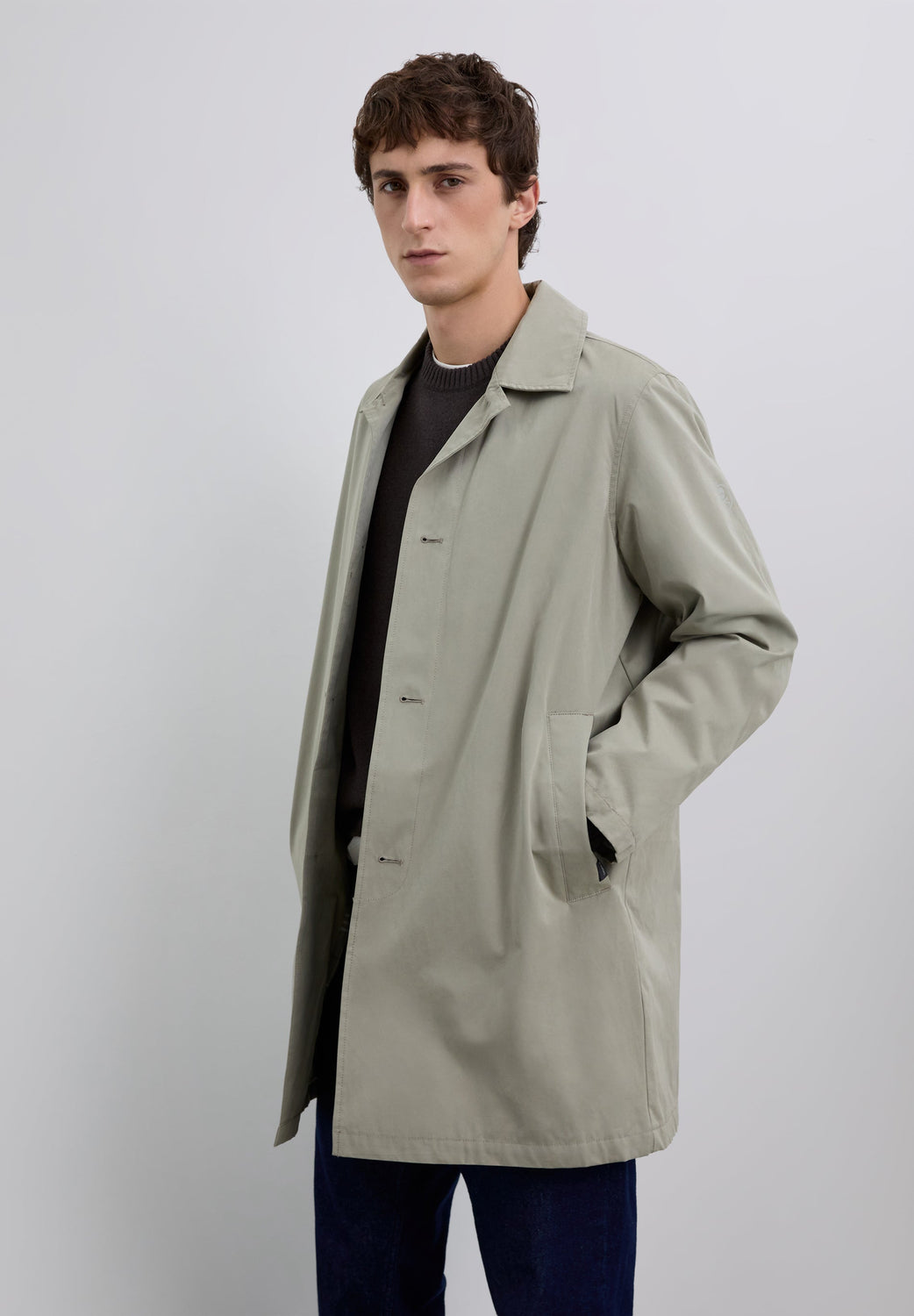 Trench coat with front button fastening. Shirt collar. Two front slant pockets. Stitching details along the length of the garment. Front button fastening. Checked lining. Logo label detail on pocket and inside pocket and skull print on sleeve.