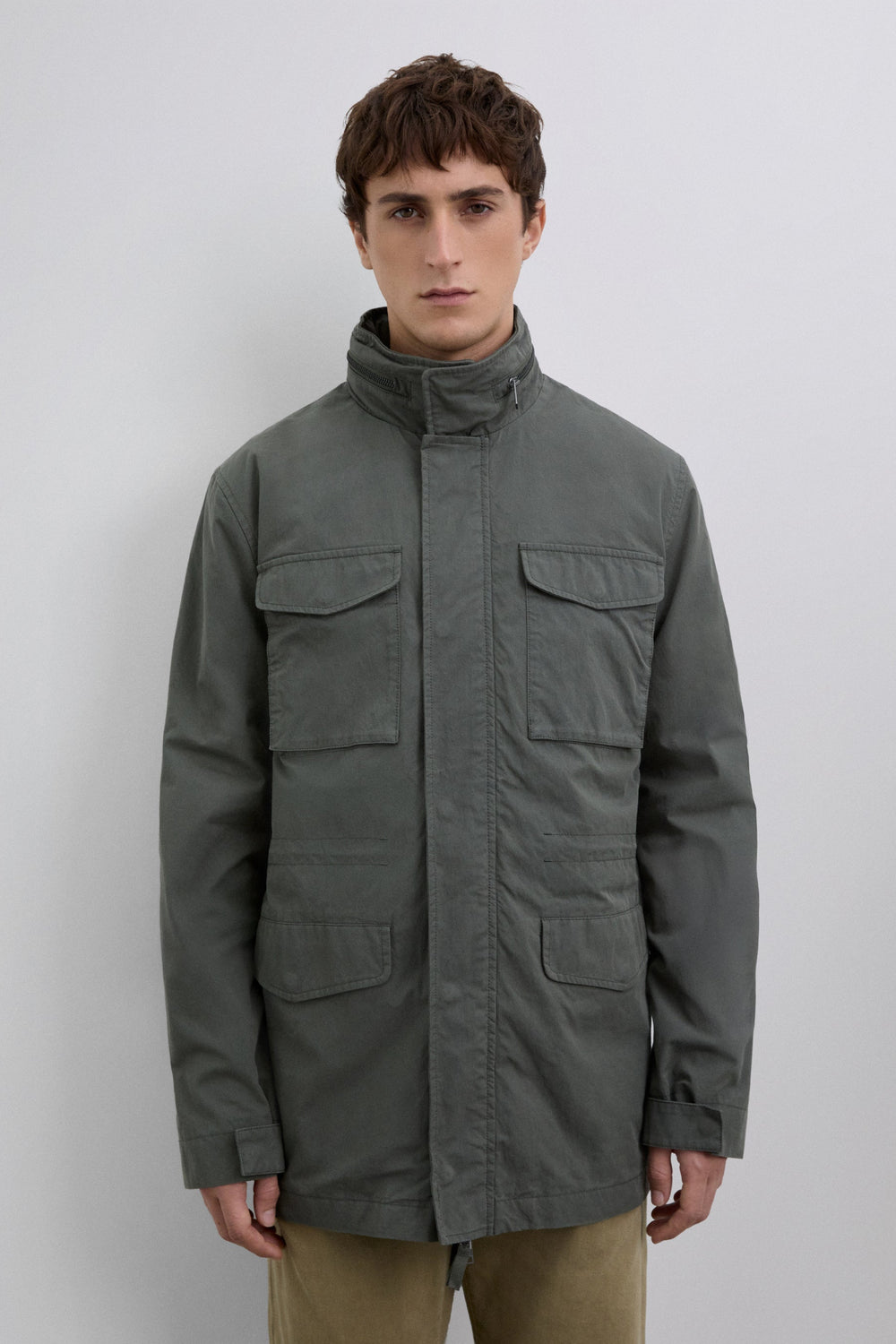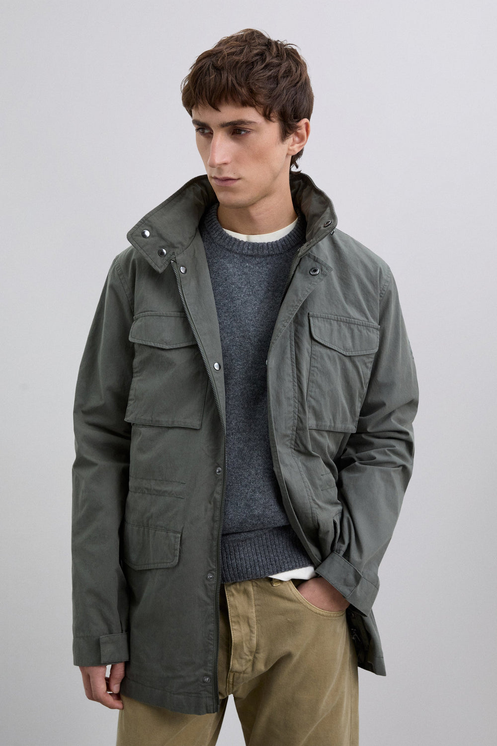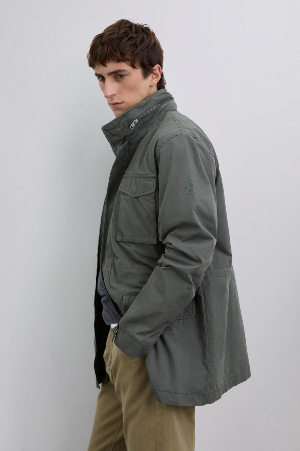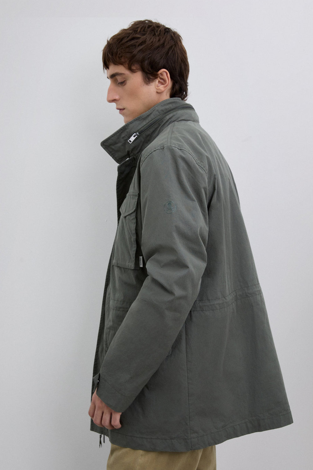 Military-style parka made of BCI cotton. Four front pockets. Neck fastening detail. Inner drawstring adjuster. Front zip fastening. Contrast concealed hood inside the collar. Logo label detail.