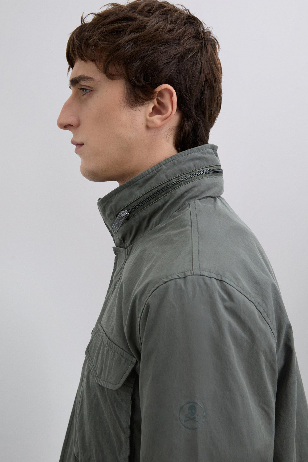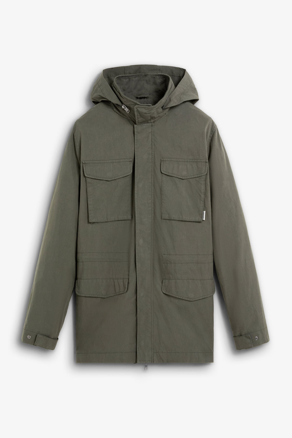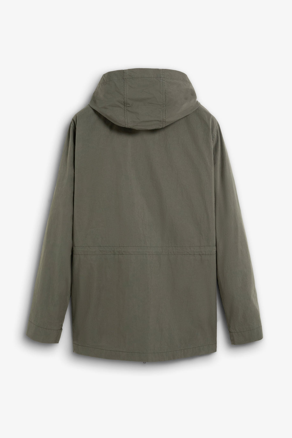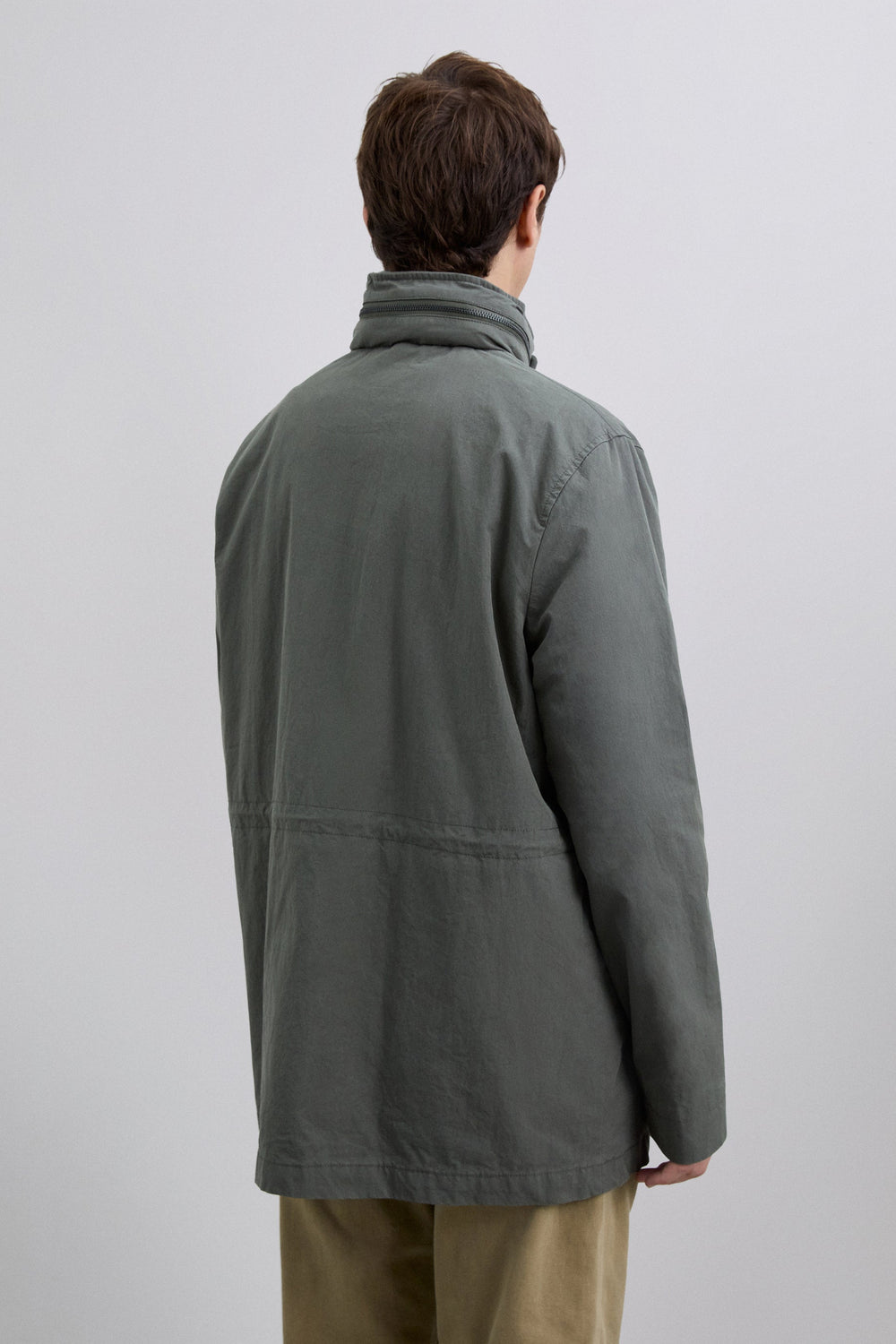 Military-style parka made of BCI cotton. Four front pockets. Neck fastening detail. Inner drawstring adjuster. Front zip fastening. Contrast concealed hood inside the collar. Logo label detail.