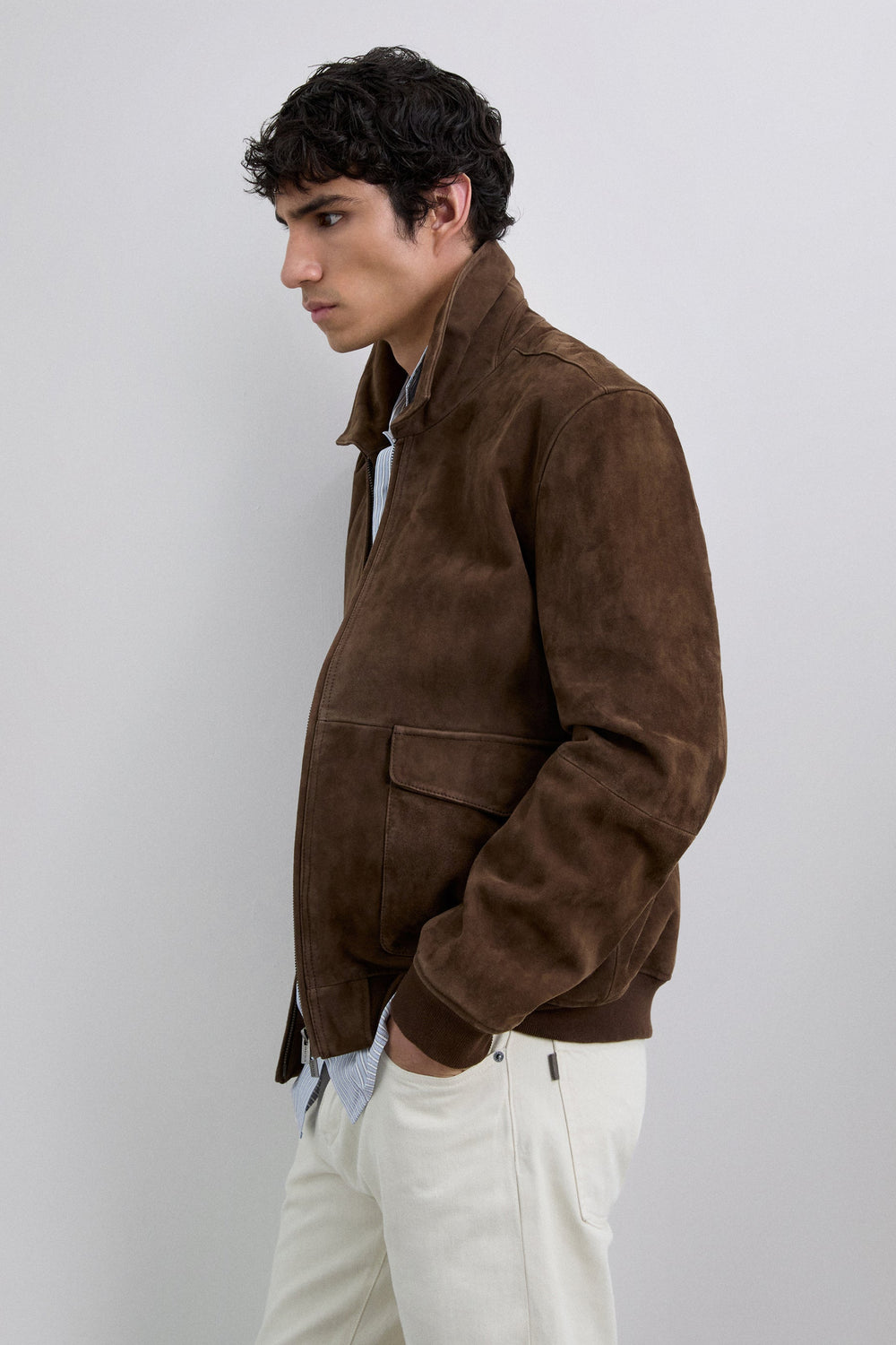 Suede jacket with shirt collar. Double front zip fastening. Ribbed cuffs and hem. Two front pockets with flap fastening.