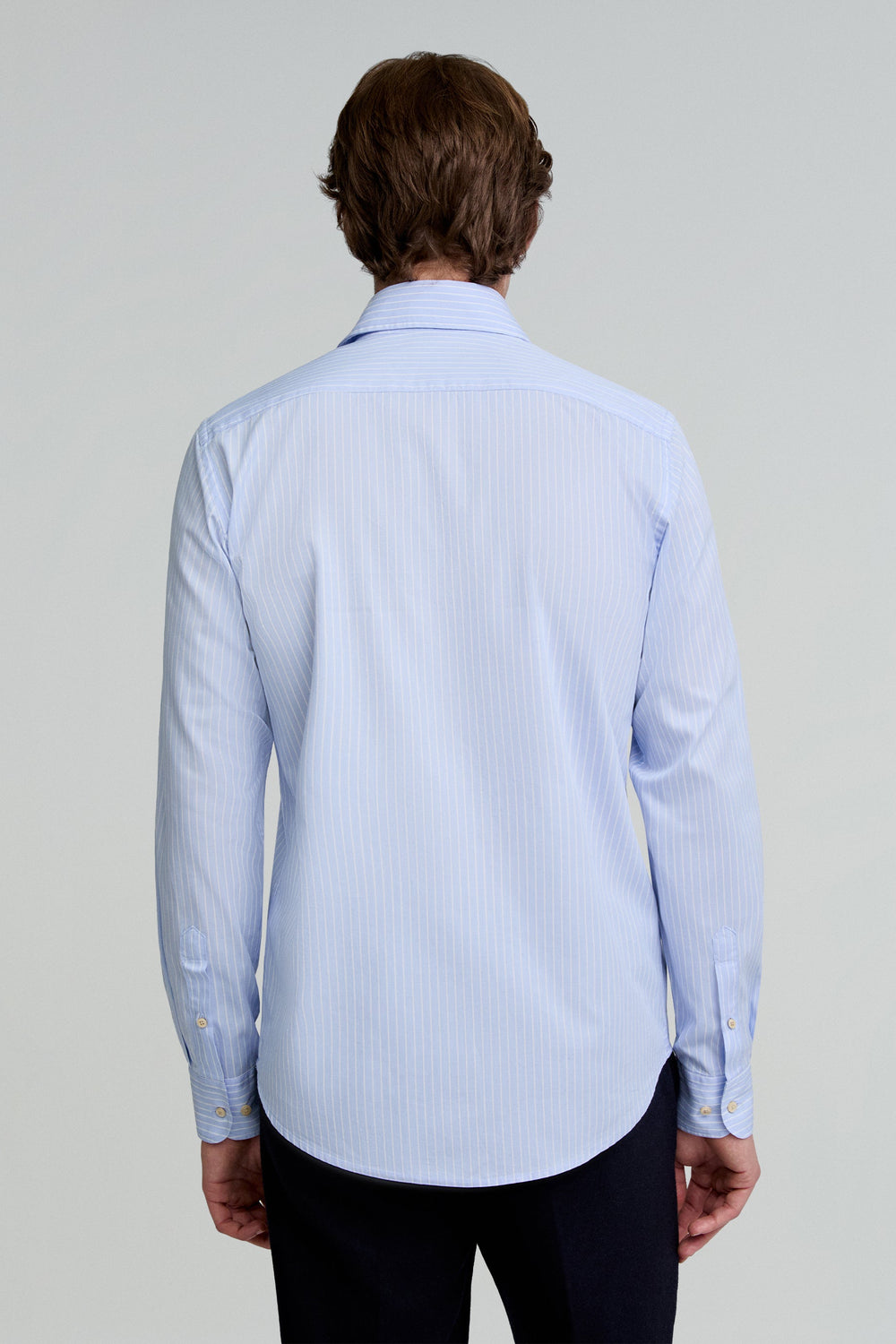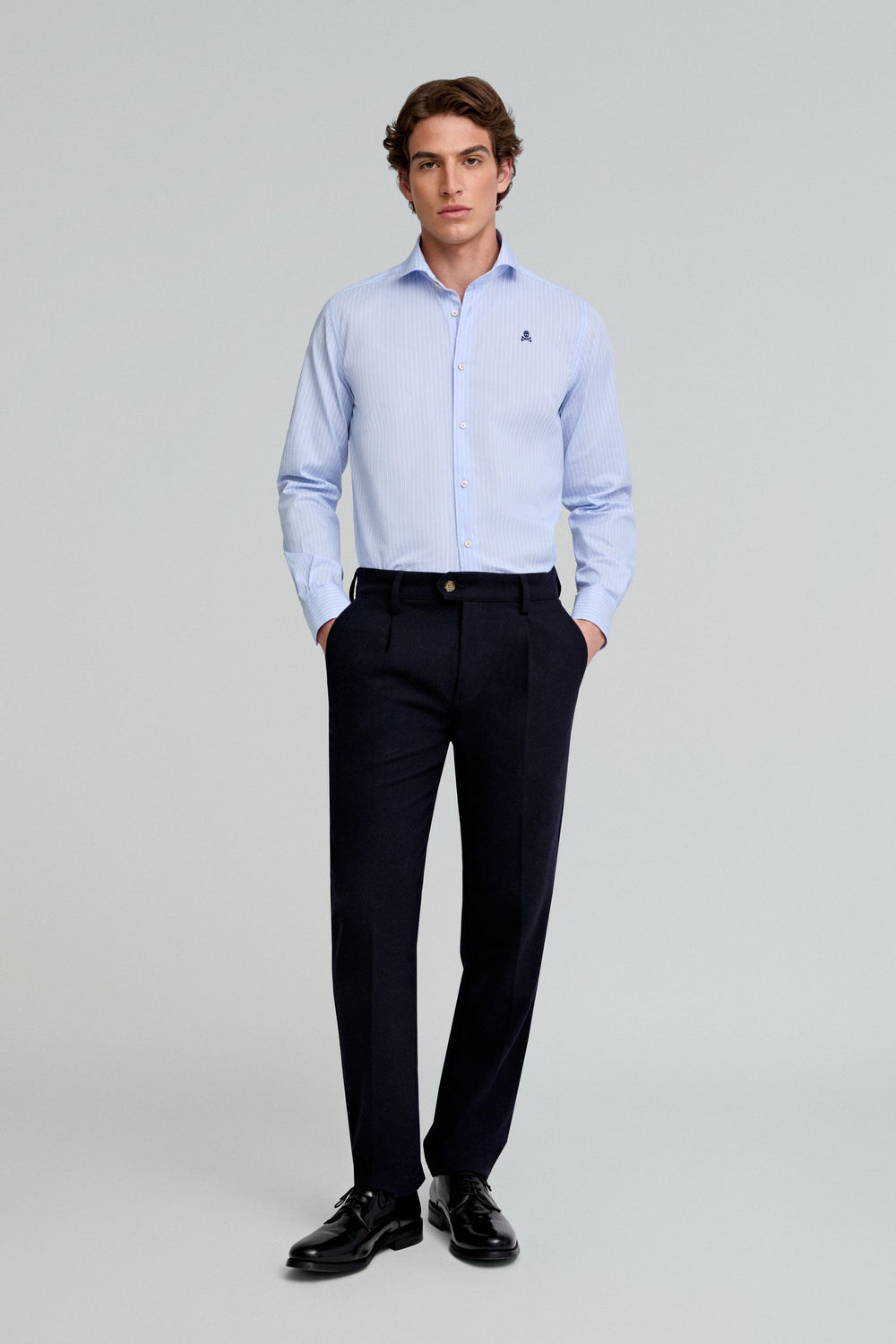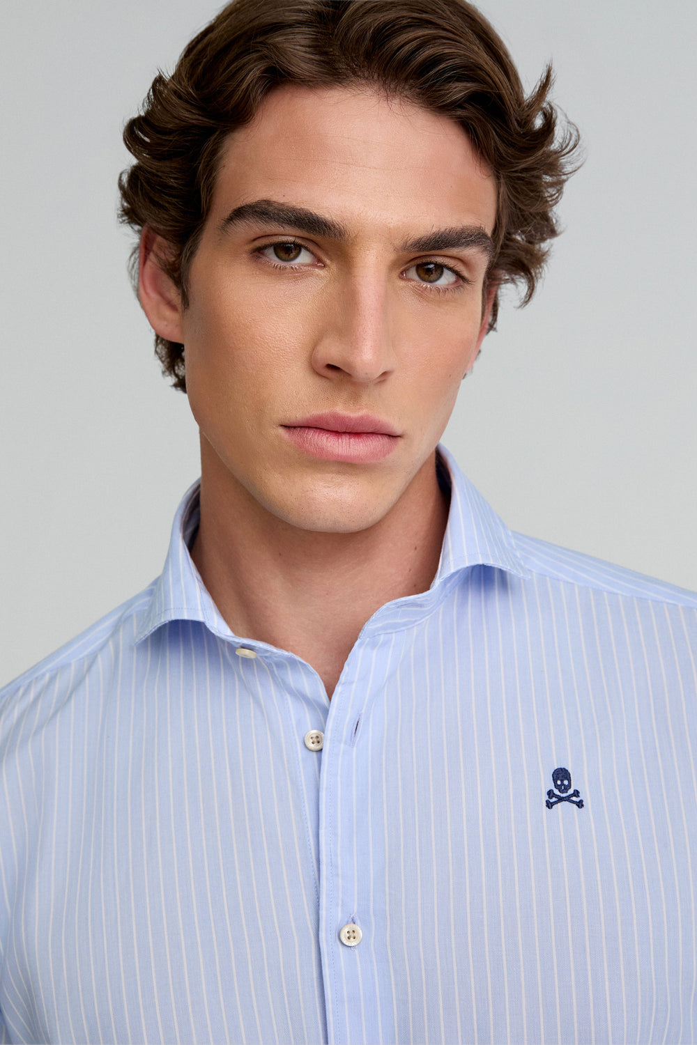 Striped dress shirt. Made of 100% cotton. Regular fit. Cutaway collar. Button fastening. Long sleeves with barrel cuffs. Embroidered skull detail on the chest.