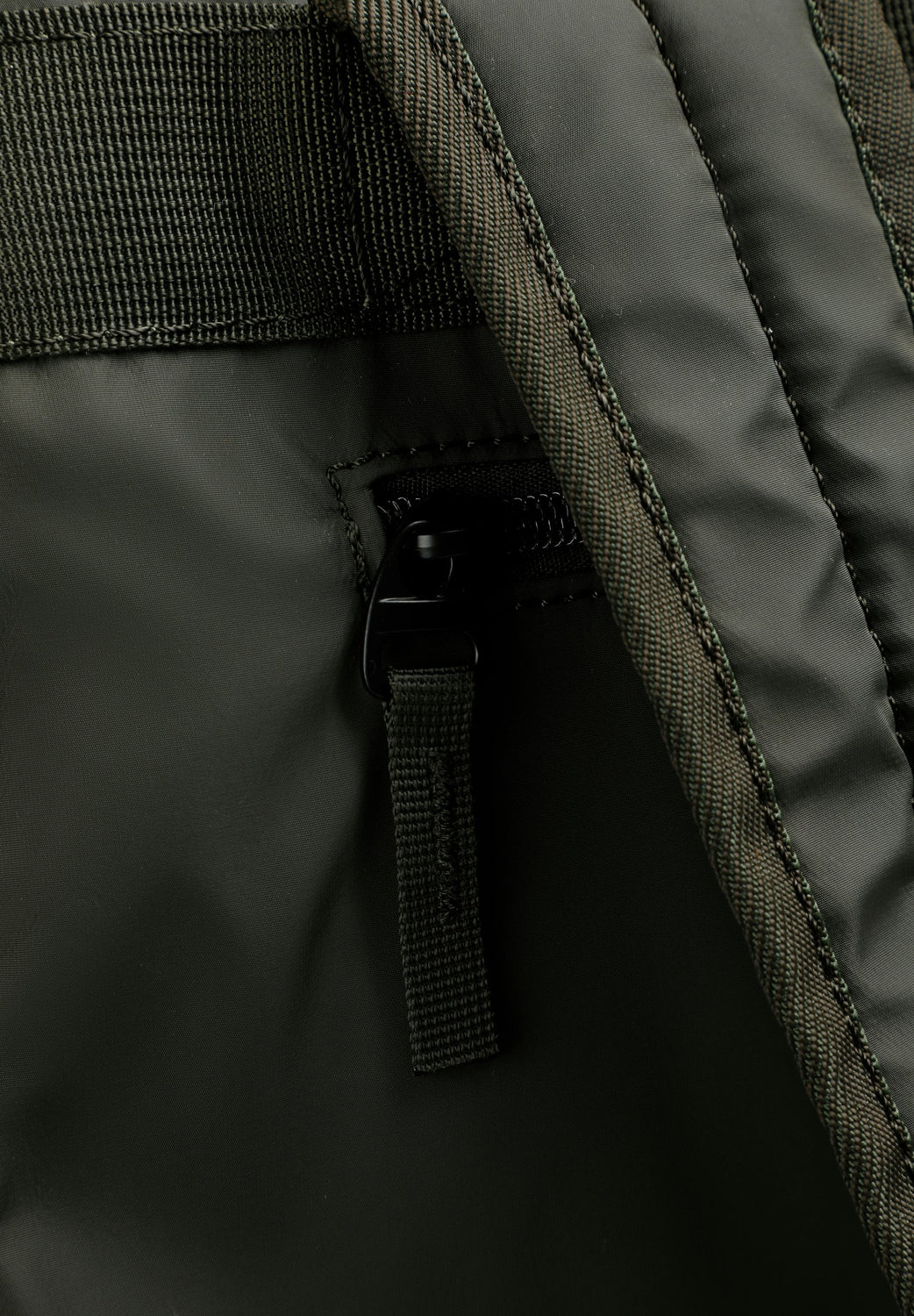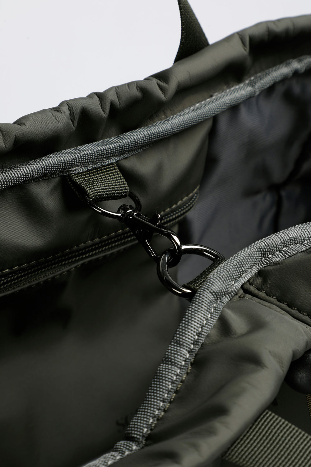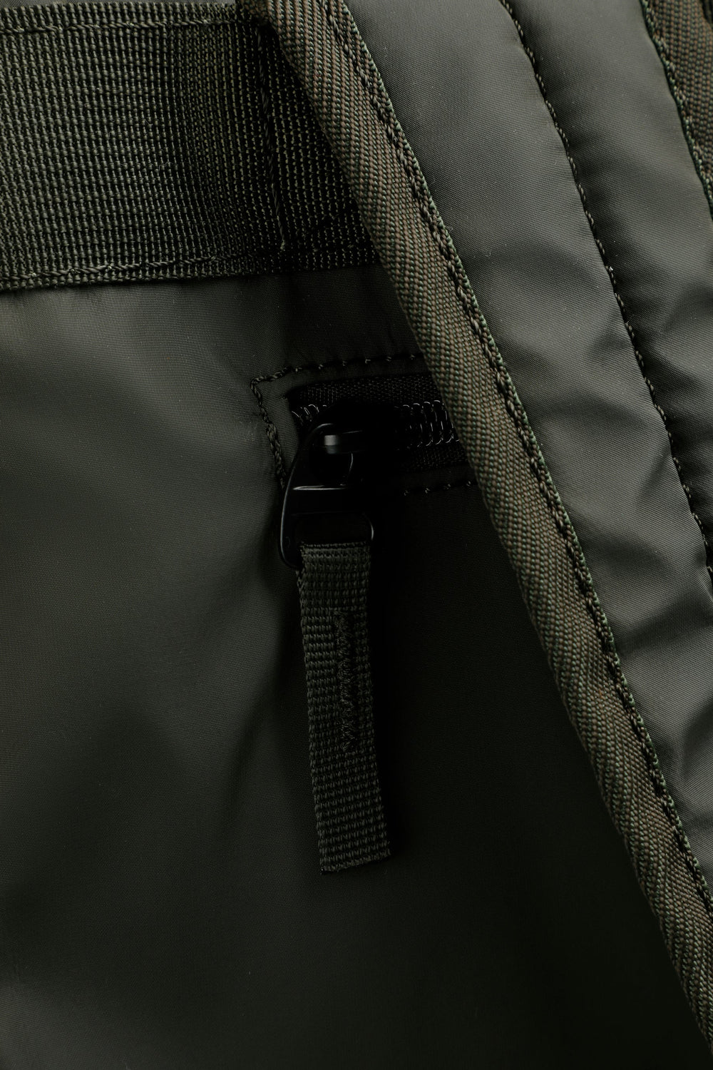 Backpack-style bag in technical fabric, hook closure, top handles and external pockets. Matching logo on the front.