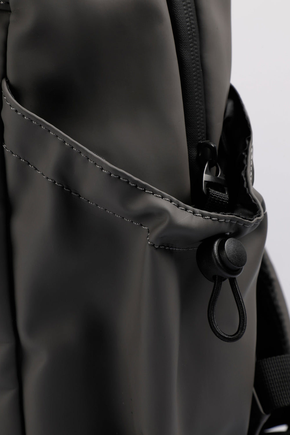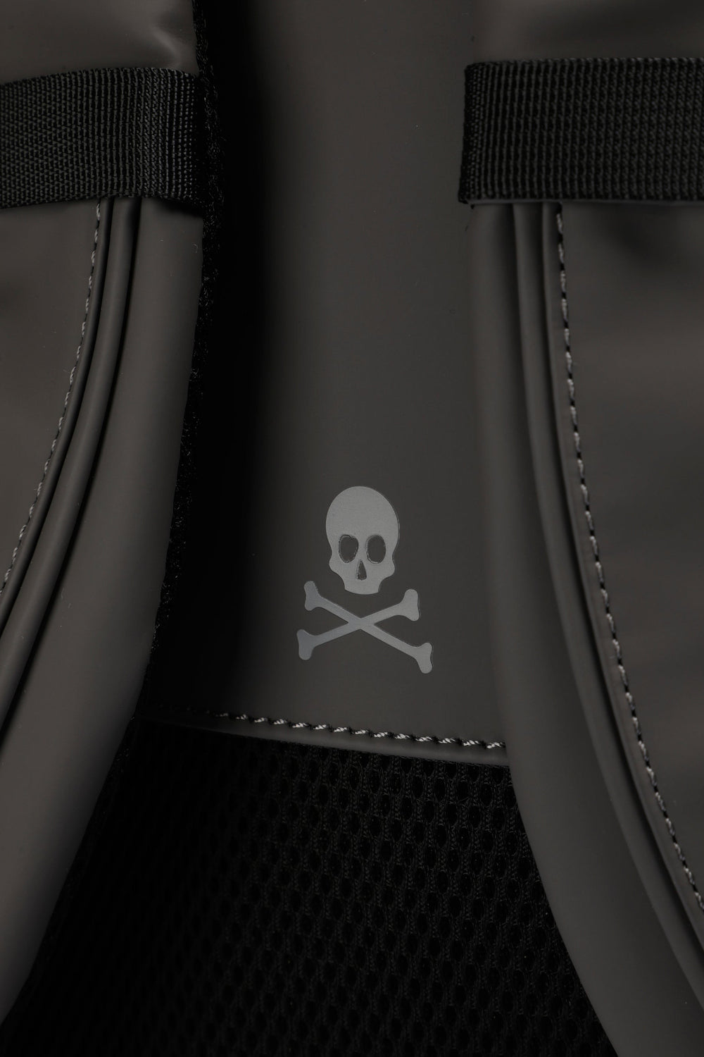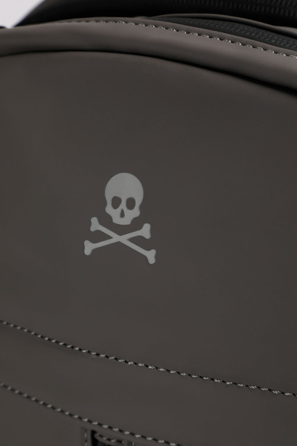 Backpack made of a technical fabric. Double exterior front pocket. Adjustable buckle fastening. Skull detail on front and back print. Top handle. Side and back fastening adjustments. Padded reinforced back.