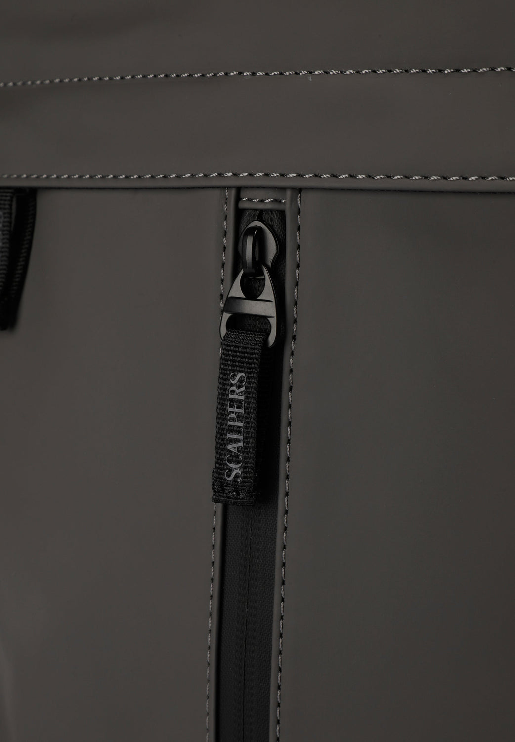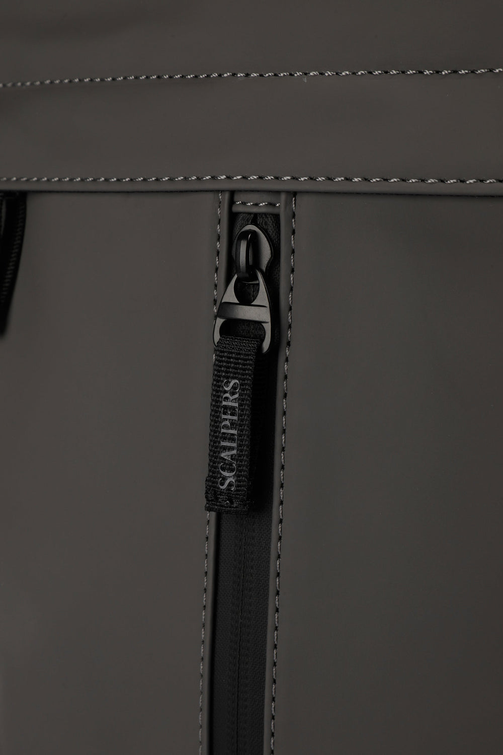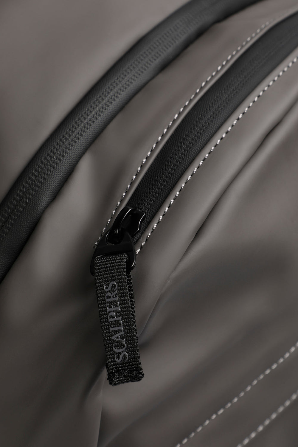 Backpack made of a technical fabric. Double exterior front pocket. Adjustable buckle fastening. Skull detail on front and back print. Top handle. Side and back fastening adjustments. Padded reinforced back.