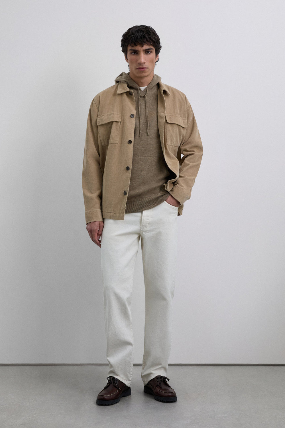 Sweater made of 100% wool. Adjustable drawstring hood. Long sleeves. Pouch pocket on the front. Ribbed cuffs and waistband.