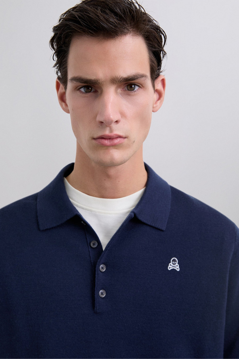 Polo shirt sweater made of a wool blend. Regular fit. Long sleeves. Contrast logo patch on the chest.
