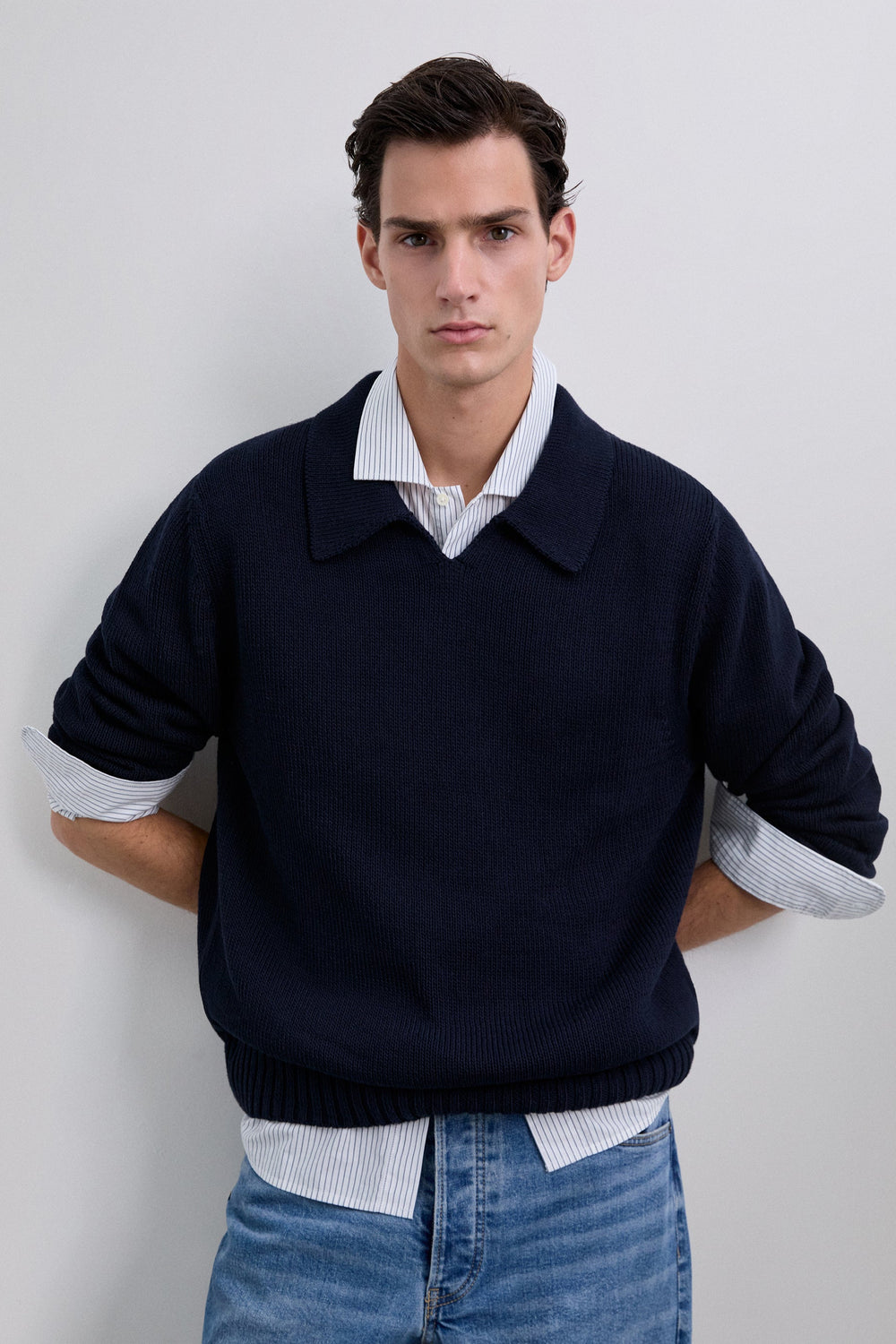 Knit sweater made of 100% BCI cotton. Polo shirt-style collar. Long sleeves. Ribbed trim.