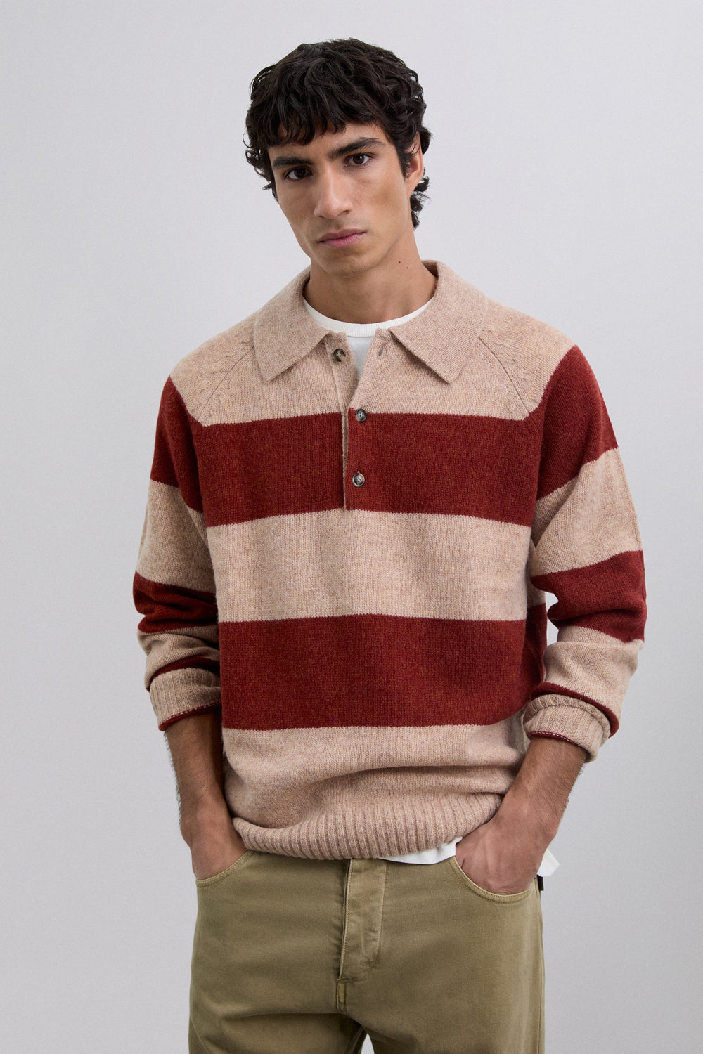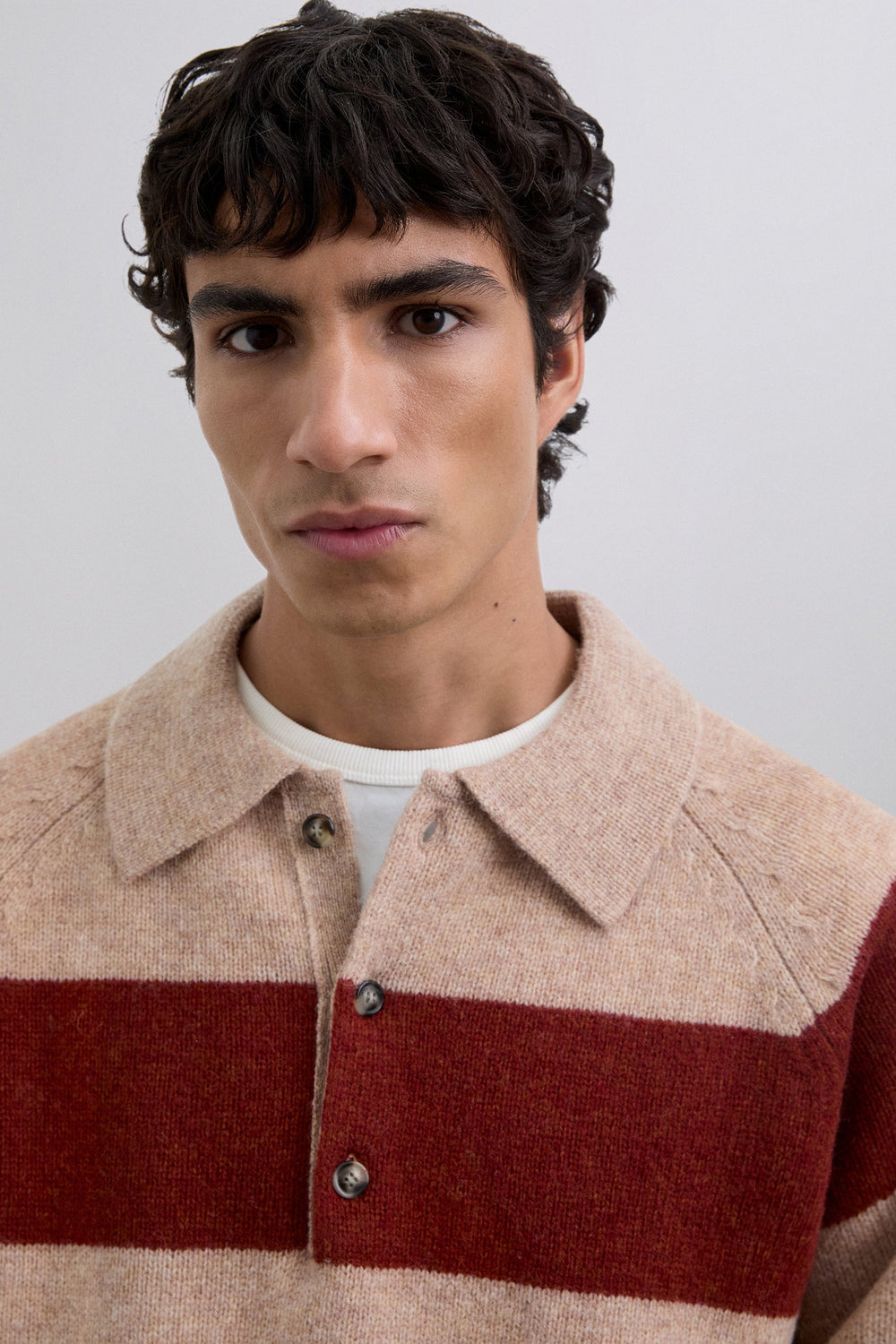 Sweater made of 100% wool. Polo shirt collar with buttons. Stripe print. Long sleeves. Regular fit.