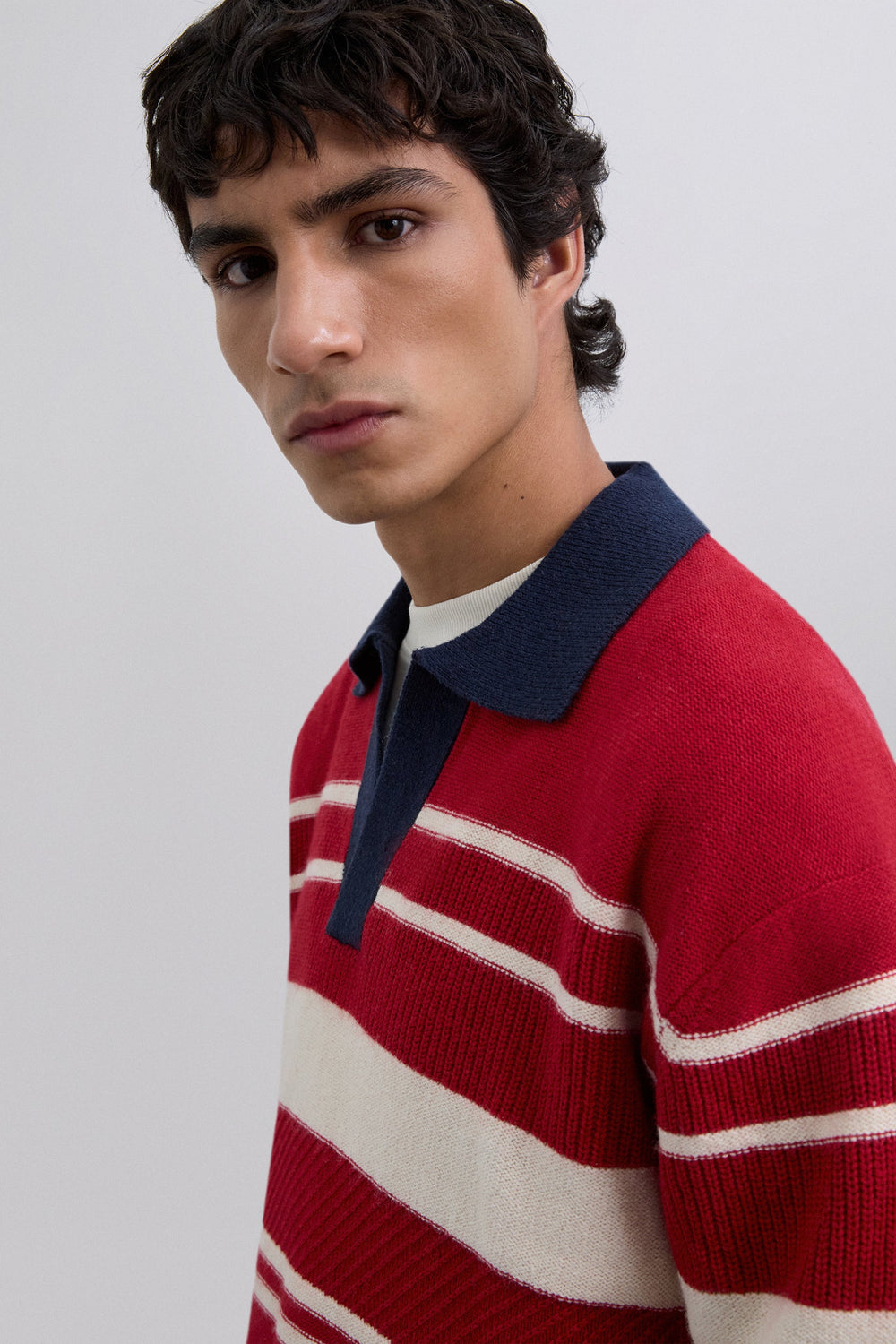 Wool and BCI cotton sweater. Regular Fit. Stripe print. Contrast polo shirt collar. Long sleeves. Ribbed trim.