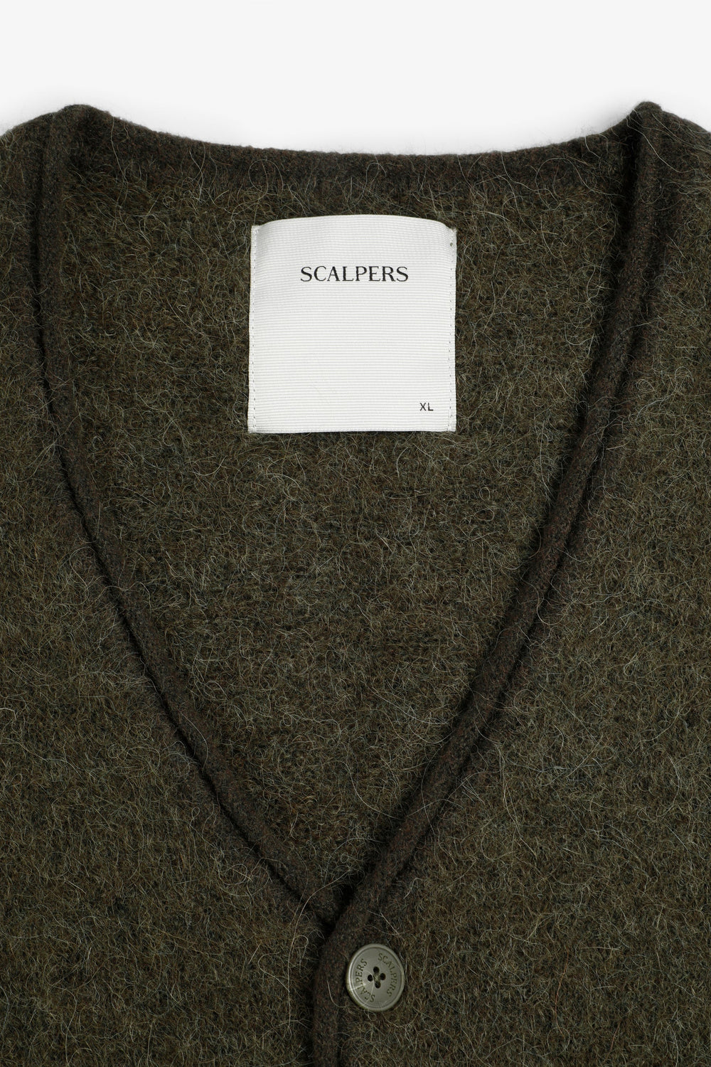 Alpaca cardigan. V-neck. Long sleeves. Front button fastening. Two front pockets. Logo label detail on inside.