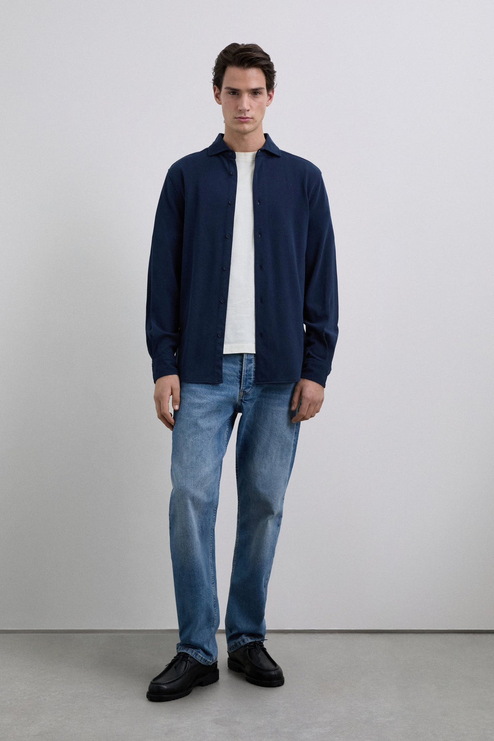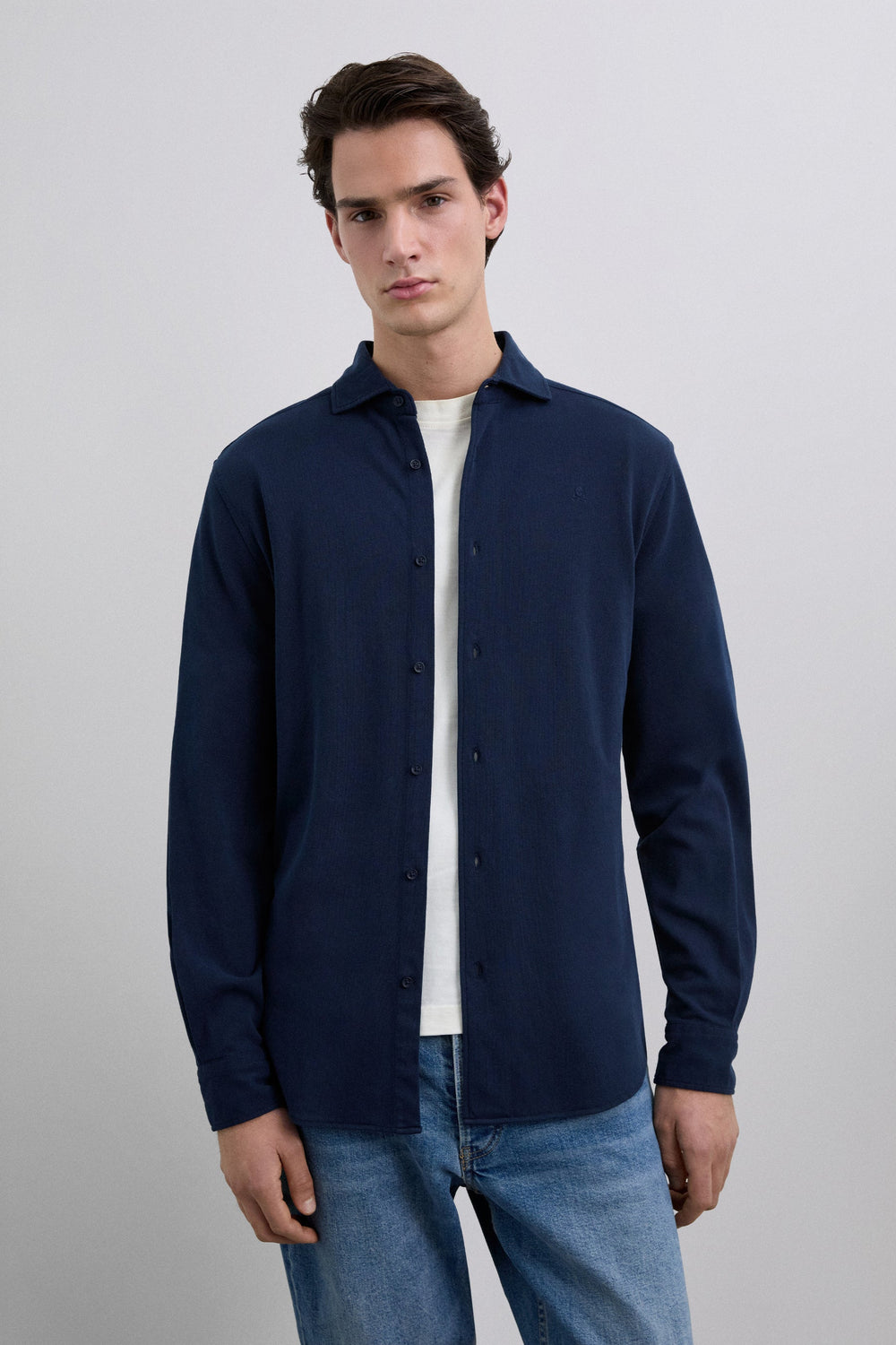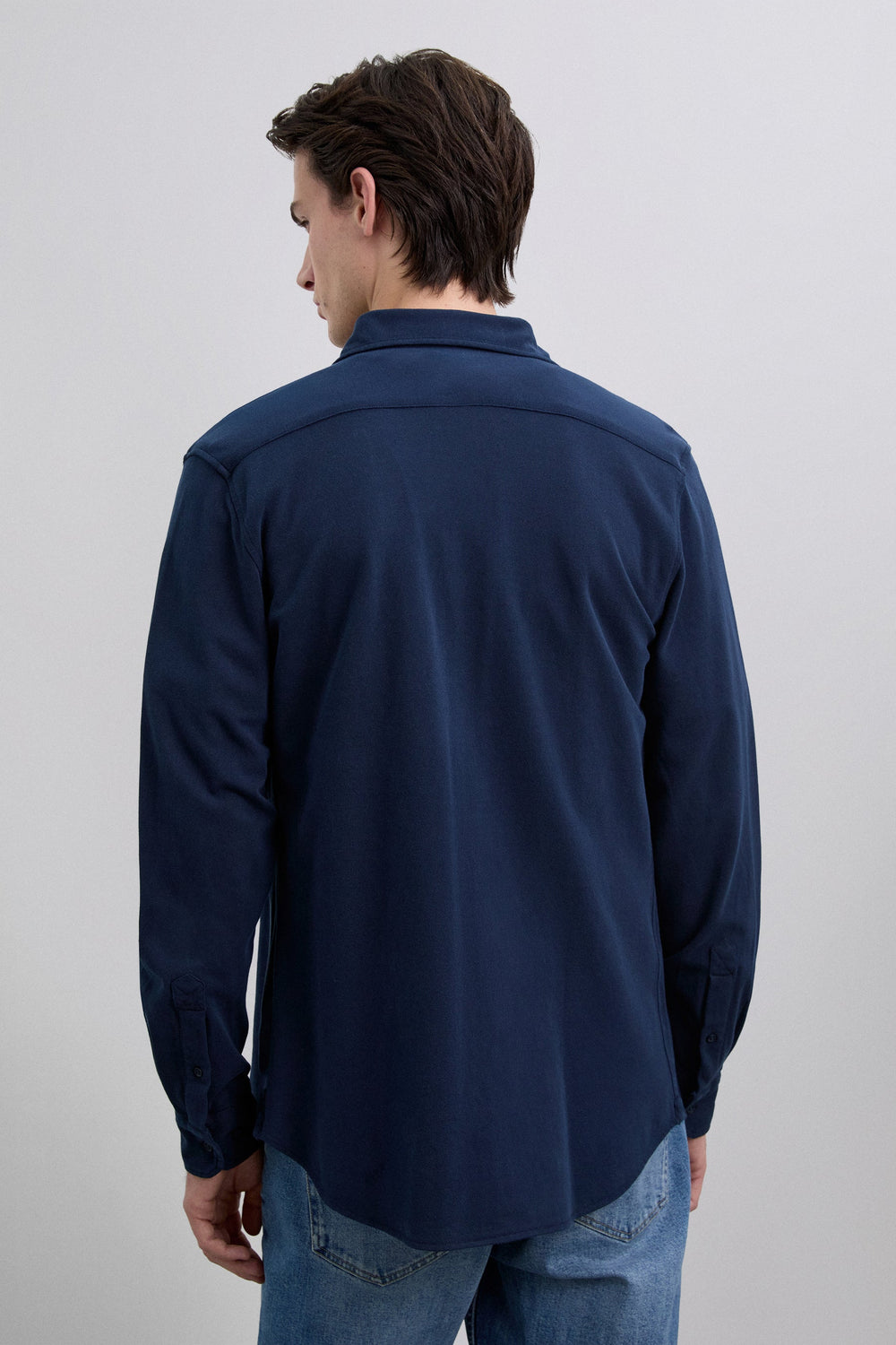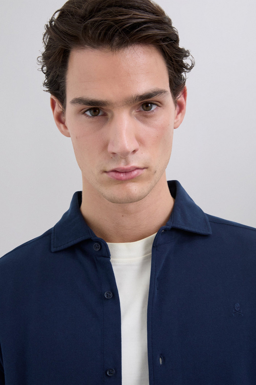 Piqué knit shirt made of 100% BCI cotton. Regular fit. Front button fastening. Long sleeves with buttoned cuffs. Matching embroidered skull on the chest.