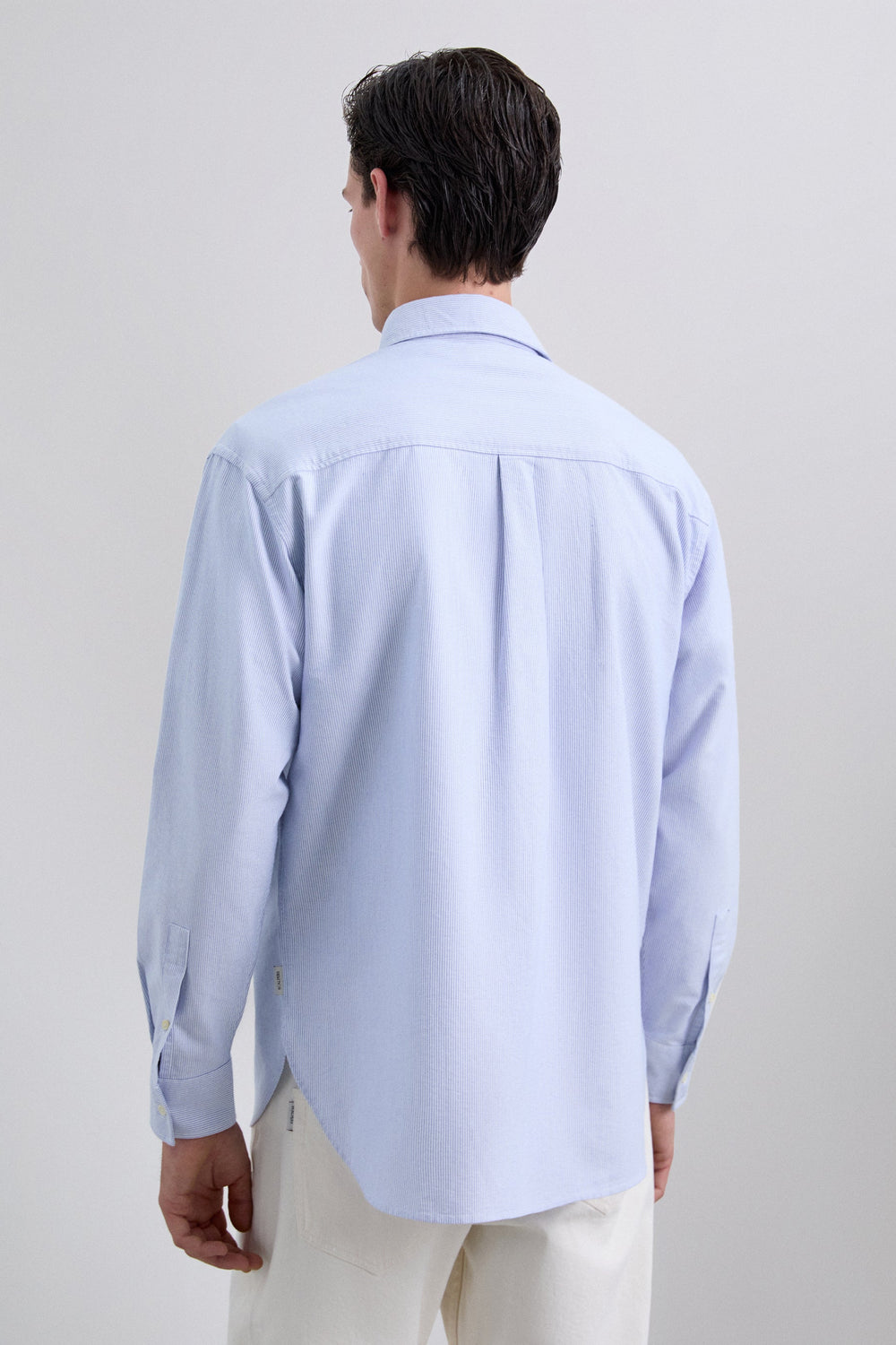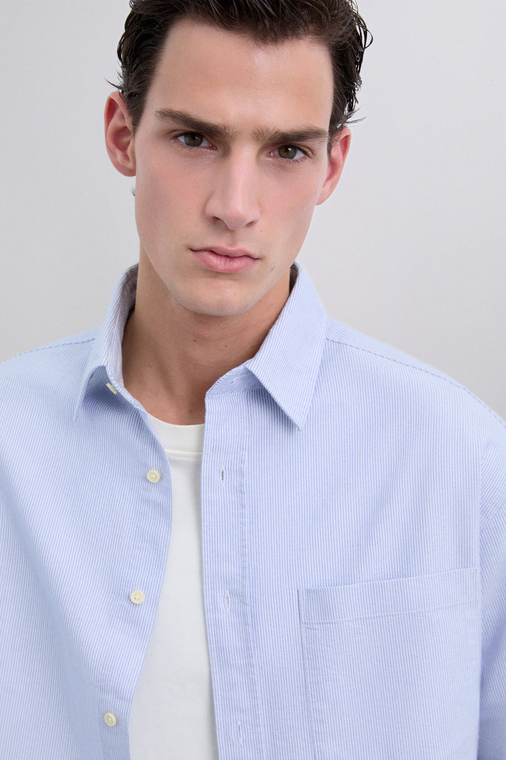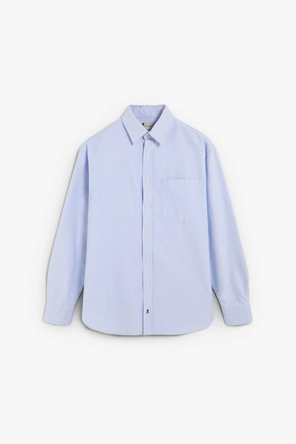 Shirt made of 100% BCI cotton. Stripe print. Chest pocket detail. Long sleeves. Button fastening at front and cuffs. Contrast embroidered skull detail on the lower front.