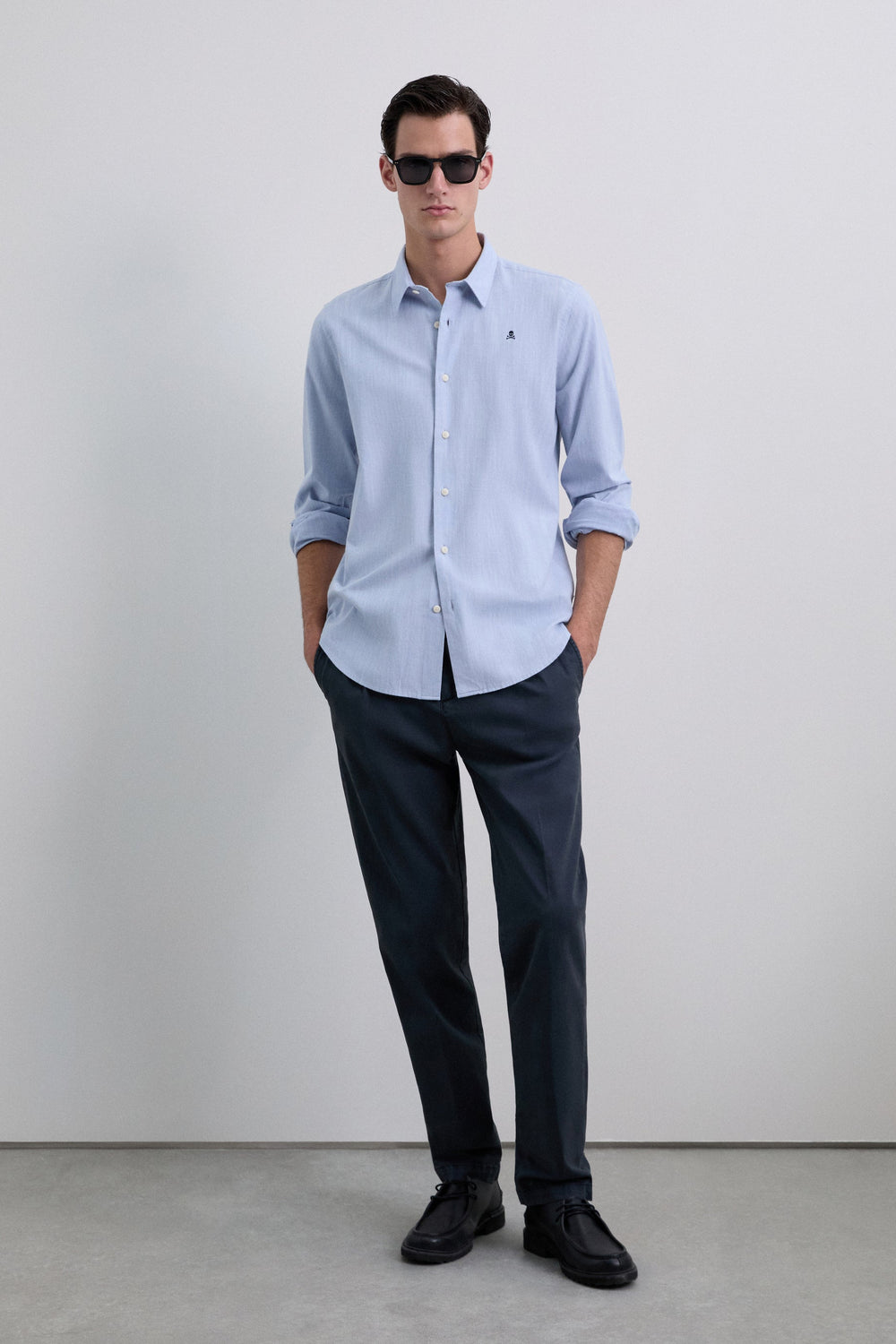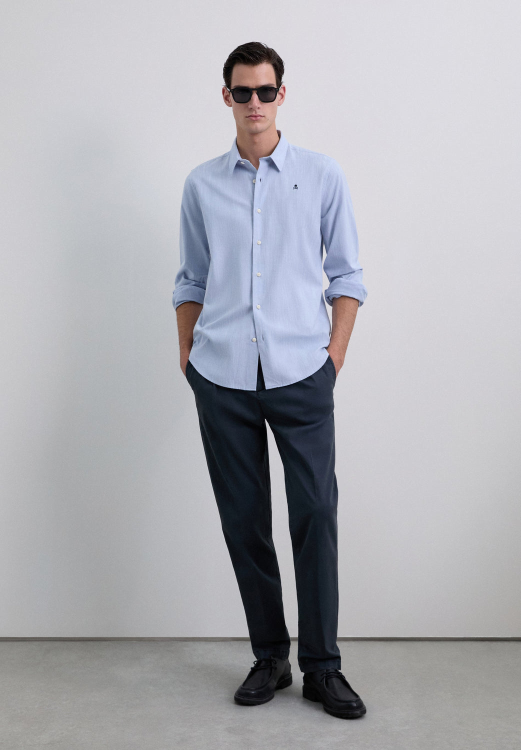 Shirt made of 100% BCI cotton. Regular Fit. Long sleeves. Italian collar. Button fastening at front and cuffs. Contrast embroidered skull detail on the chest.