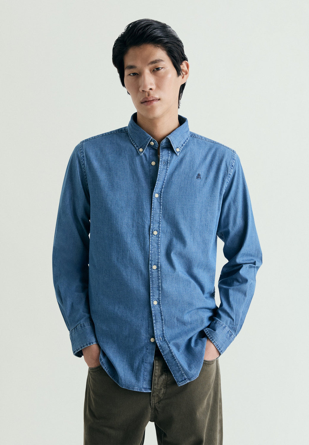 Denim shirt made of cotton. Regular fit. Buttoned collar. Long sleeves. Contrast embroidered skull on the chest.