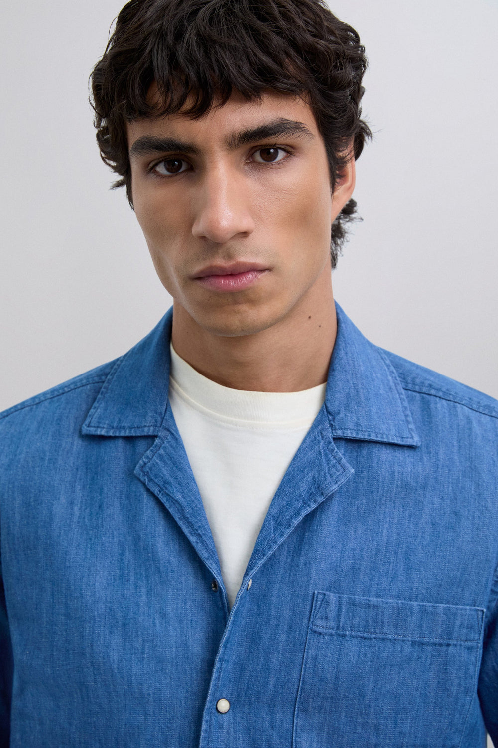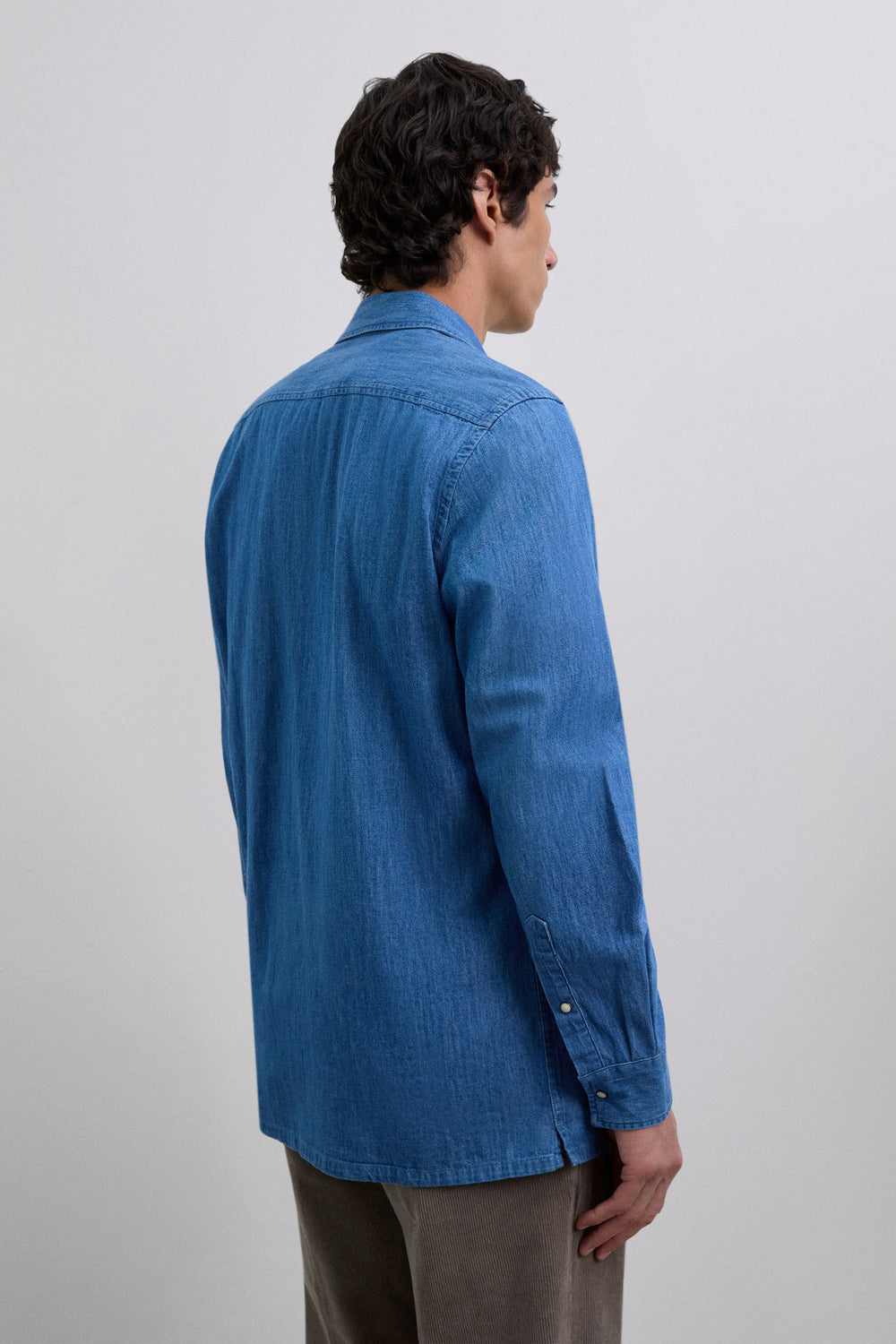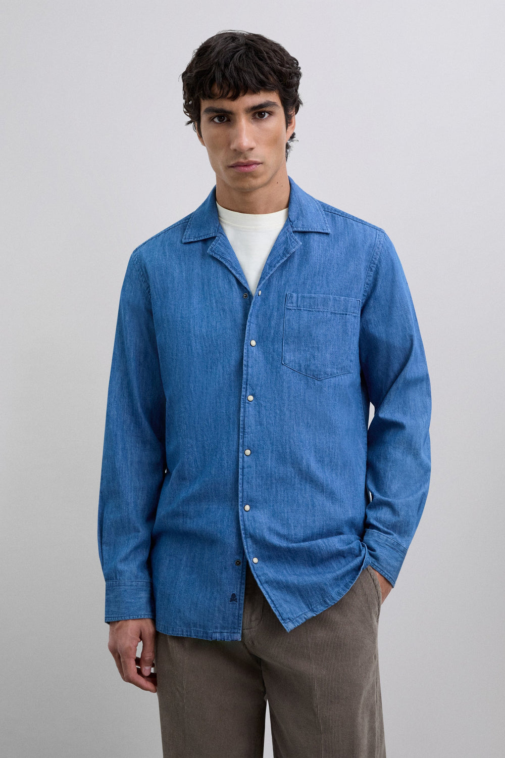 Denim shirt made of 100% BCI cotton. Regular fit. Shirt collar. Button-up front. Long sleeves. Buttoned cuffs. Chest pocket. Embroidered logo detail on the placket.