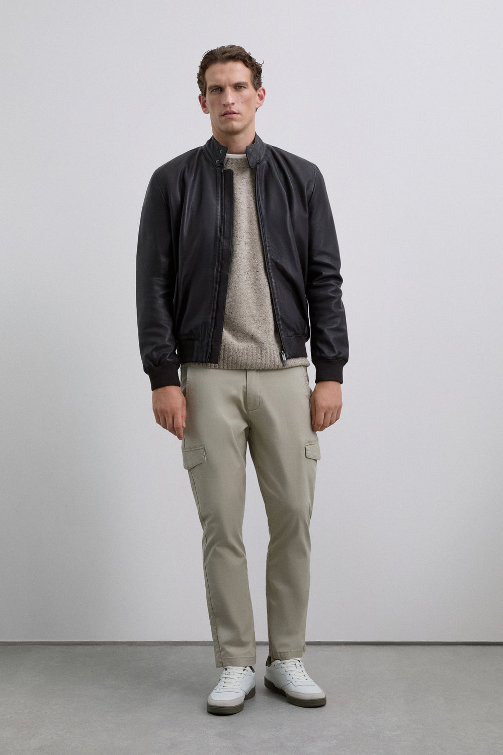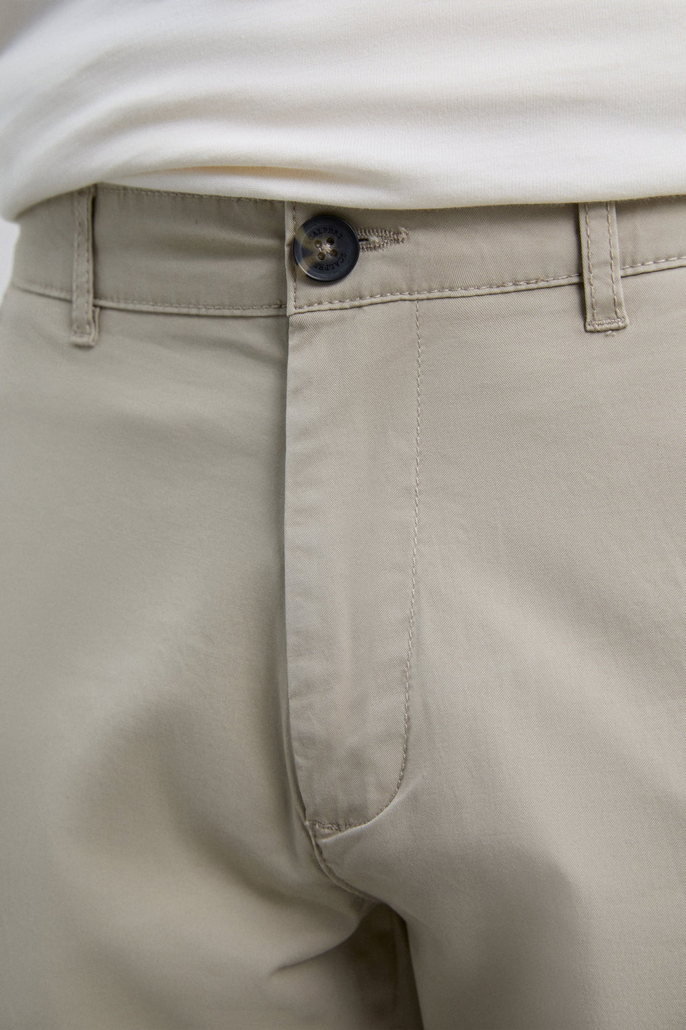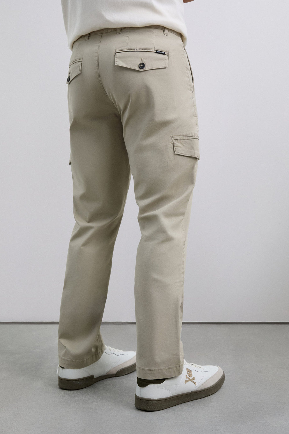 Cargo trousers made of BCI cotton. Slim fit. Two front pockets, back pockets with button fastening and side flap pockets. Belt loops and button and zip fastening. Embroidered logo on the back pocket.