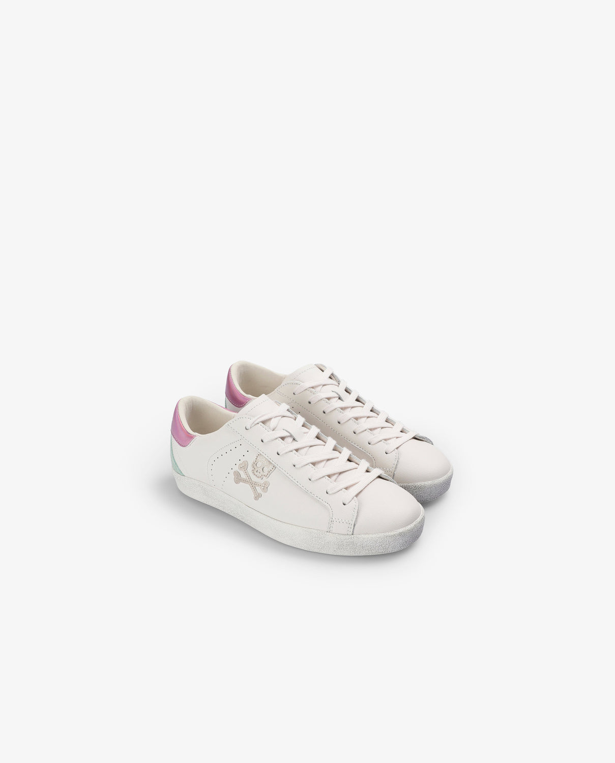 Sneakers with contrast side skull. Worn effect rubber sole. Contrasting heel with matching logo. Lace-up fastening.