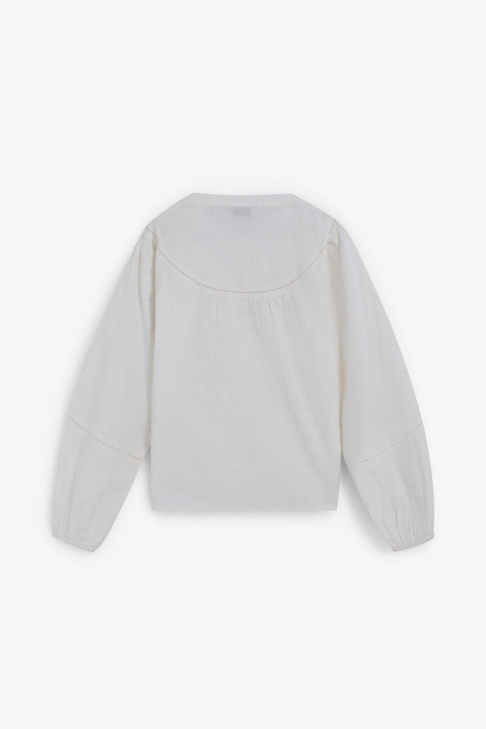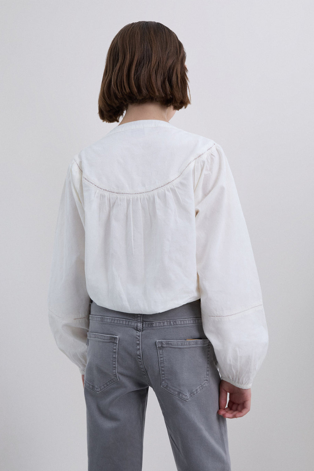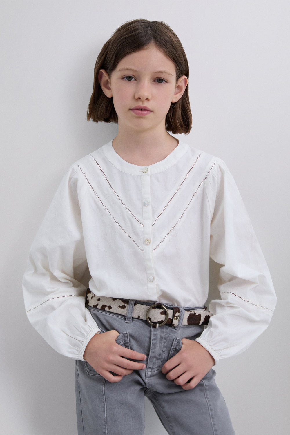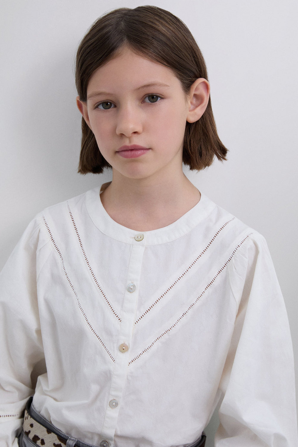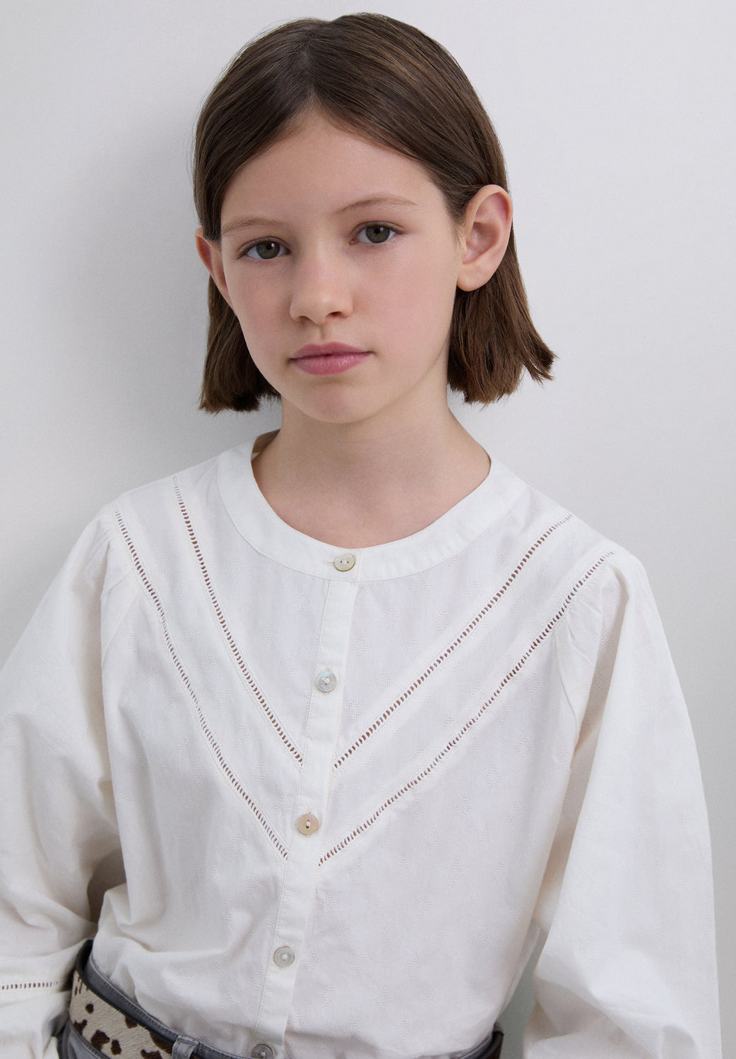Shirt made of 100% cotton. Shirt with round neck and long sleeves with elasticated cuffs. Front button fastening. Peaked die-cut detail.