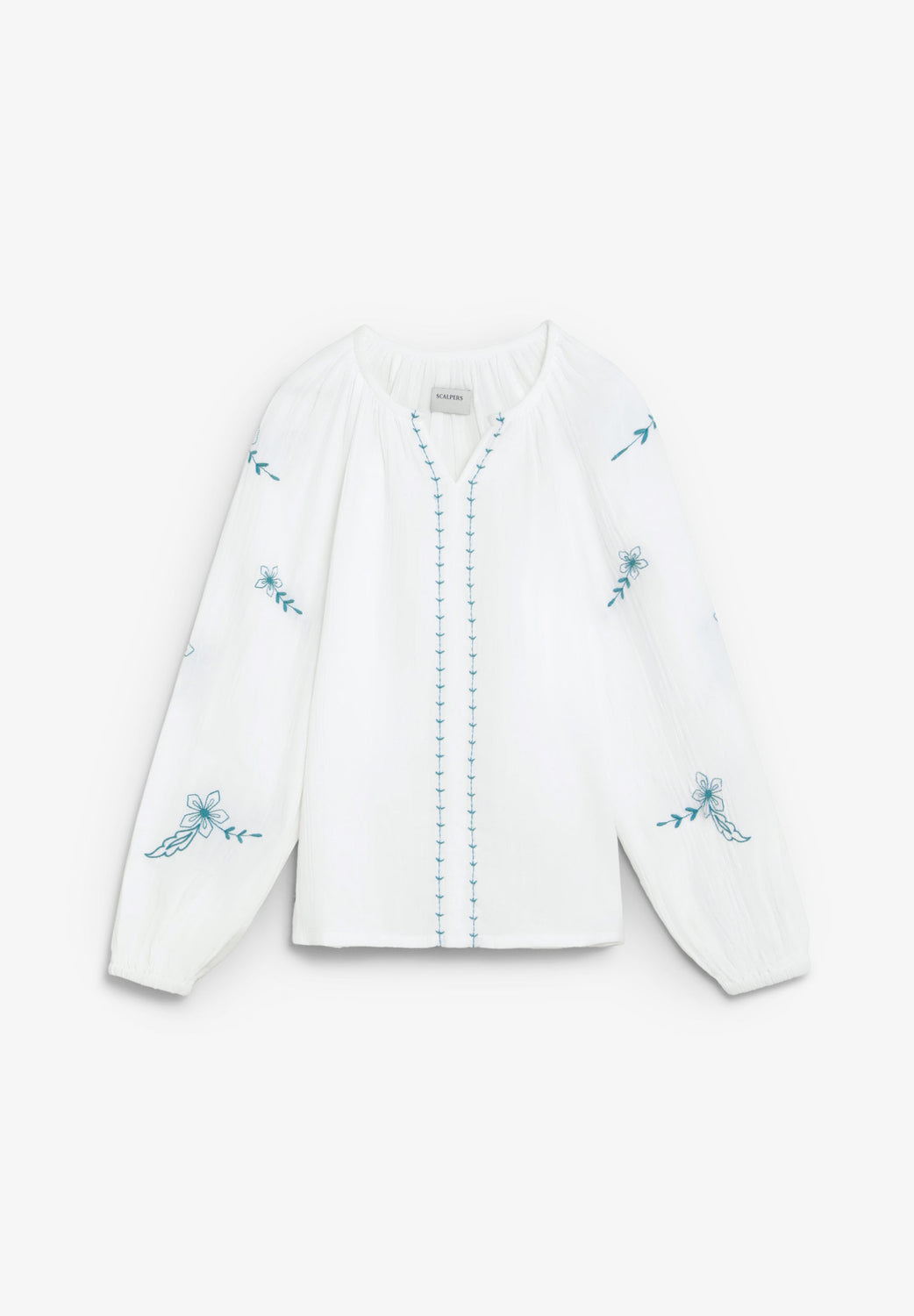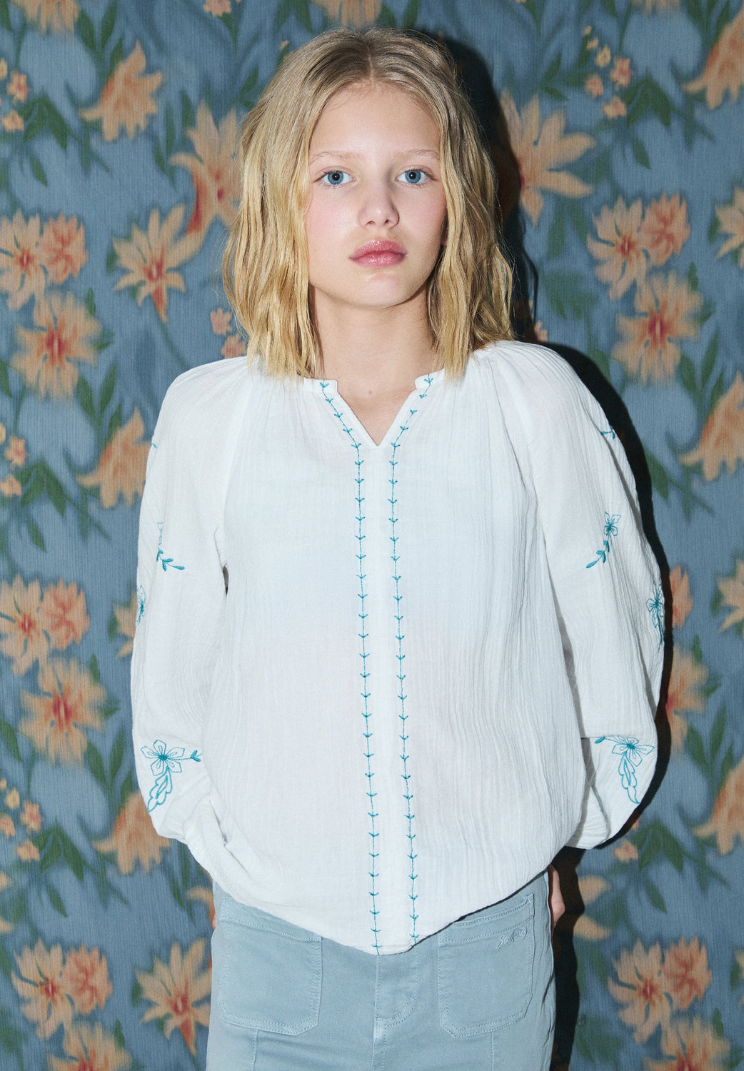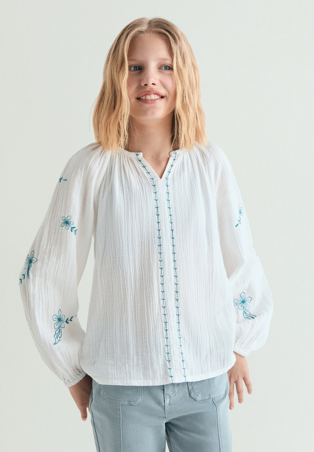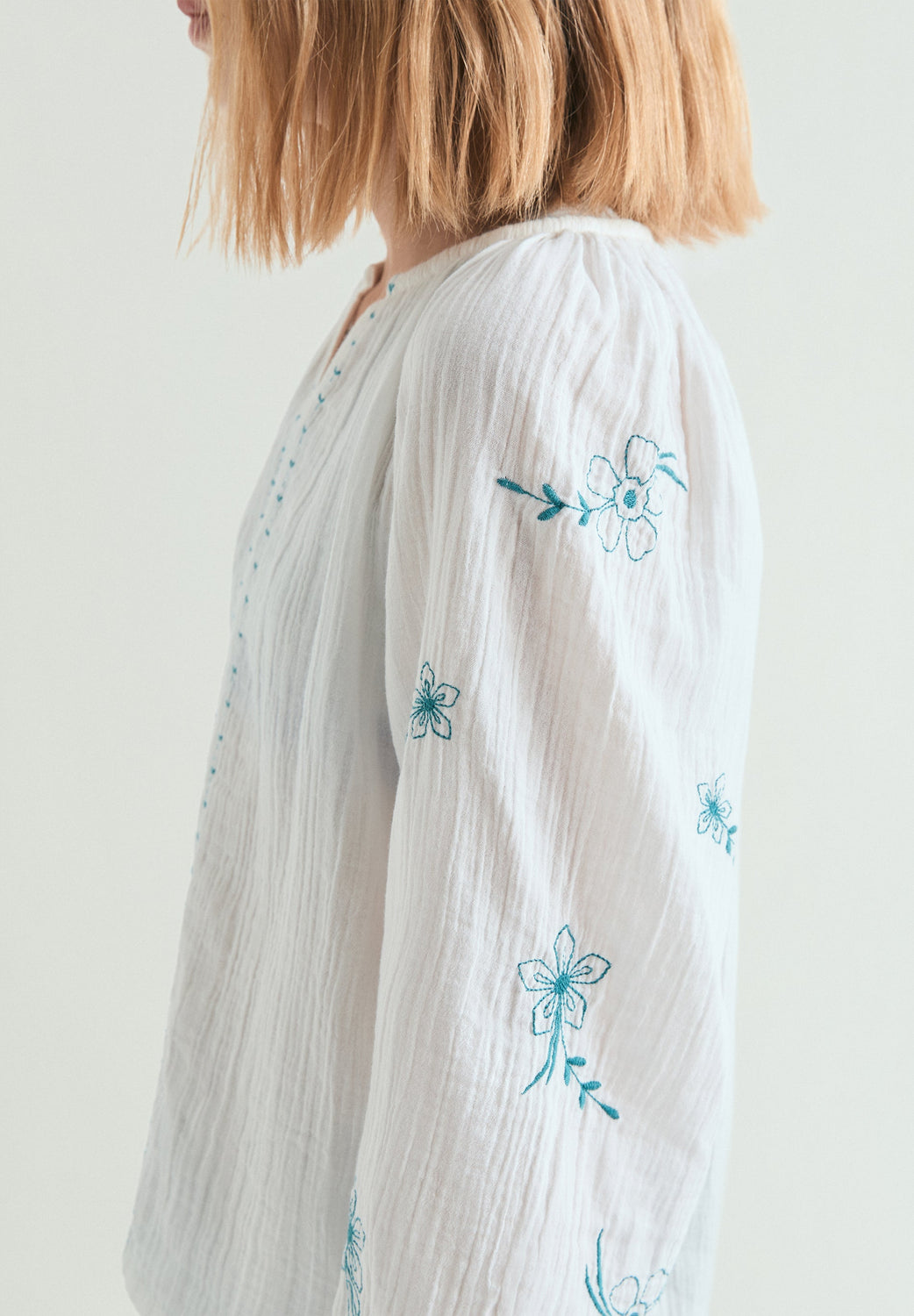 Blouse made of 100% BCI cotton. V-neck and long sleeves with elastic cuffs. Embroidered floral details on sleeves and front.