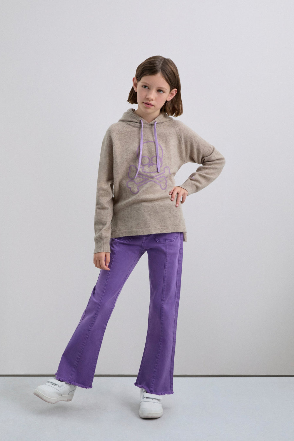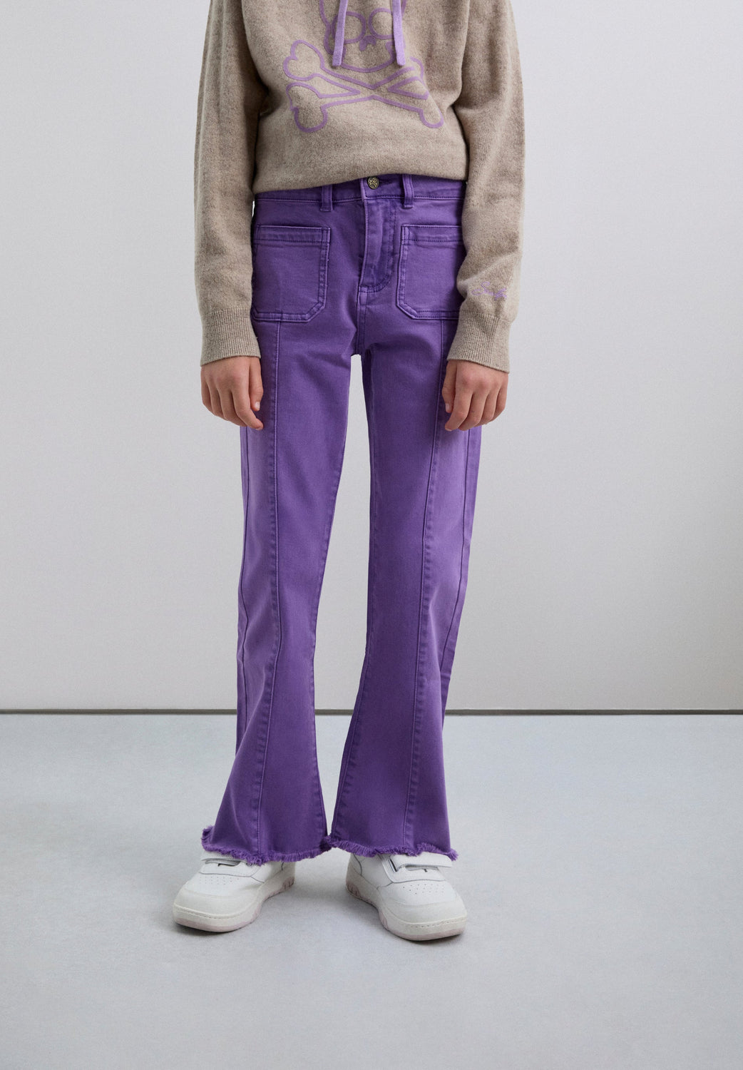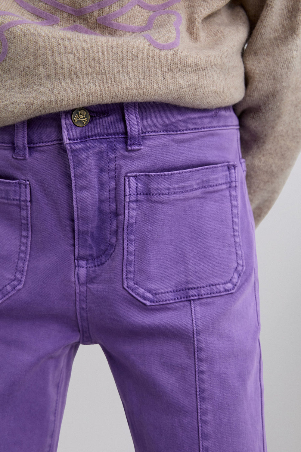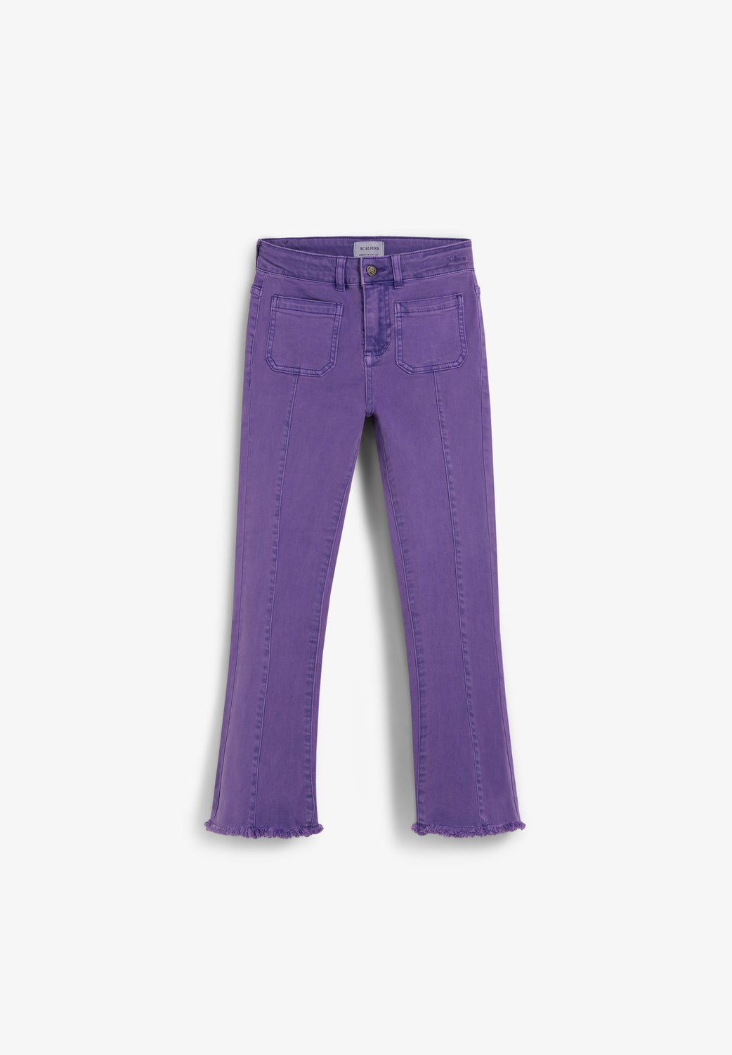Flared trousers made of BCI cotton. Button and zip fastening. Belt loops at the waist. Front and back pockets. Seam detail on the front. Side slit and frayed hems.
