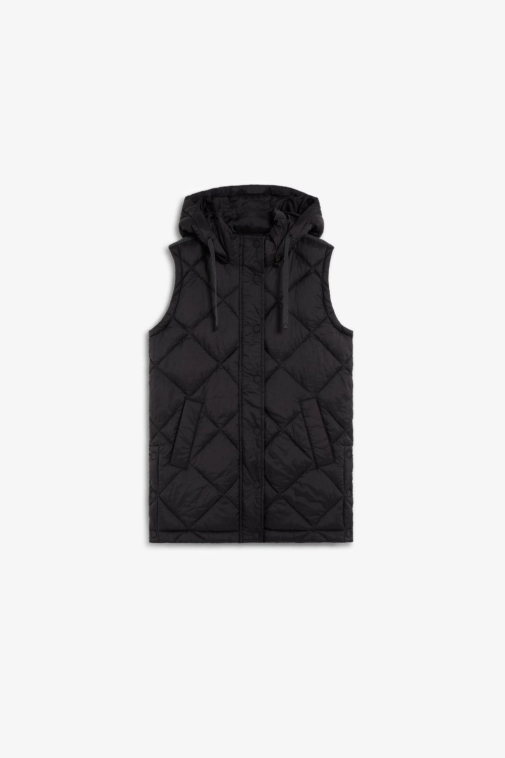 Padded coat. Detachable hood and sleeves. Front zip fastening concealed by placket with press stud fastening. Side pockets. Recycled fleece lining. Logo detail on the back.