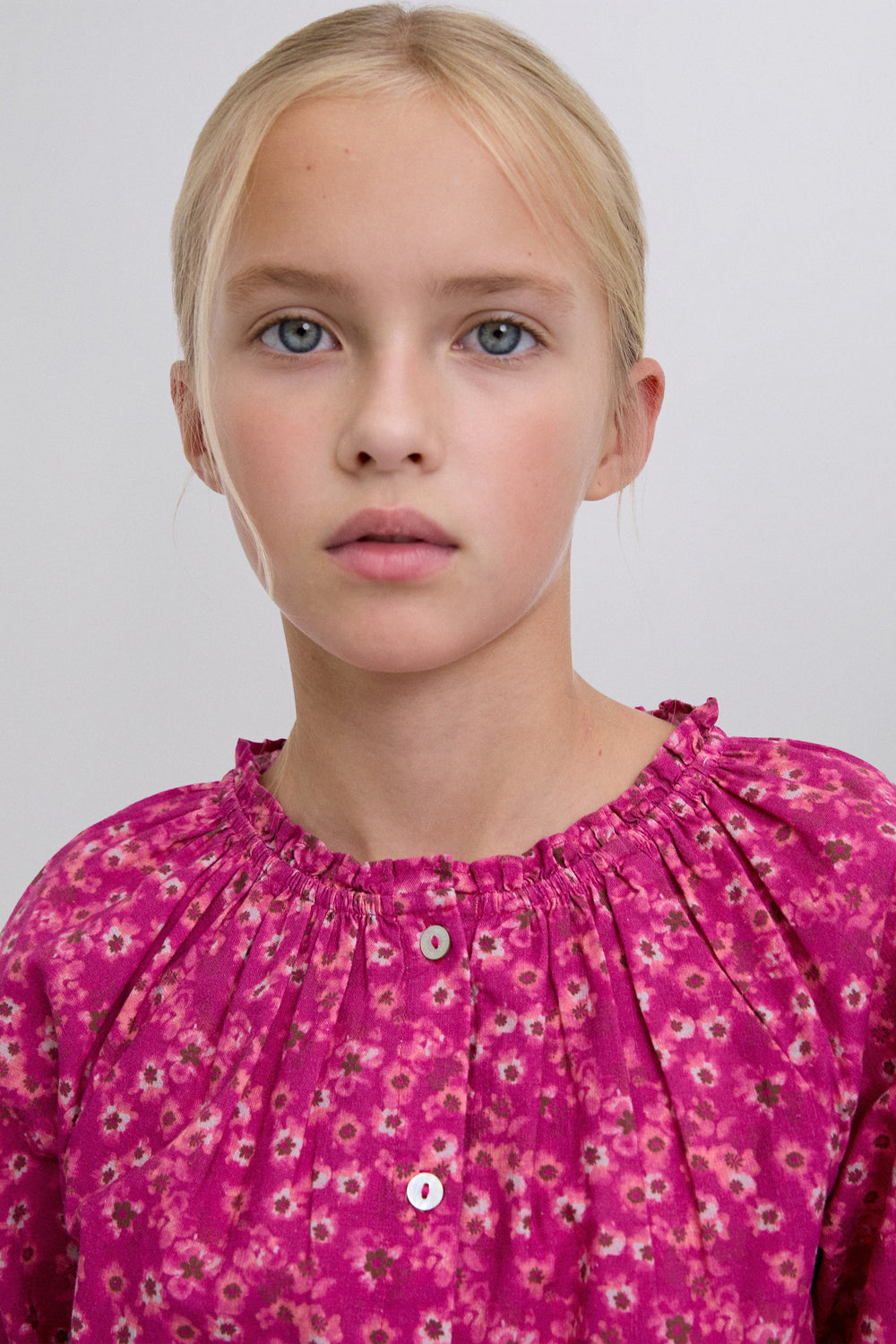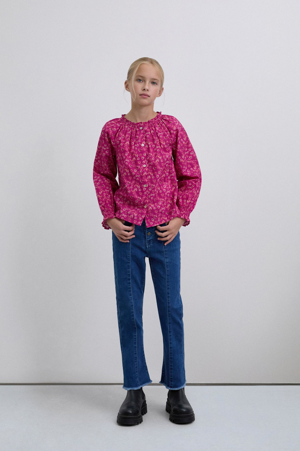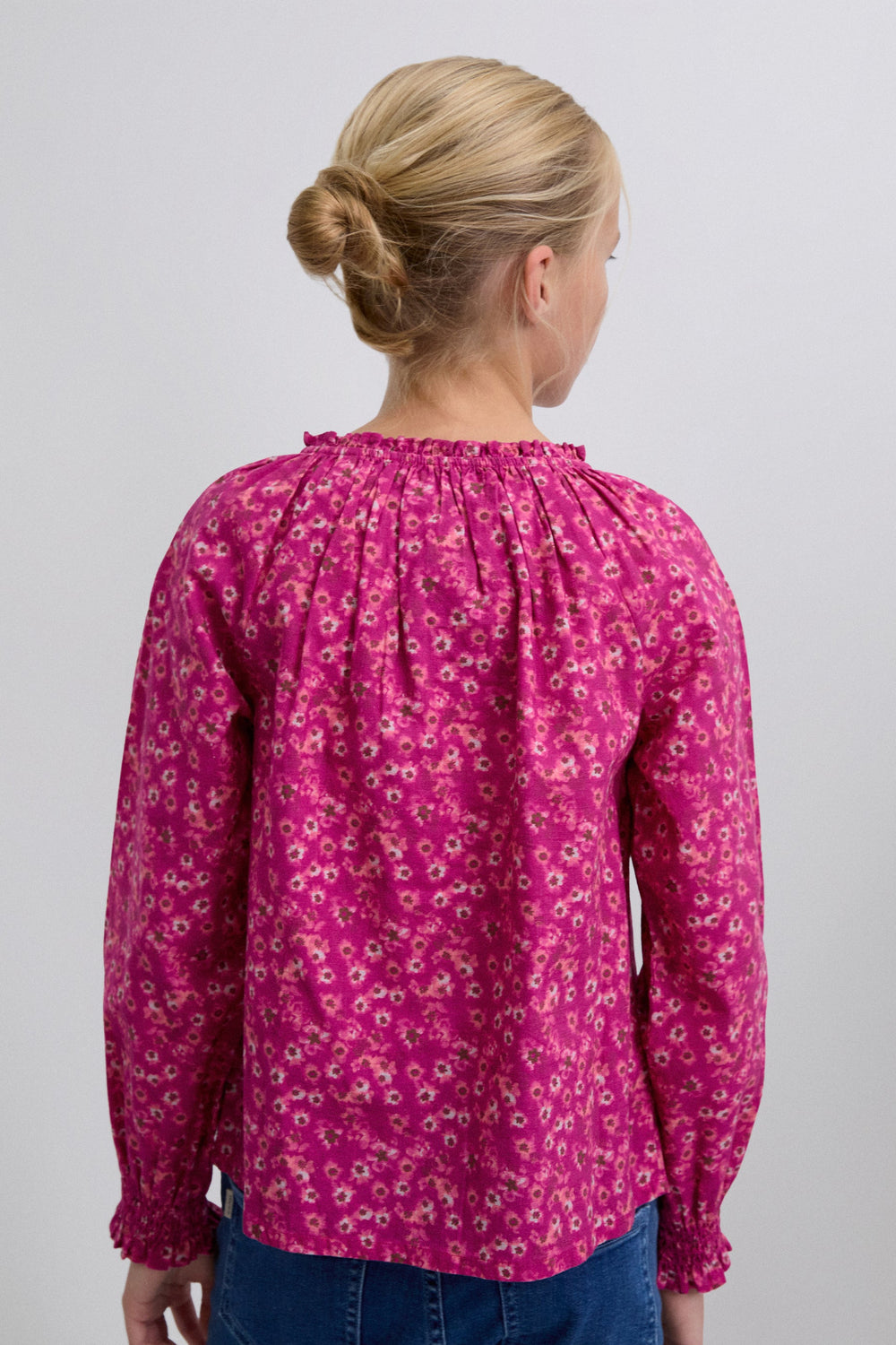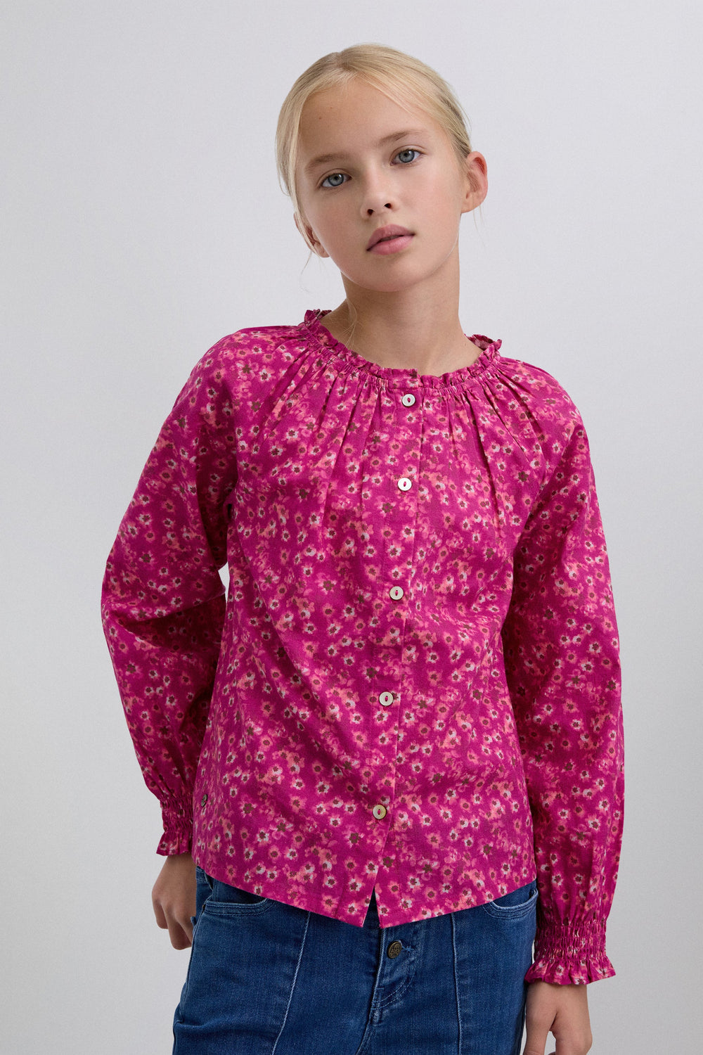 Blouse made of 100% BCI cotton. Regular fit. Round neck. Long puff sleeves with elastic trim. Front button fastening. Floral print.