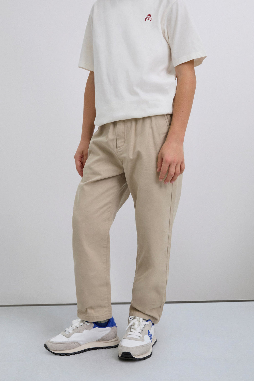 Chino trousers made of 100% BCI cotton. Two front and back pockets. Button fastening and belt loops. Logo label detail on the pocket.