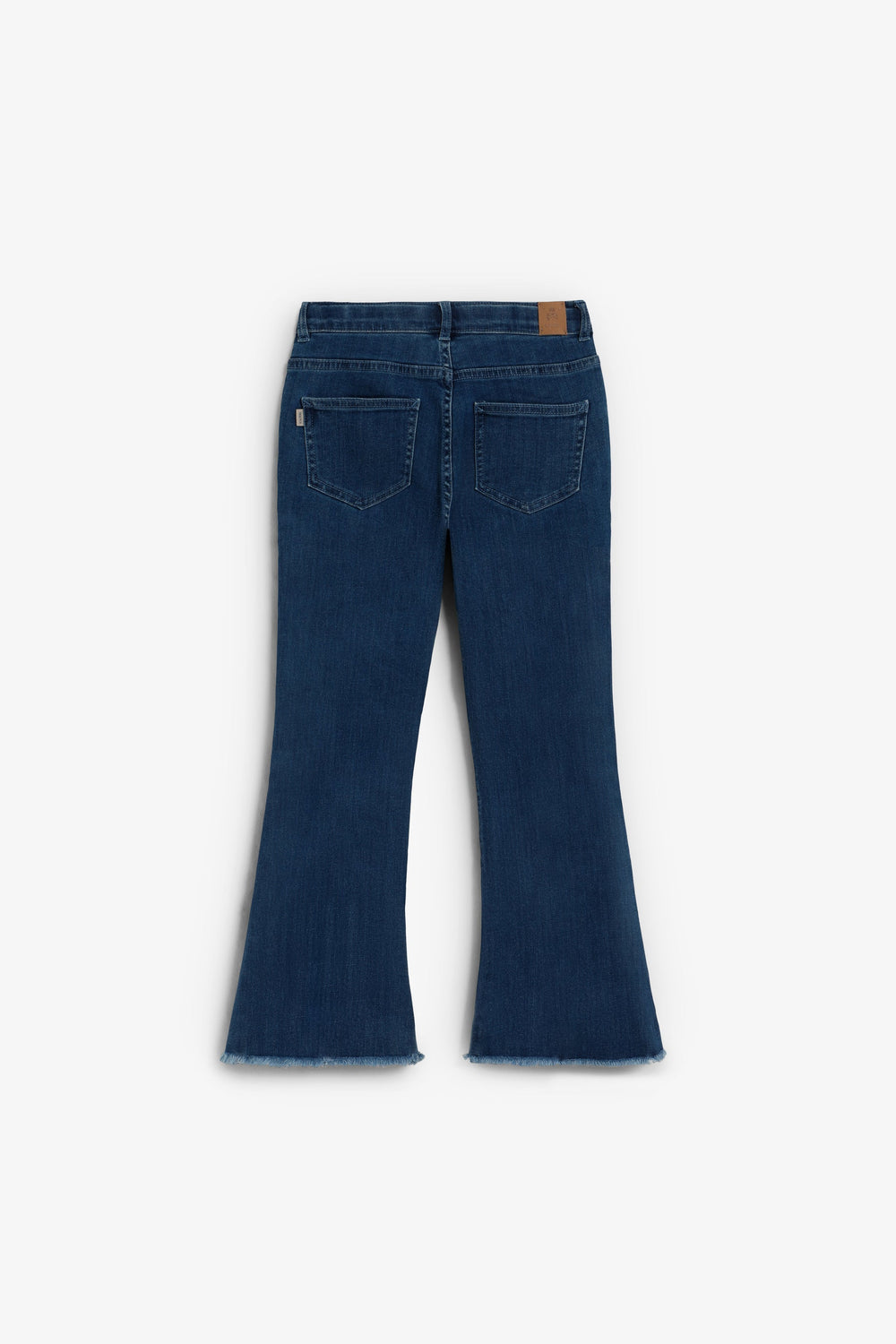 Trousers made of slightly stretchy cotton. Flared. Button fastening with skull logo details. Front pockets and back patch pockets Finished with fringing and front stitching.