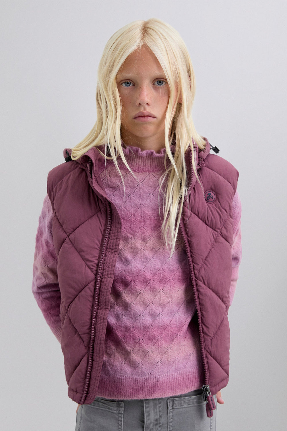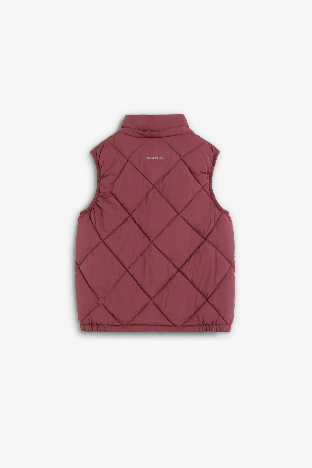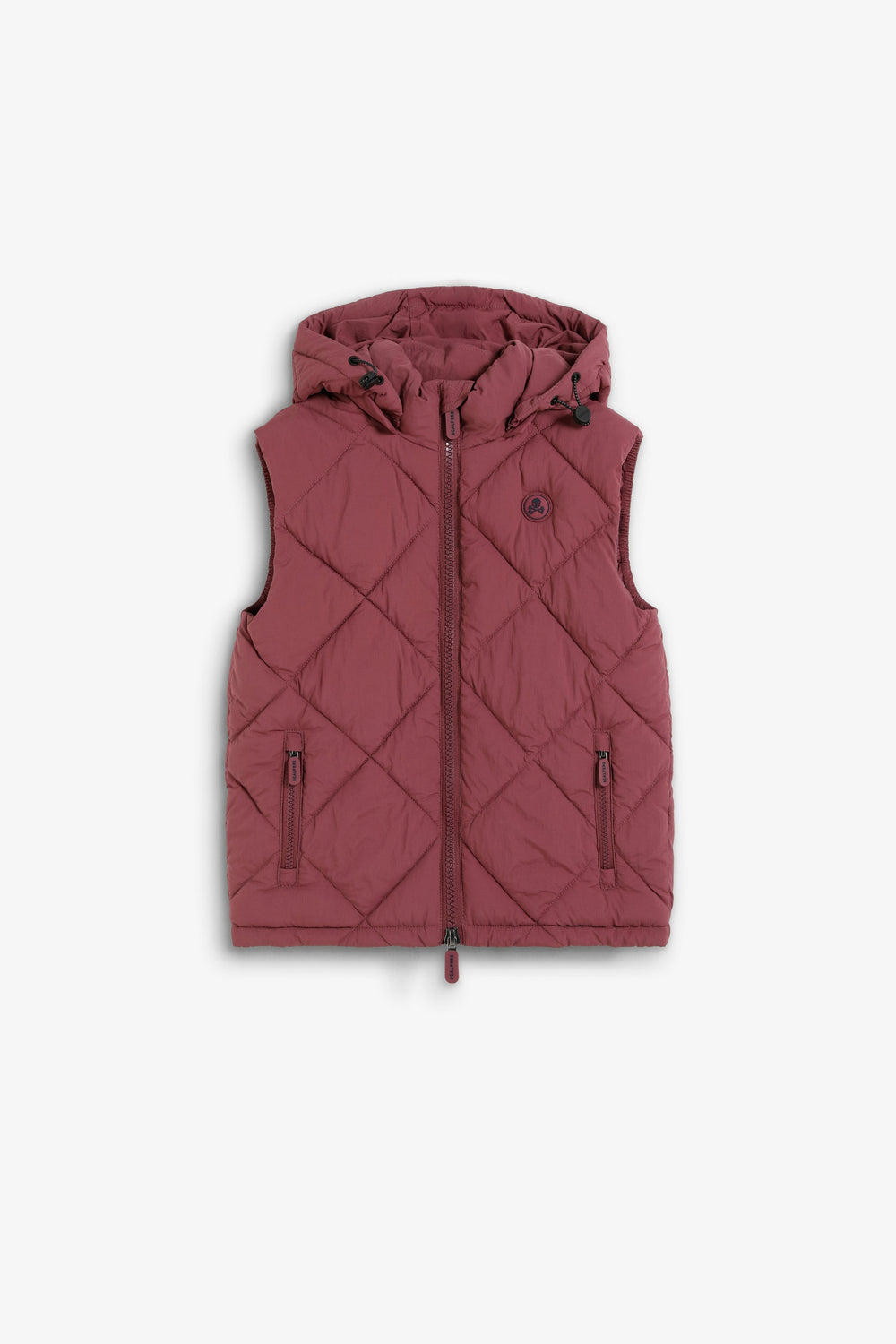 Heavy-duty padded waistcoat with adjustable hood. Double slider zip fastening. Rubberised skull detail on chest. Zip pockets and an inner pocket