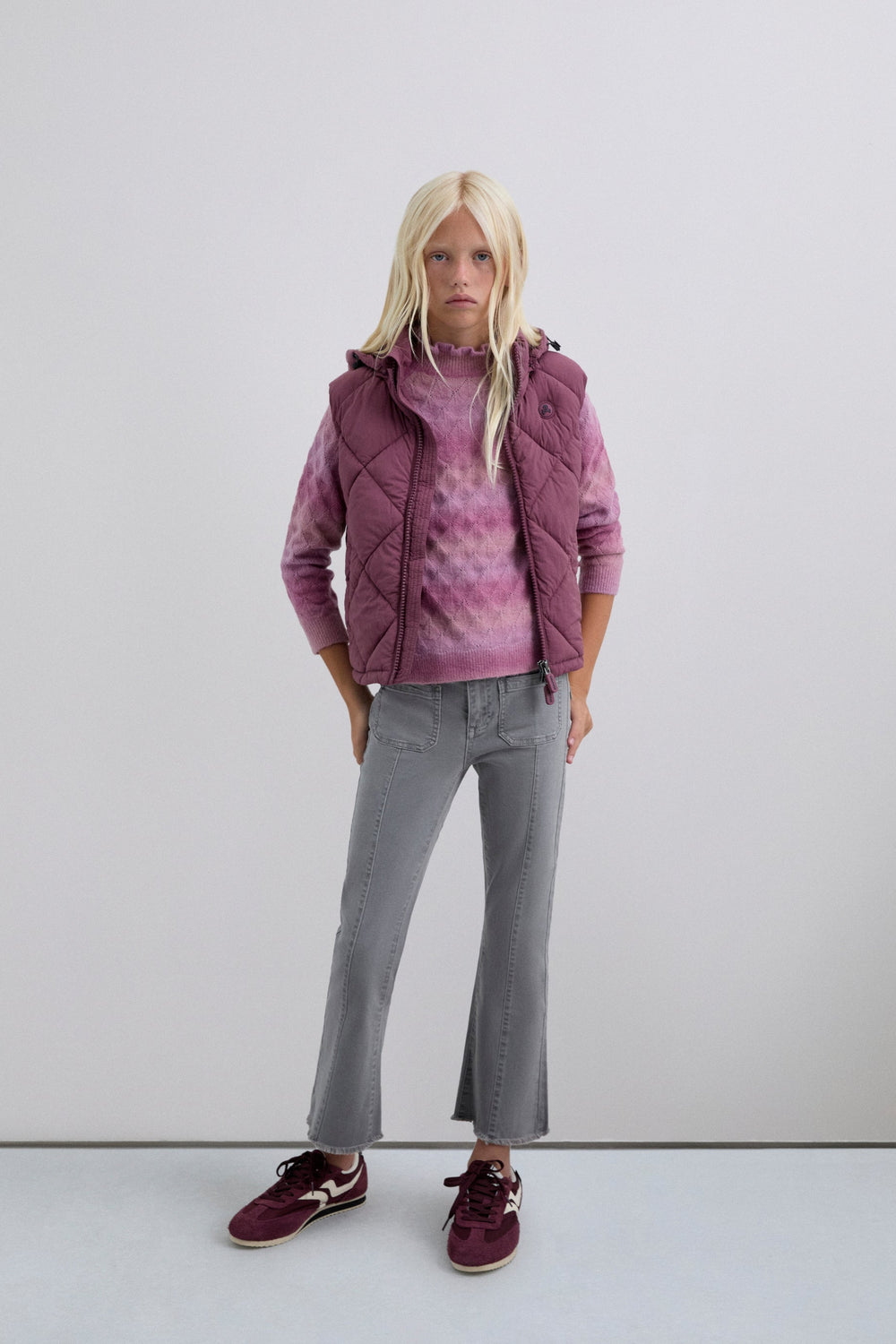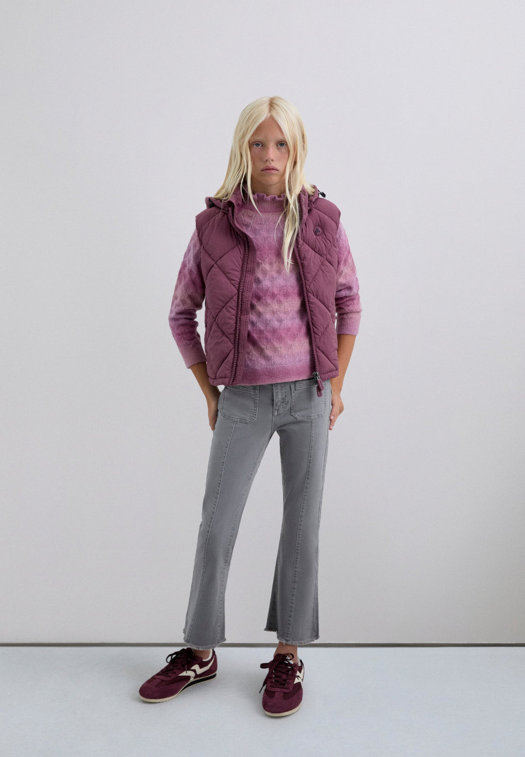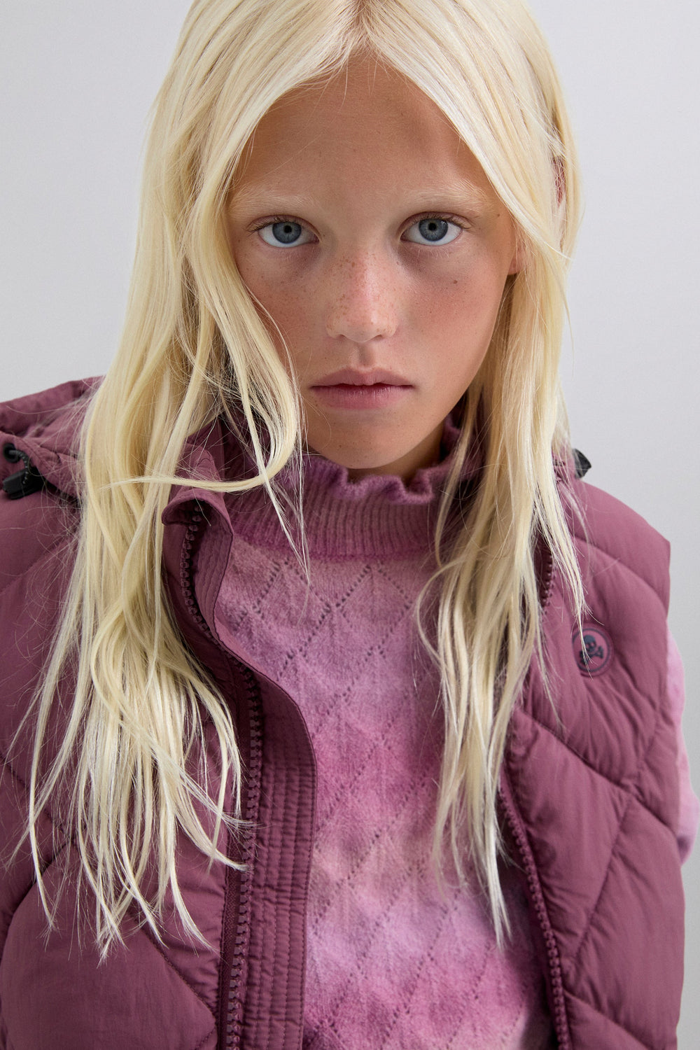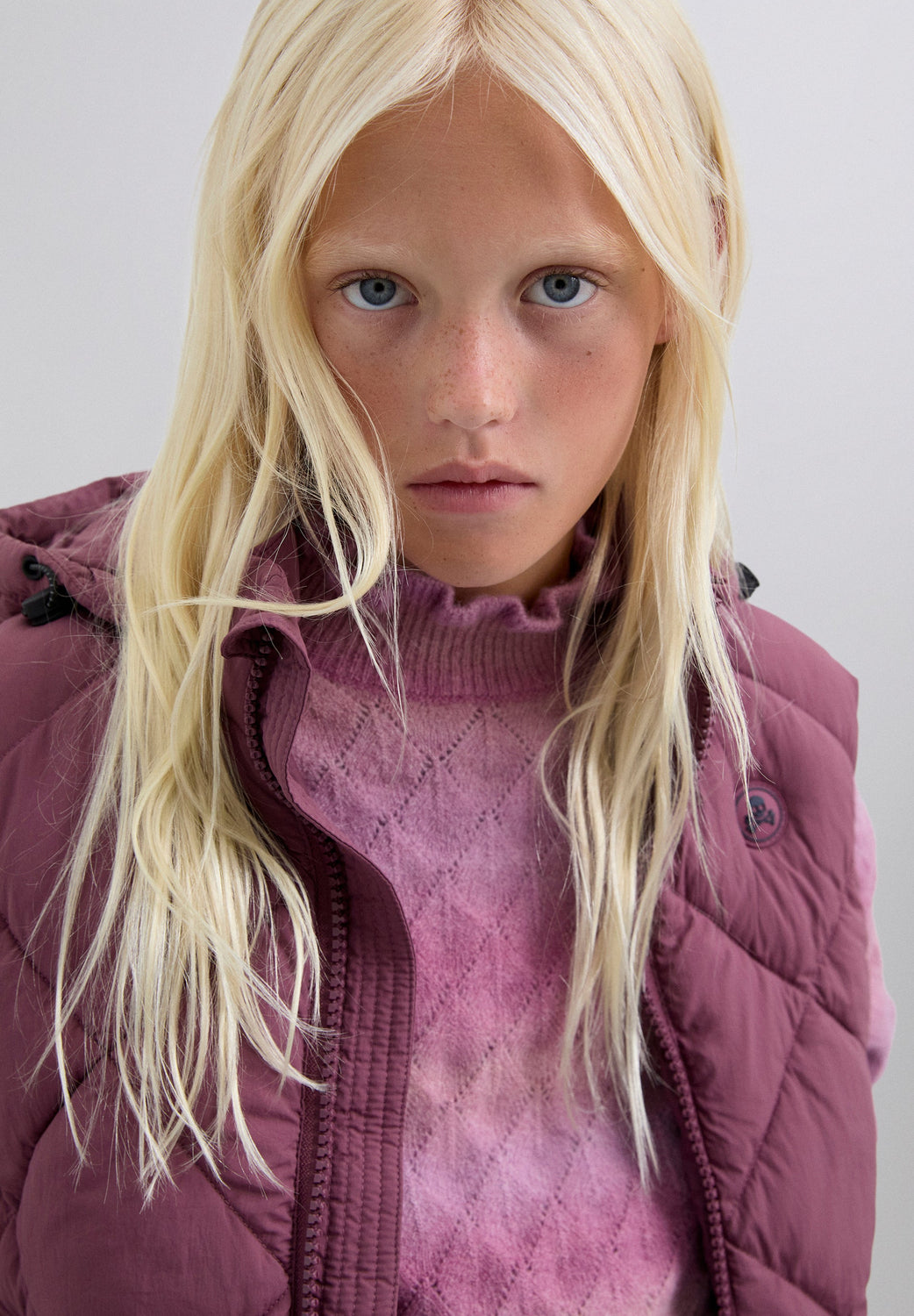 Heavy-duty padded waistcoat with adjustable hood. Double slider zip fastening. Rubberised skull detail on chest. Zip pockets and an inner pocket