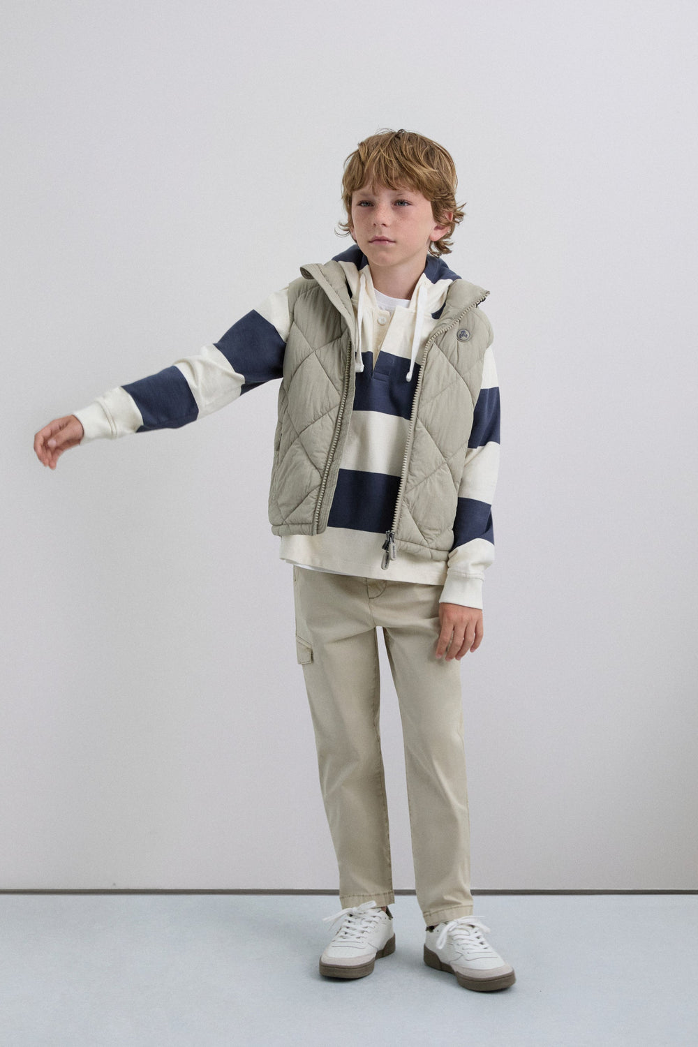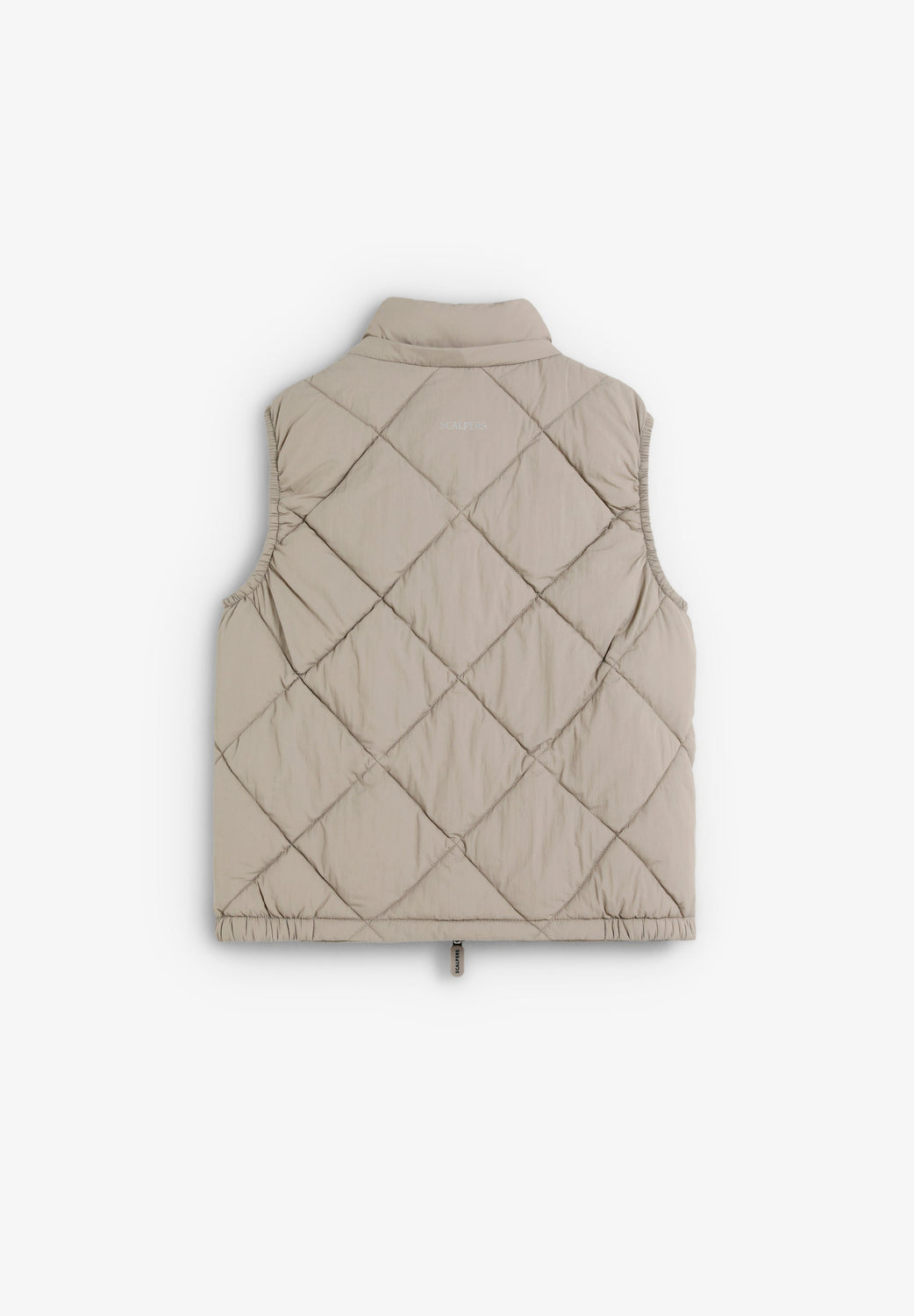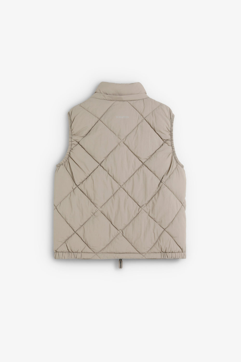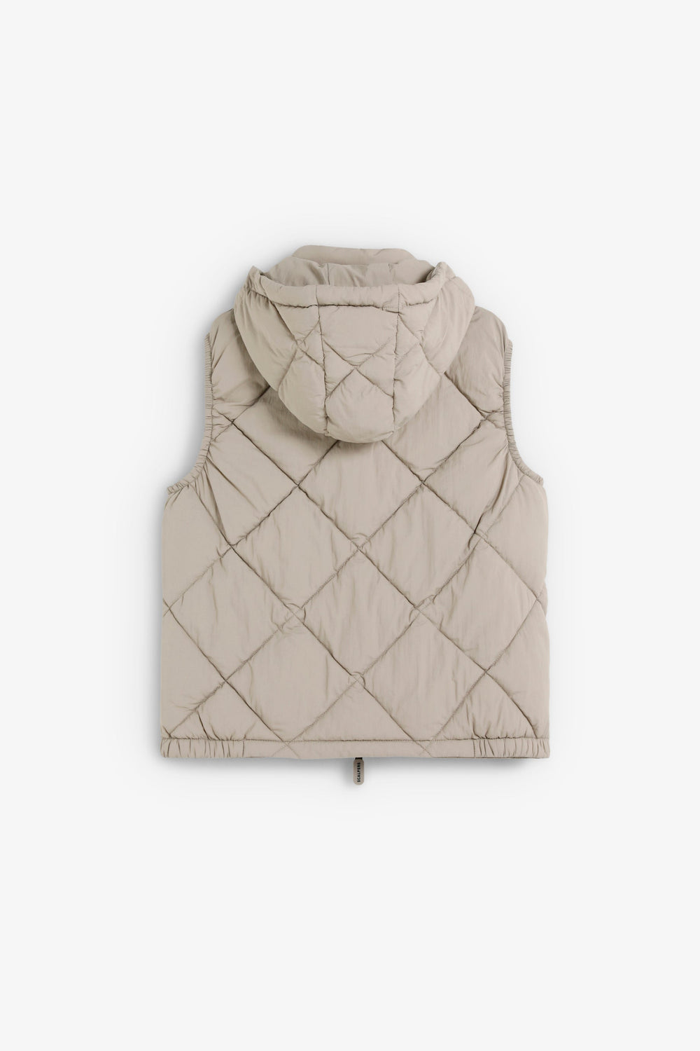 Heavy-duty padded waistcoat with adjustable hood. Double slider zip fastening. Rubberised skull detail on chest. Zip pockets and an inner pocket