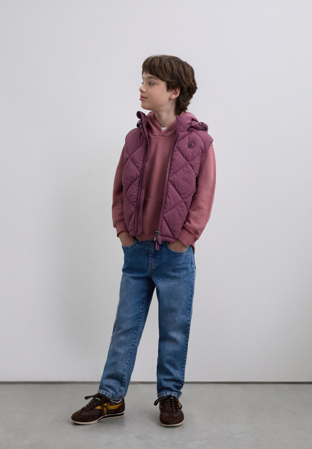 Heavy-duty padded waistcoat with adjustable hood. Double slider zip fastening. Rubberised skull detail on chest. Zip pockets and an inner pocket