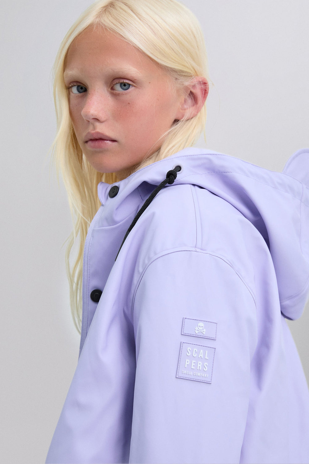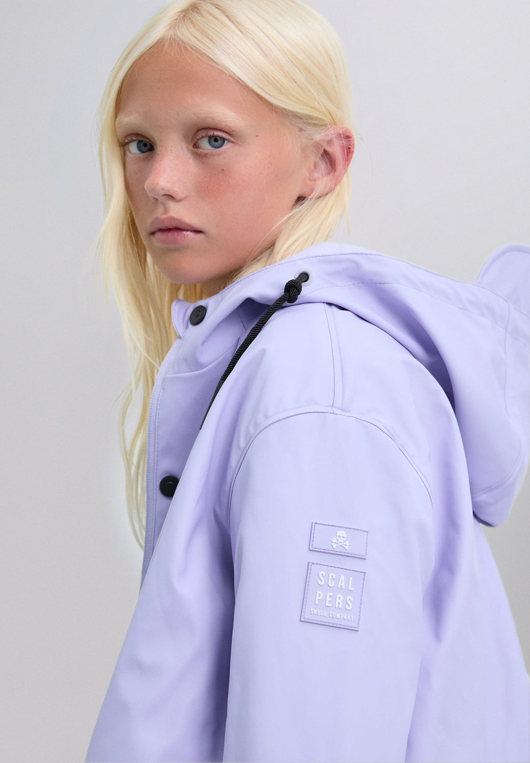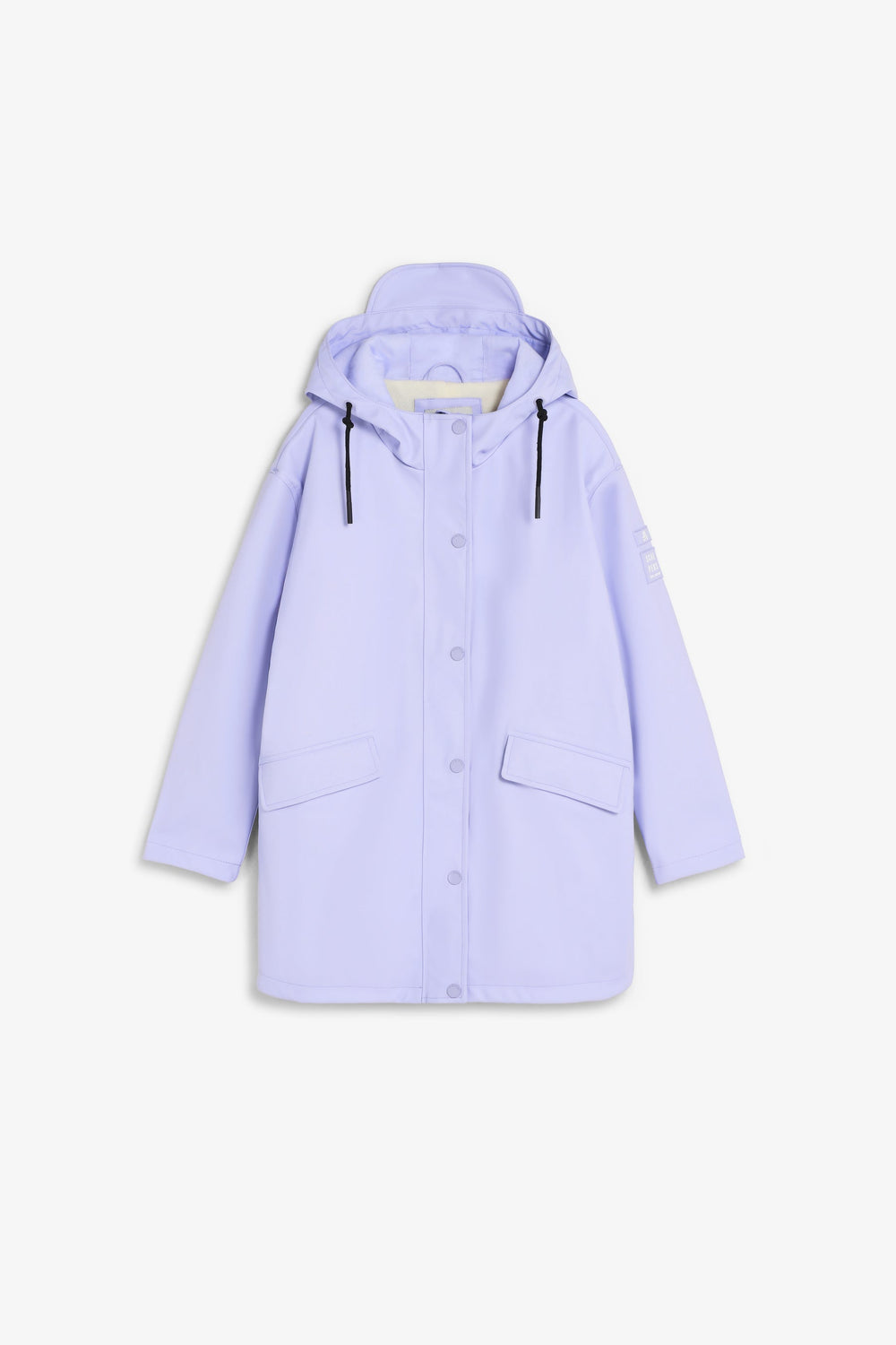 Waterproof jacket. Long sleeves. Adjustable drawstring hood. Two front pockets. Rubberised skull and logo patch detail on sleeve. Button and zip fastening.