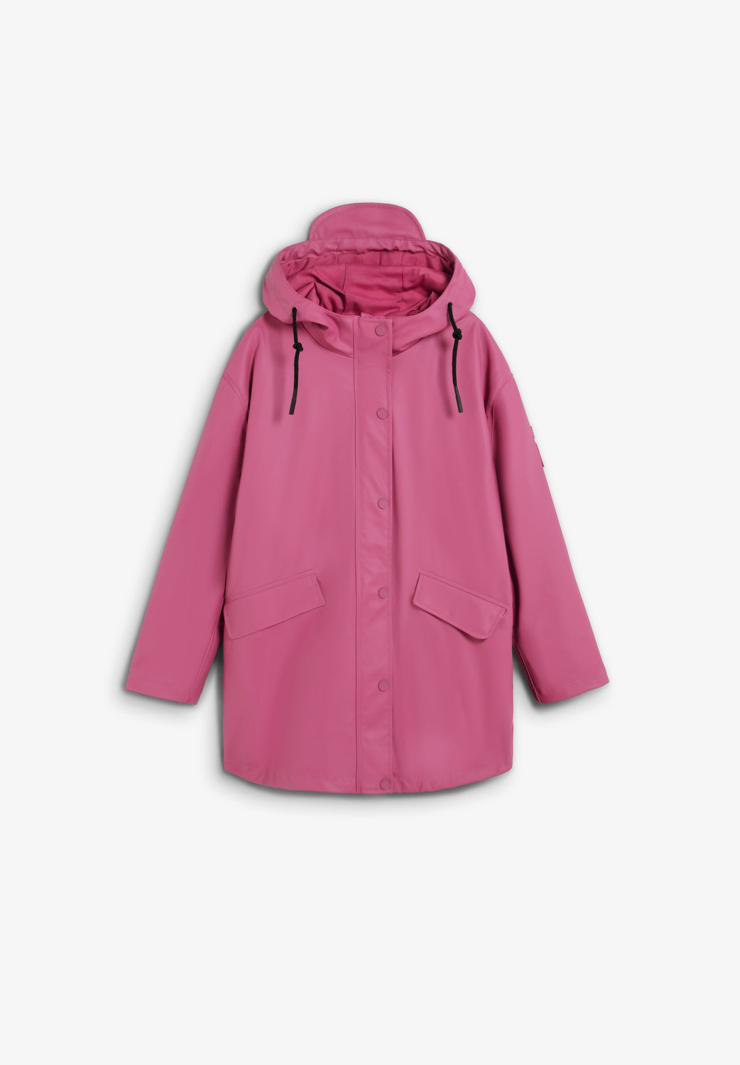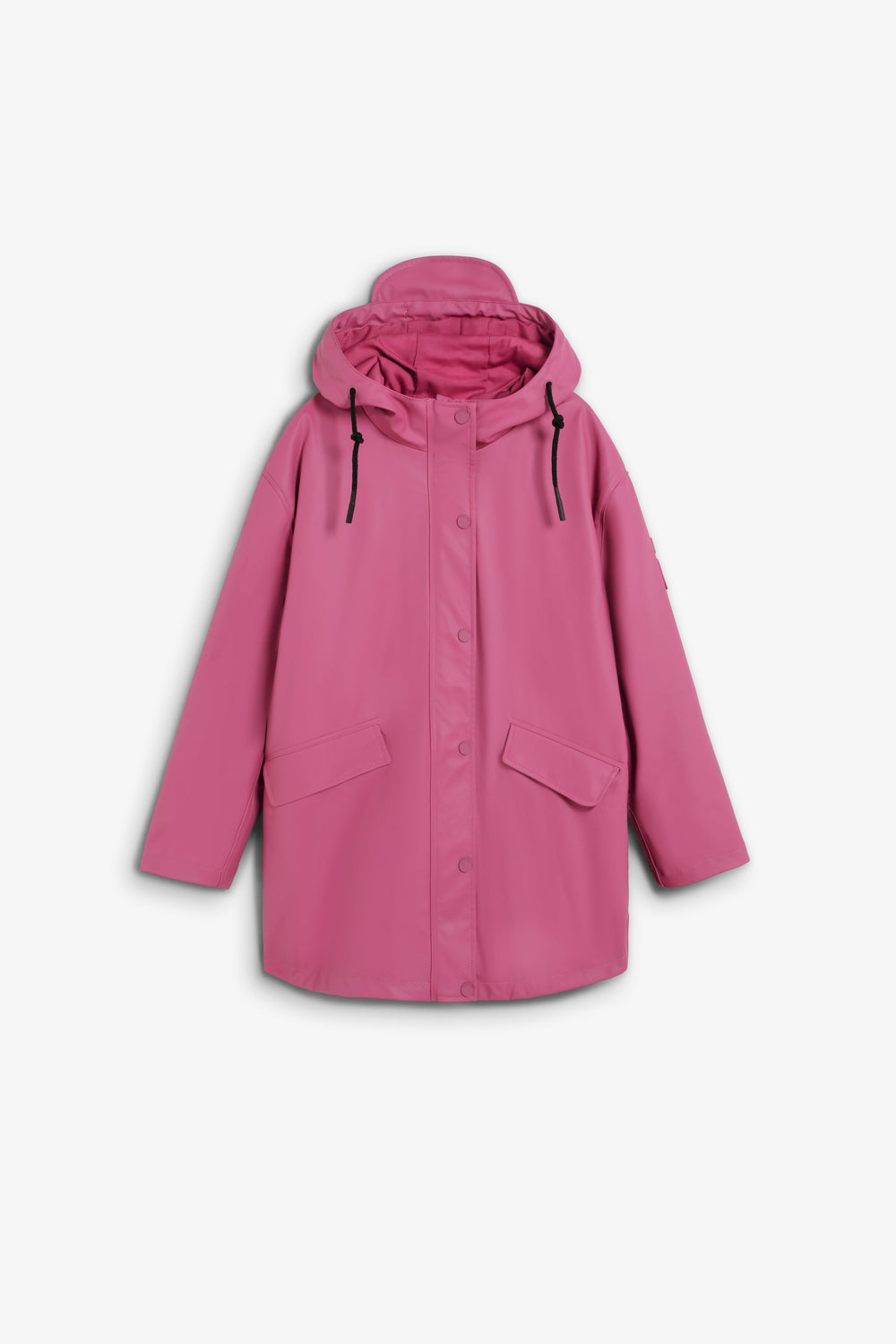 Waterproof jacket. Long sleeves. Adjustable drawstring hood. Two front pockets. Rubberised skull and logo patch detail on sleeve. Button and zip fastening.