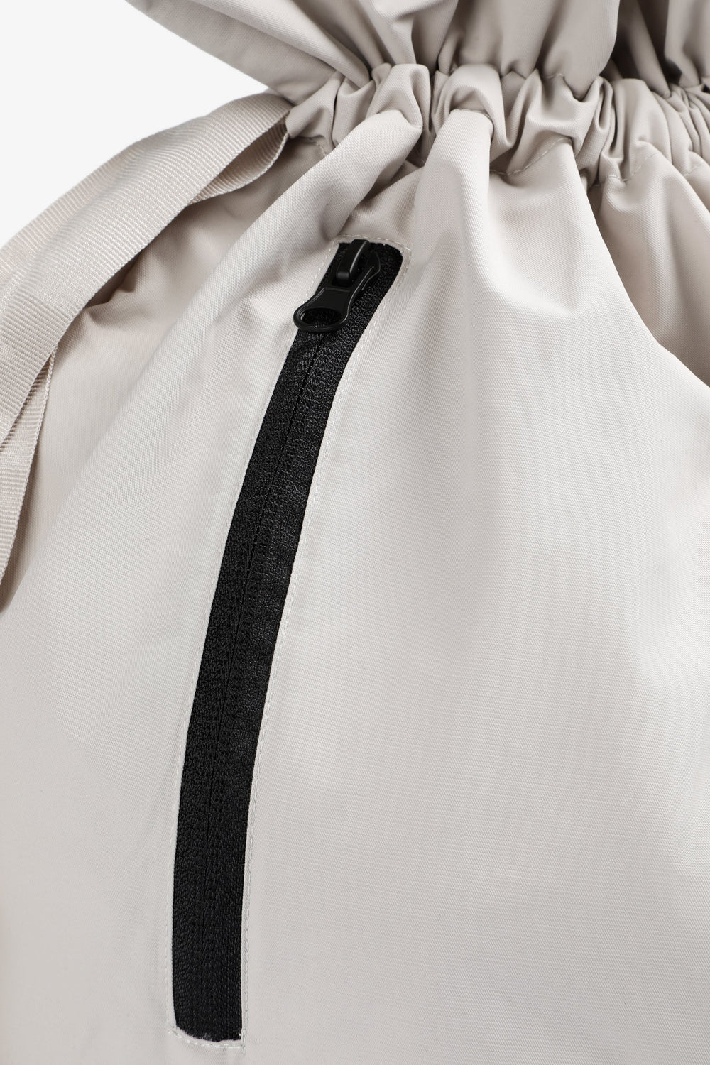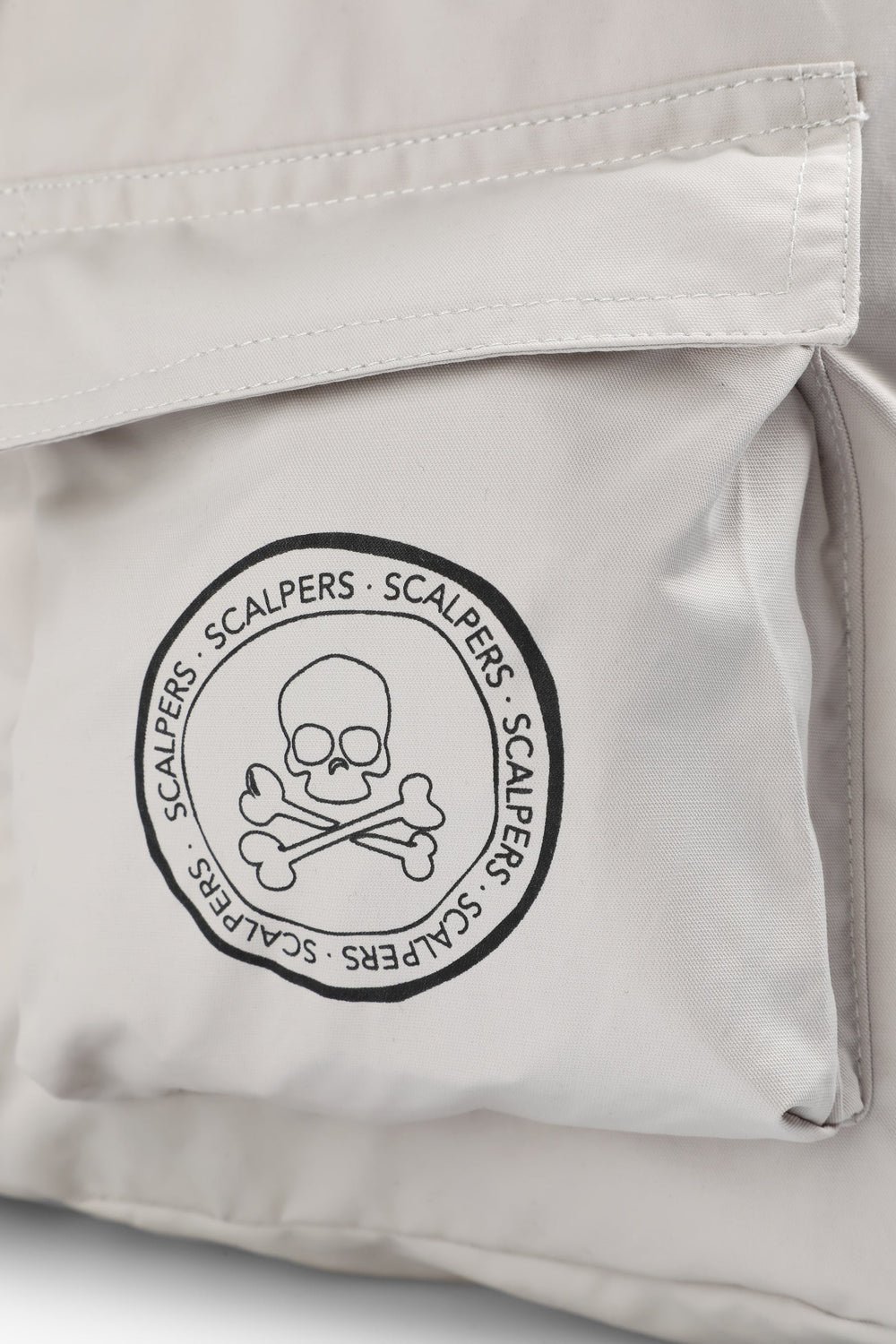 Lightweight backpack with knotted closure. Long adjustable strap. Two front flap pockets. Print with skull on pocket. Contrast side zip detail.