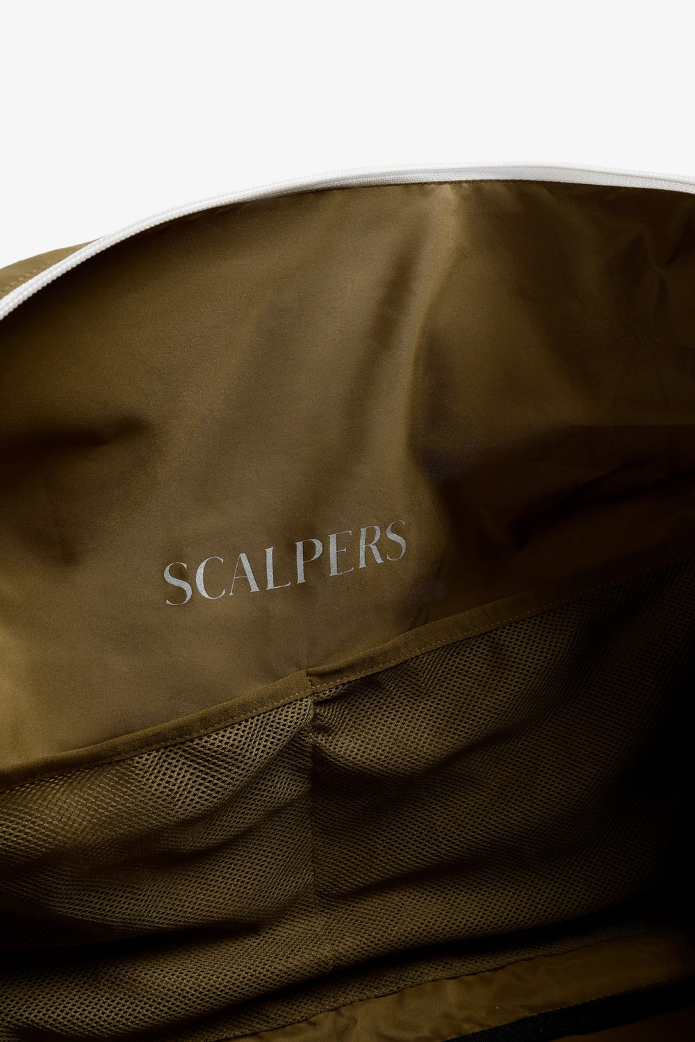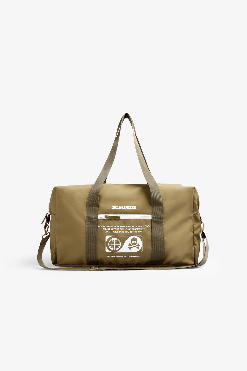 Bag made of a technical fabric. Main and side compartments with zip closure. Zip fastening, short handles and long detachable strap. Front logo and skull print.