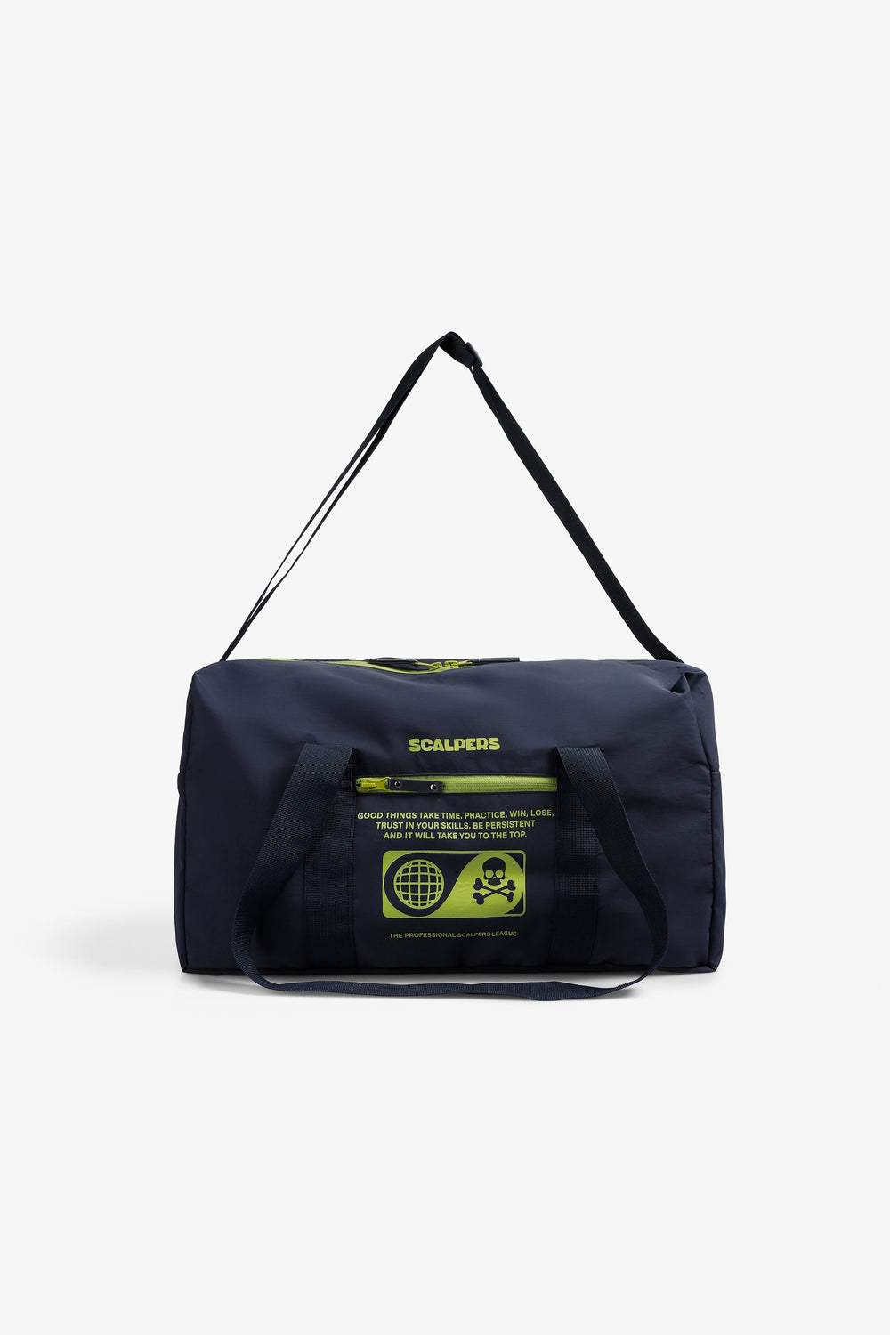 Bag made of a technical fabric. Main and side compartments with zip closure. Zip fastening, short handles and long detachable strap. Front logo and skull print.