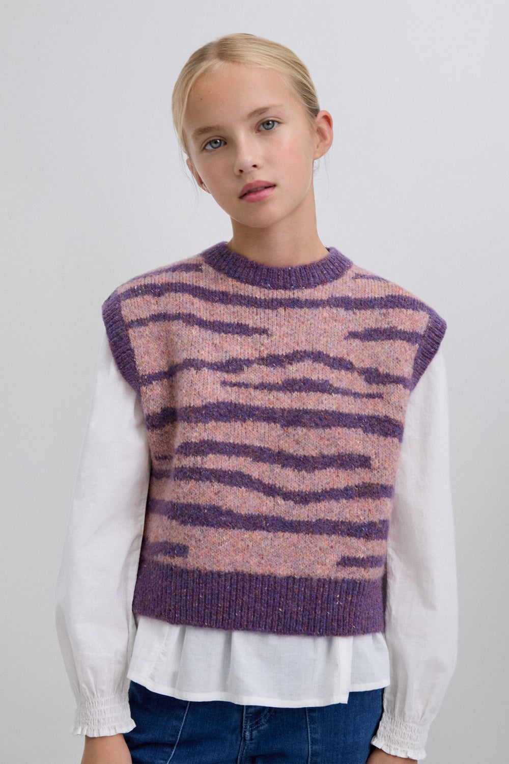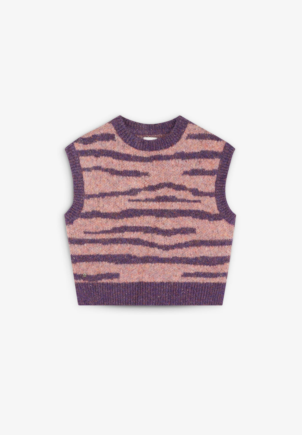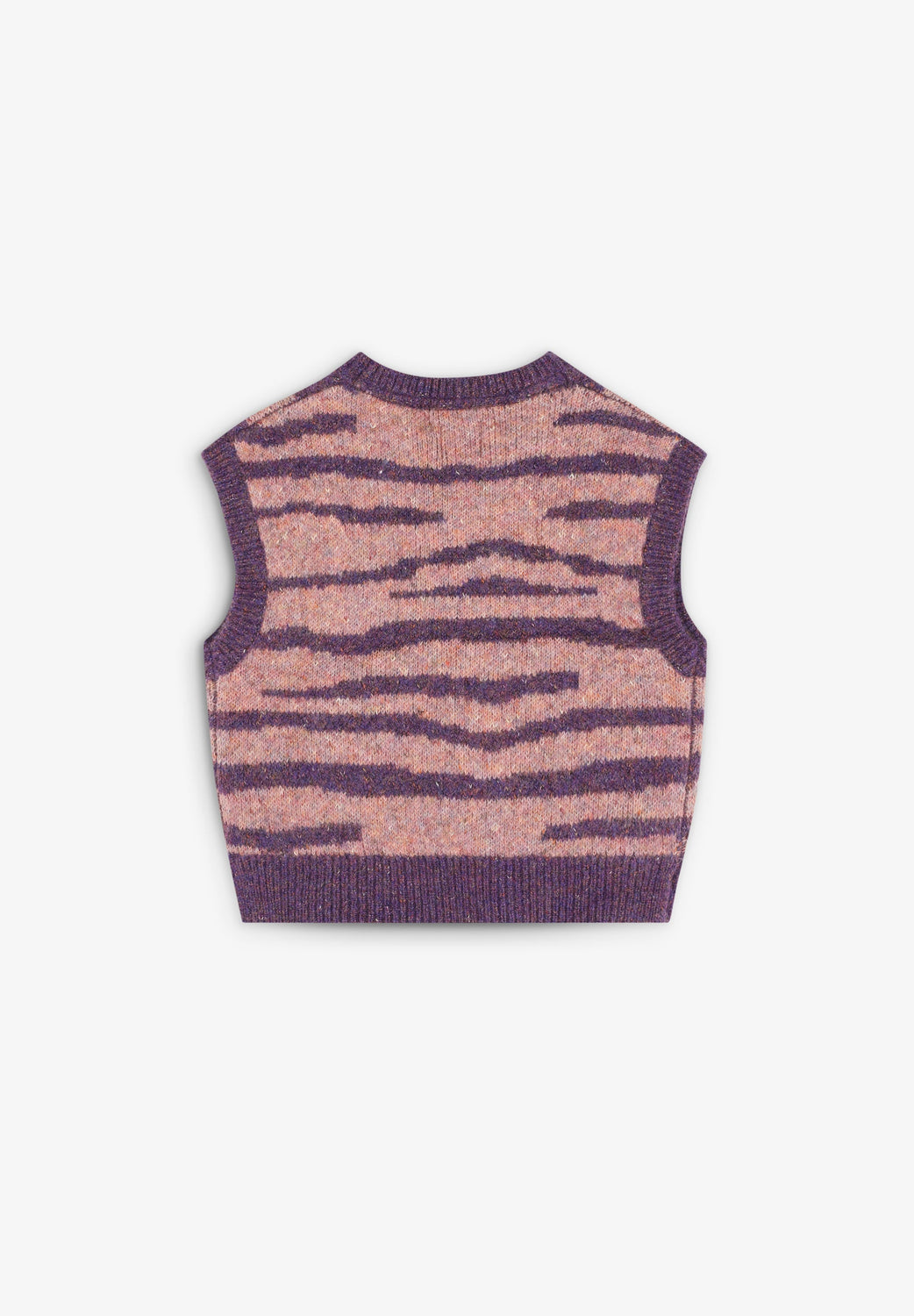 Knit vest. Round neck. Contrast ribbed finish. Animal print.