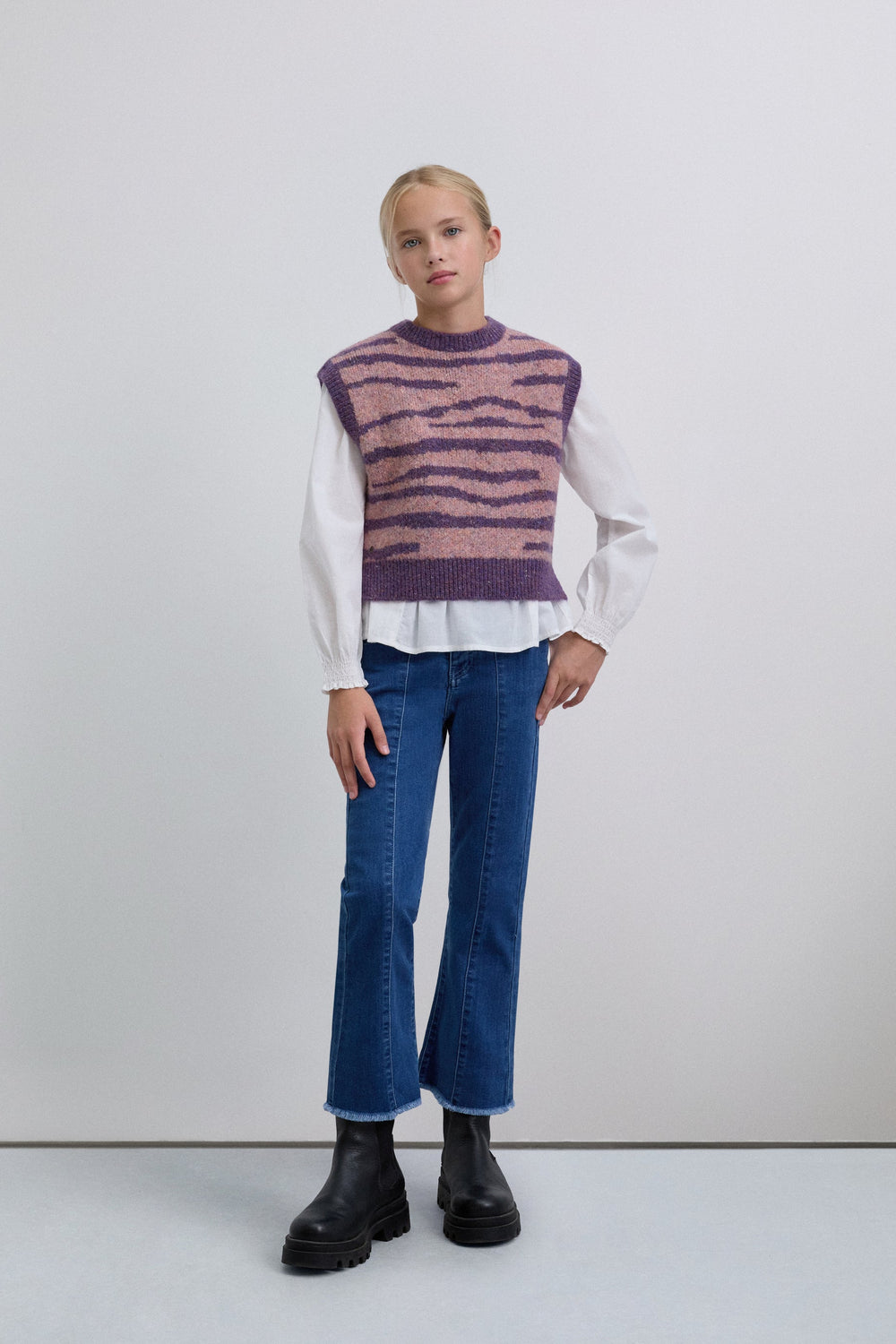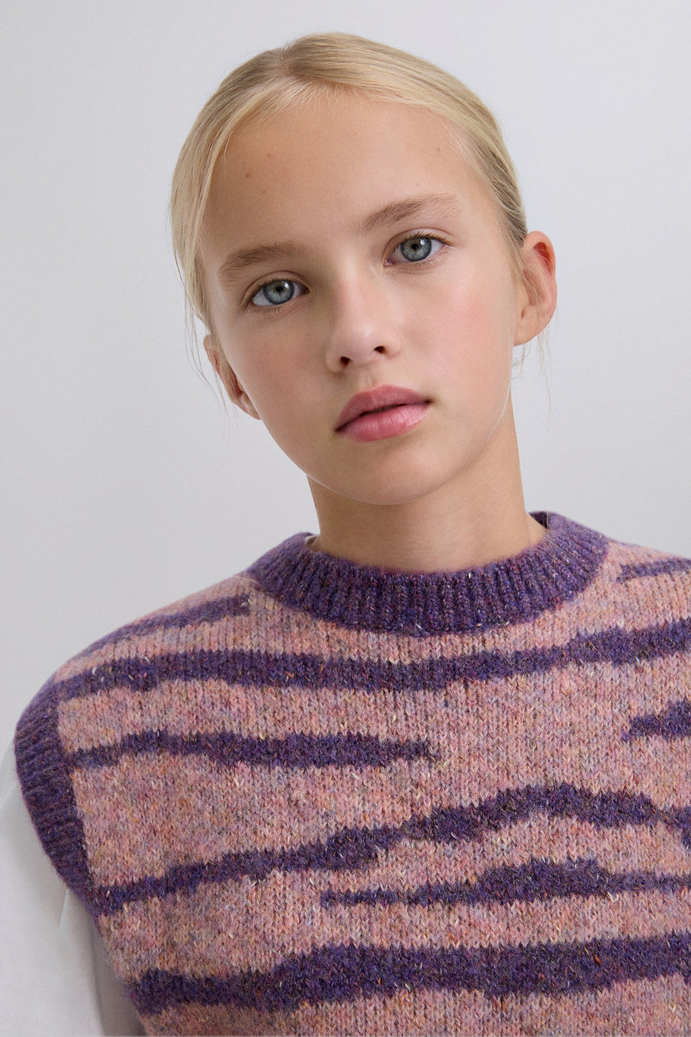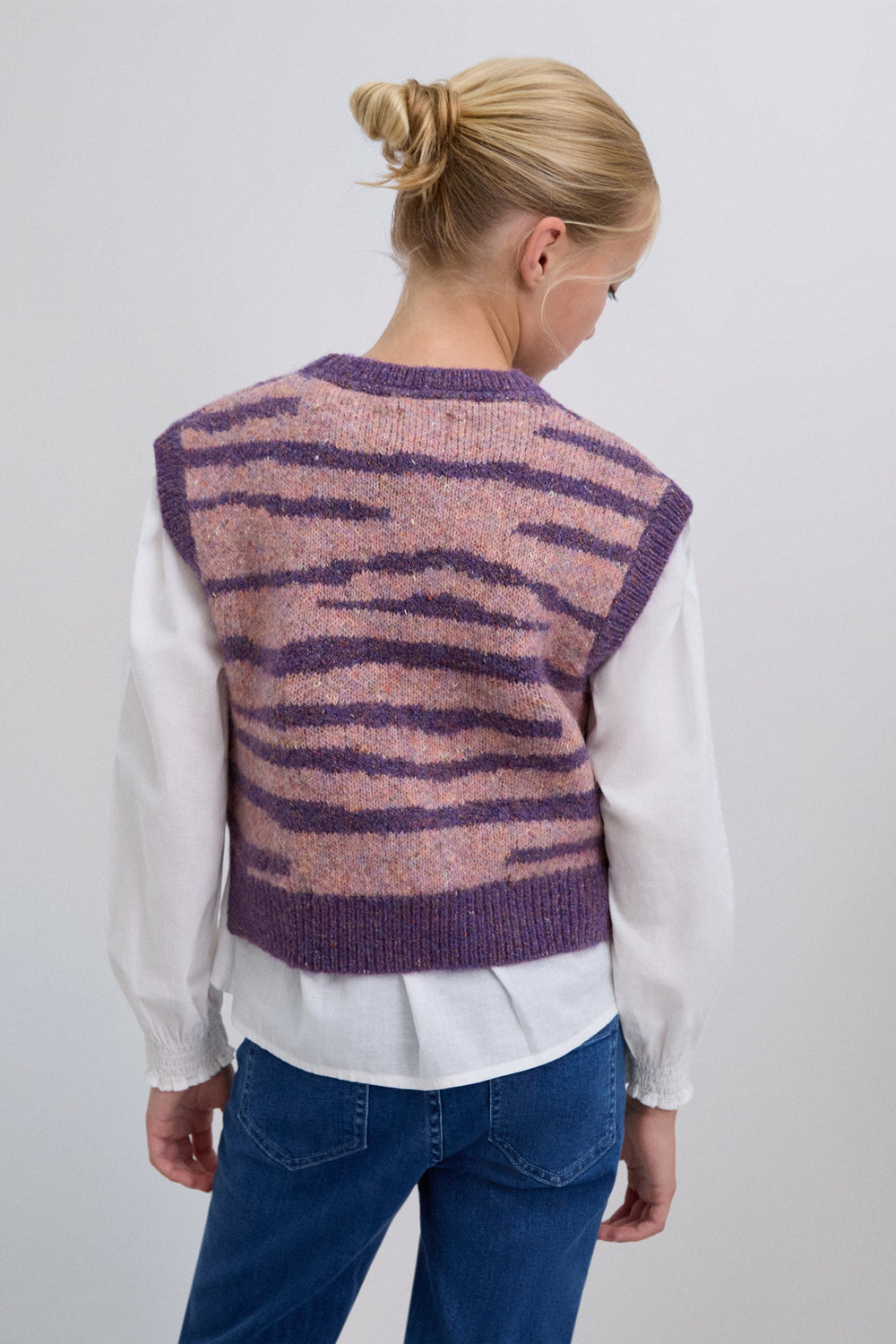 Knit vest. Round neck. Contrast ribbed finish. Animal print.