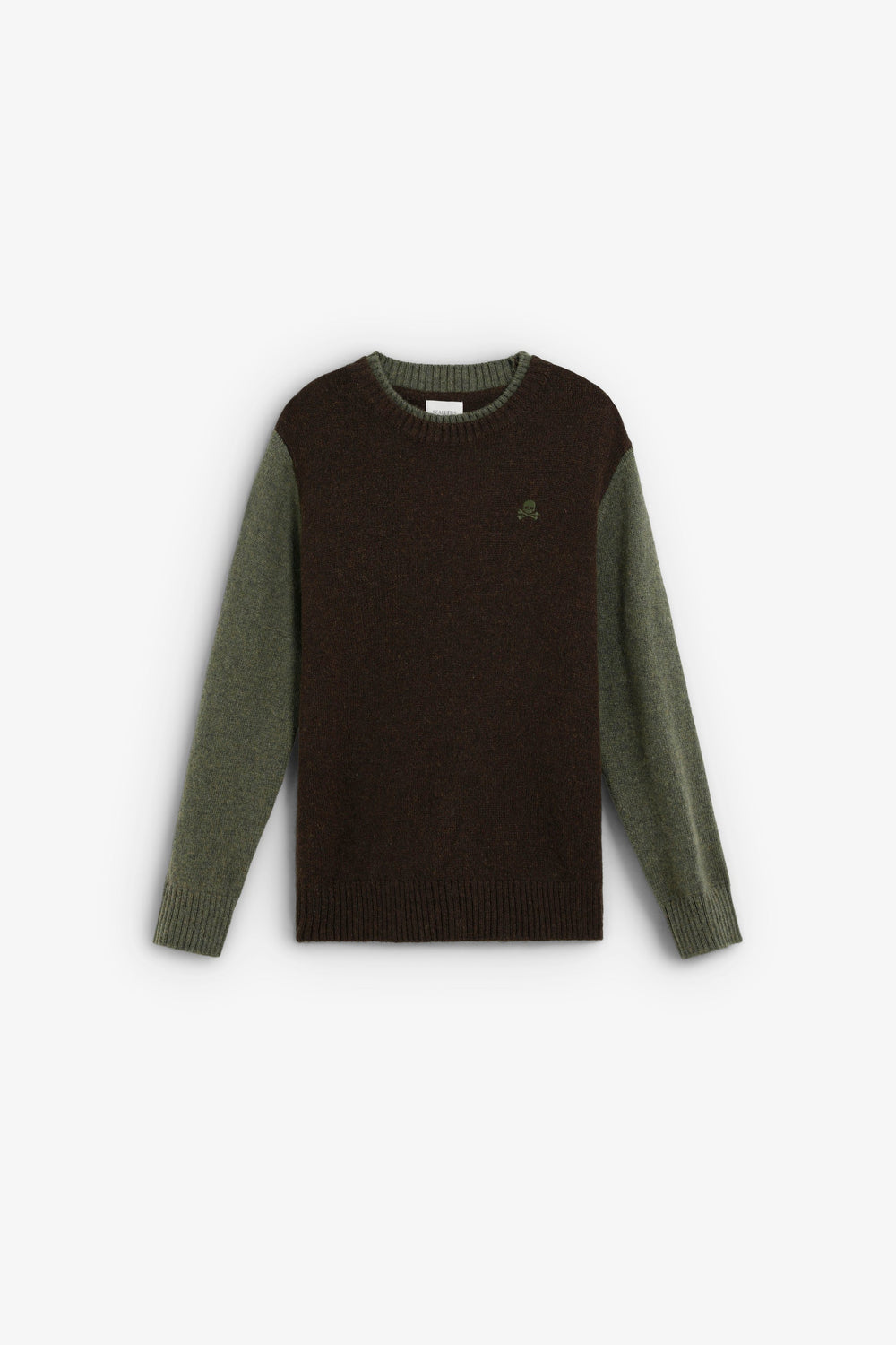 Knit sweater. Round neck and contrasting long sleeves. Contrast embroidered logo detail on the chest.