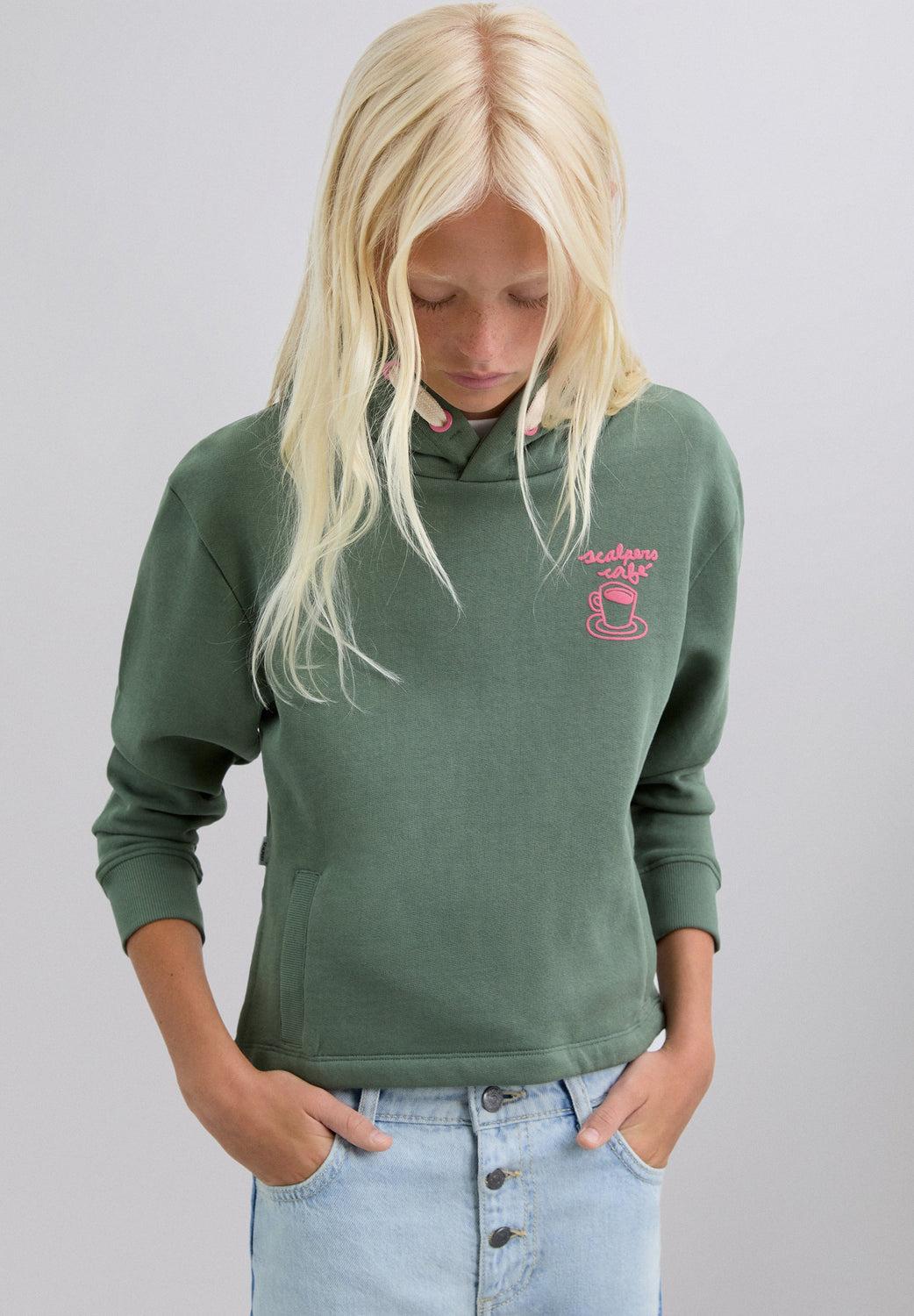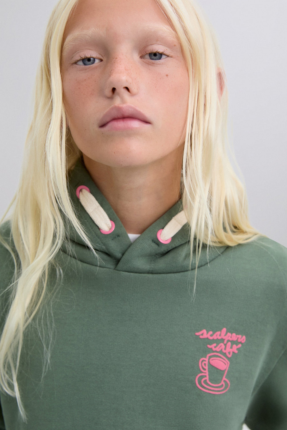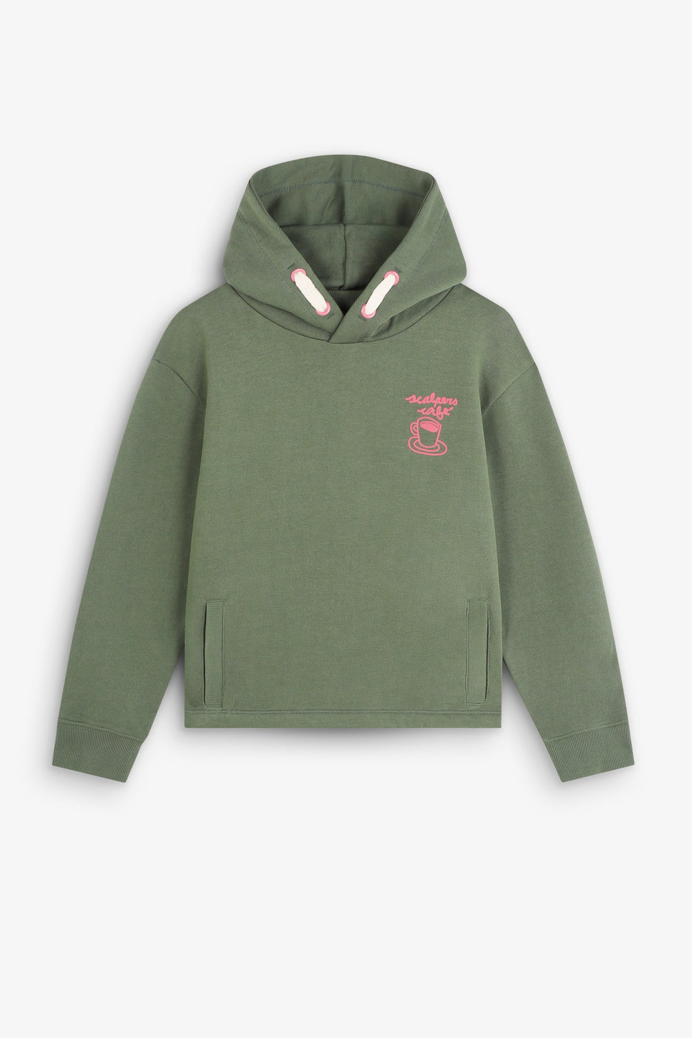 Sweatshirt with adjustable hood made of 100% BCI cotton. Long sleeves with cuffs and front pouch pockets. Print detail on the chest and back.