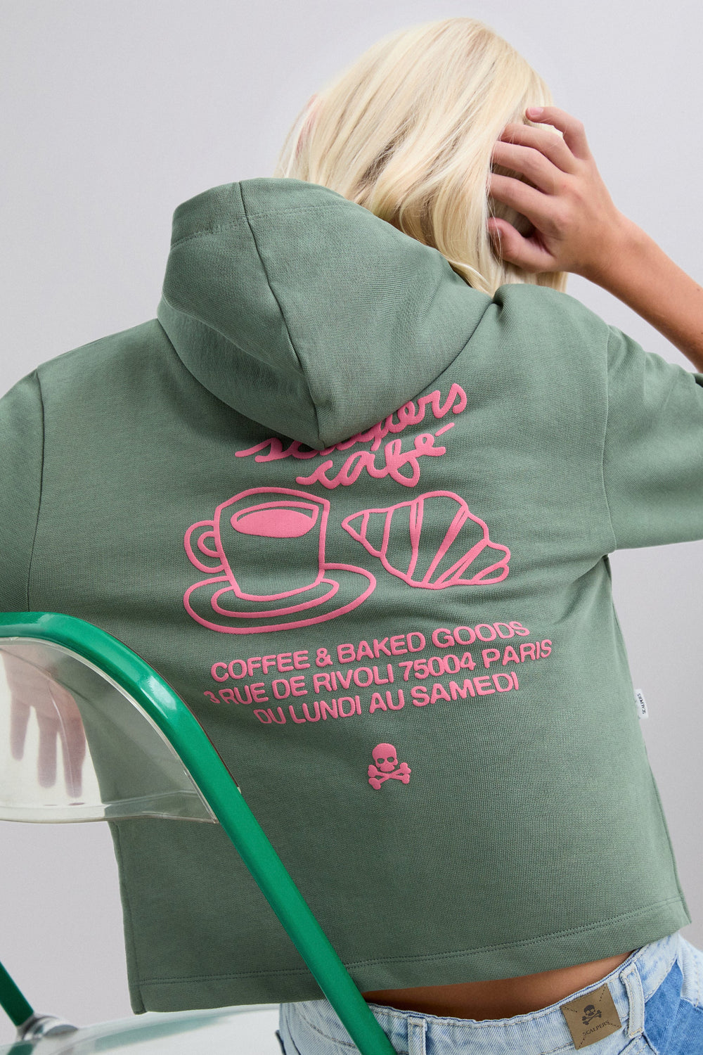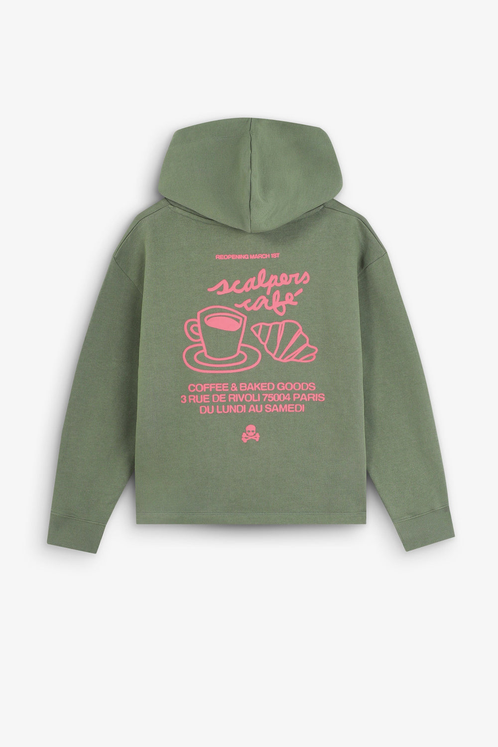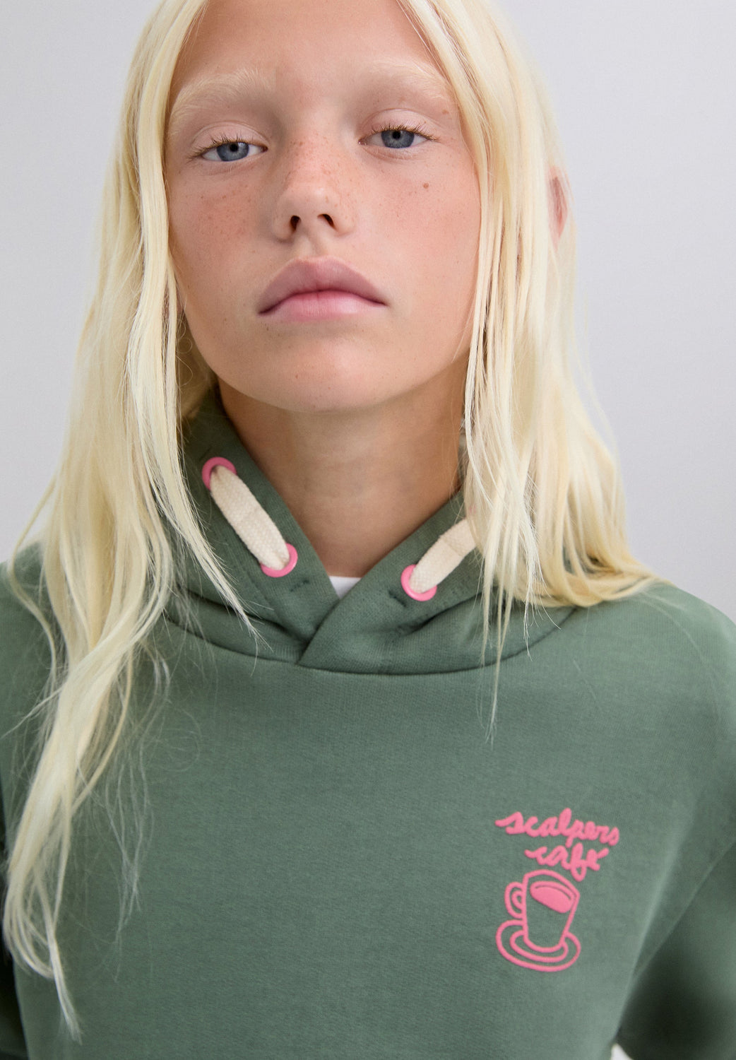 Sweatshirt with adjustable hood made of 100% BCI cotton. Long sleeves with cuffs and front pouch pockets. Print detail on the chest and back.