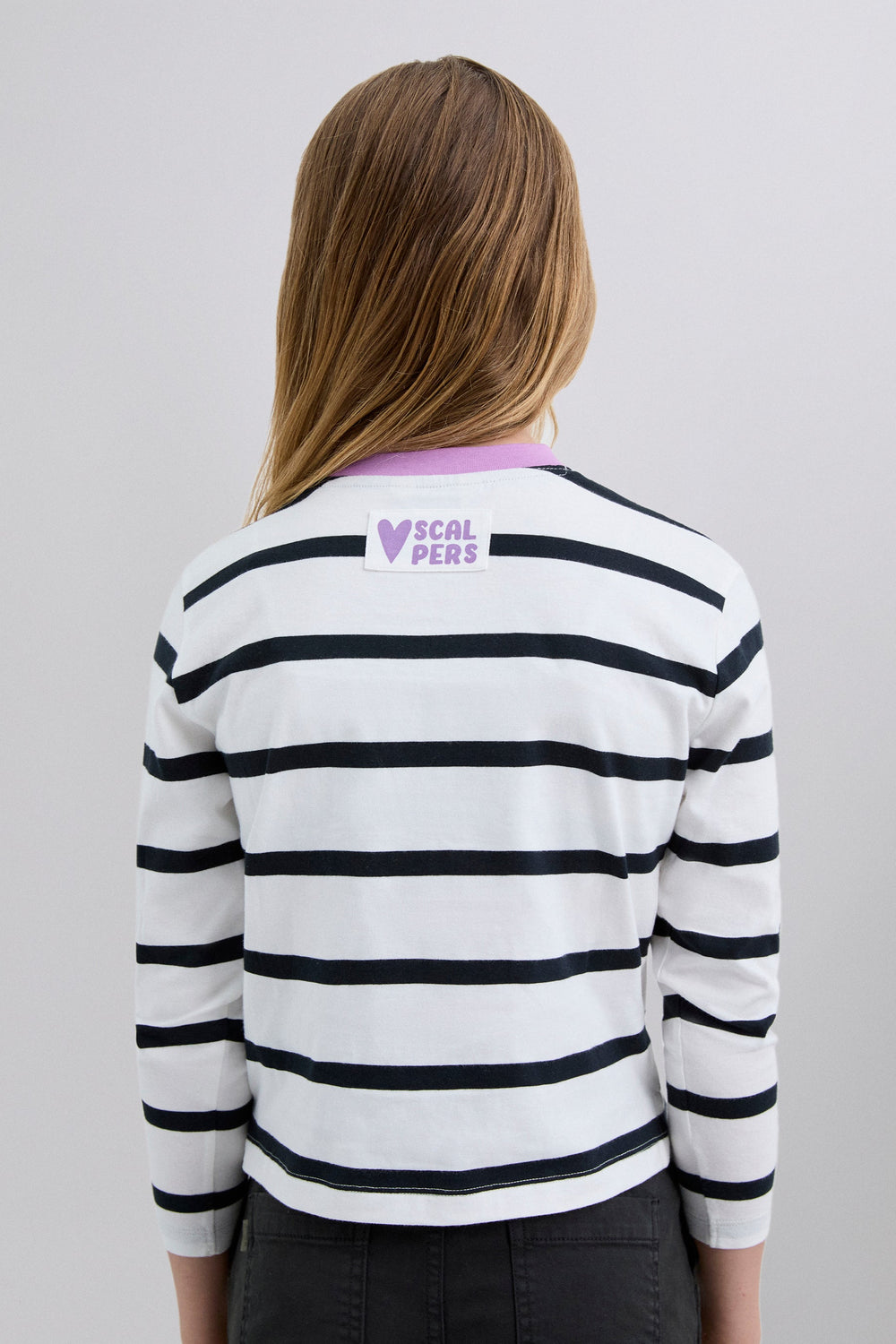 Striped T-shirt made of 100% BCI cotton. Regular fit, contrast round neck and long sleeves. Chest pocket detail and logo label on back.