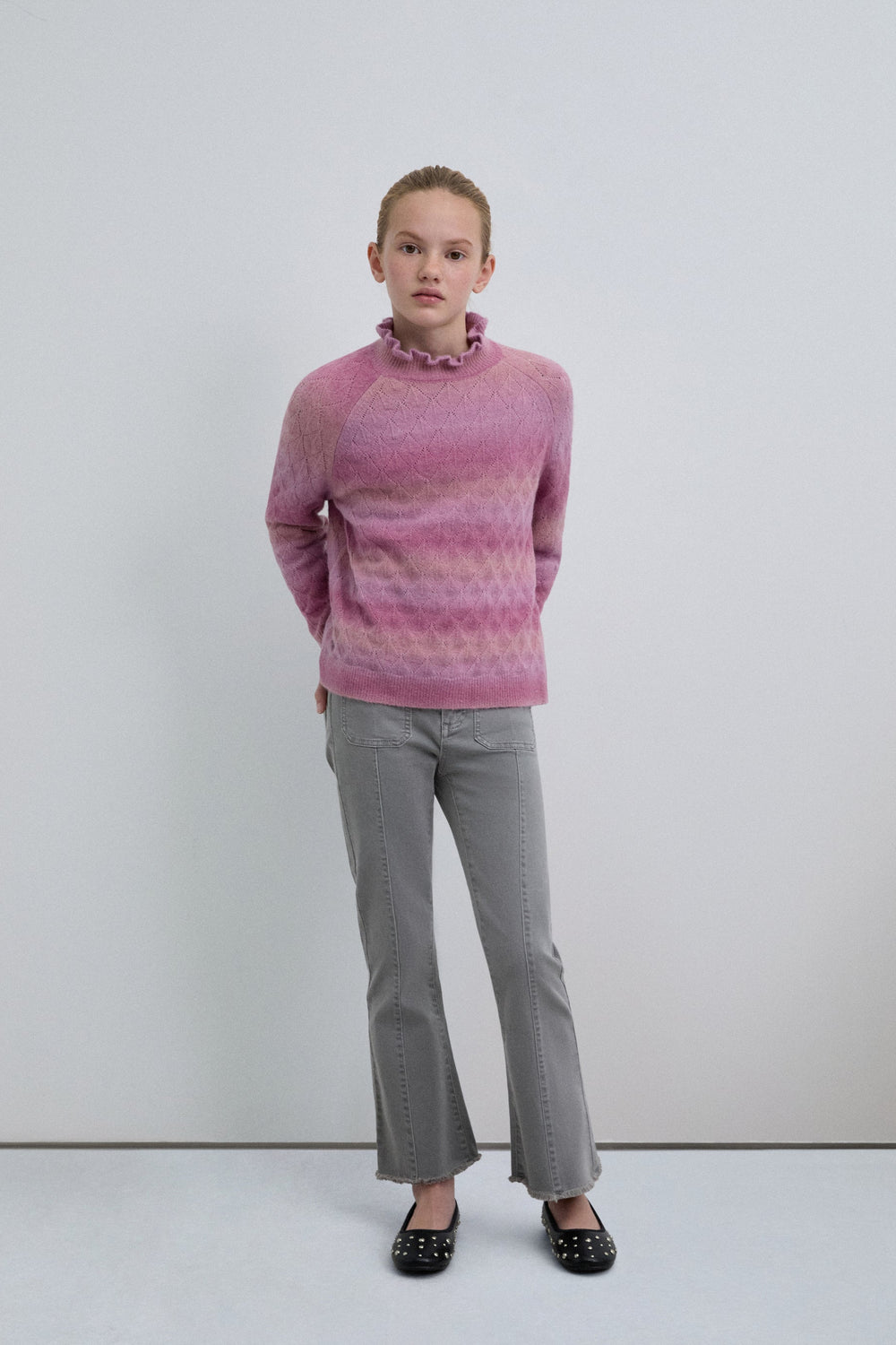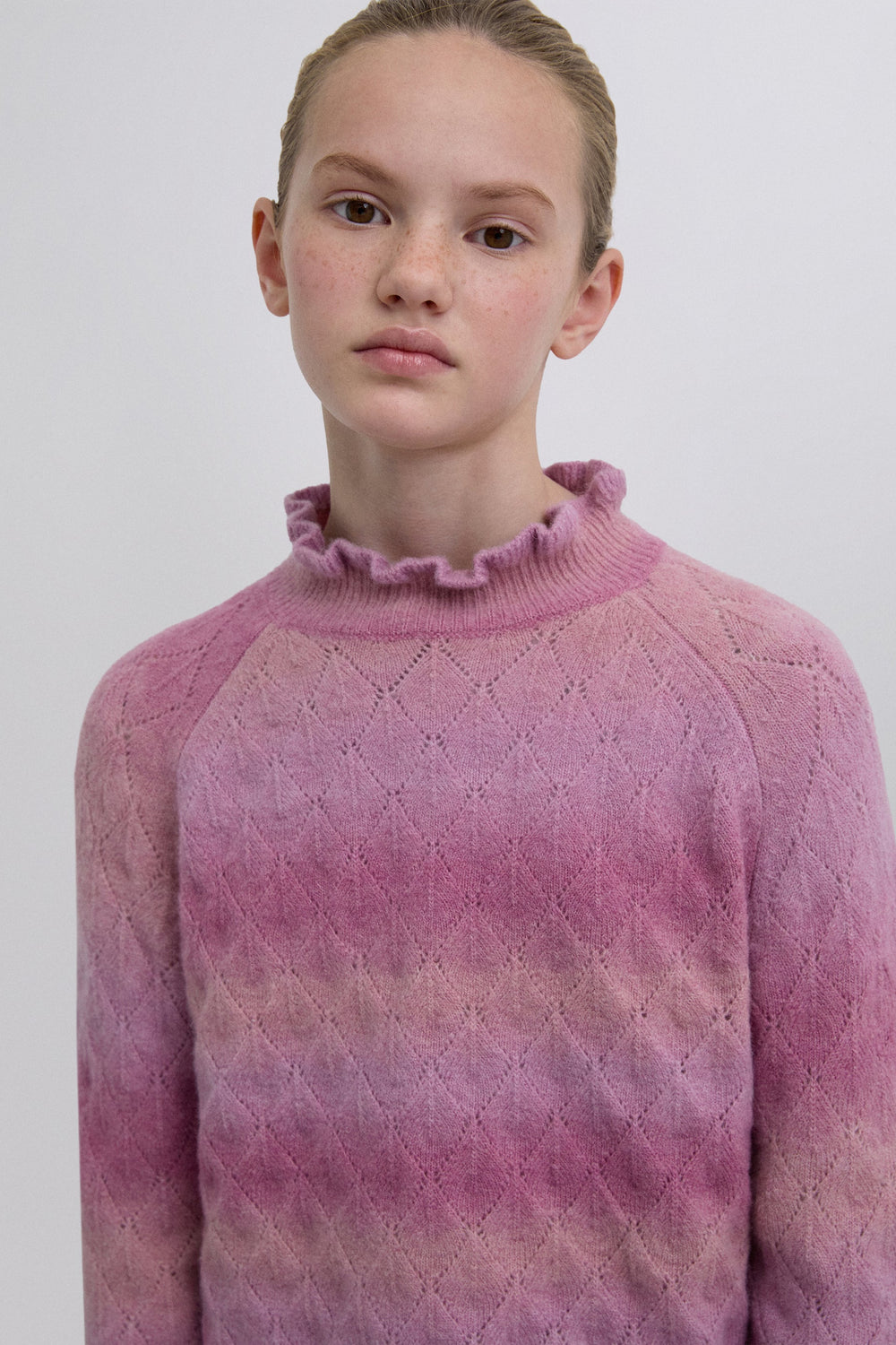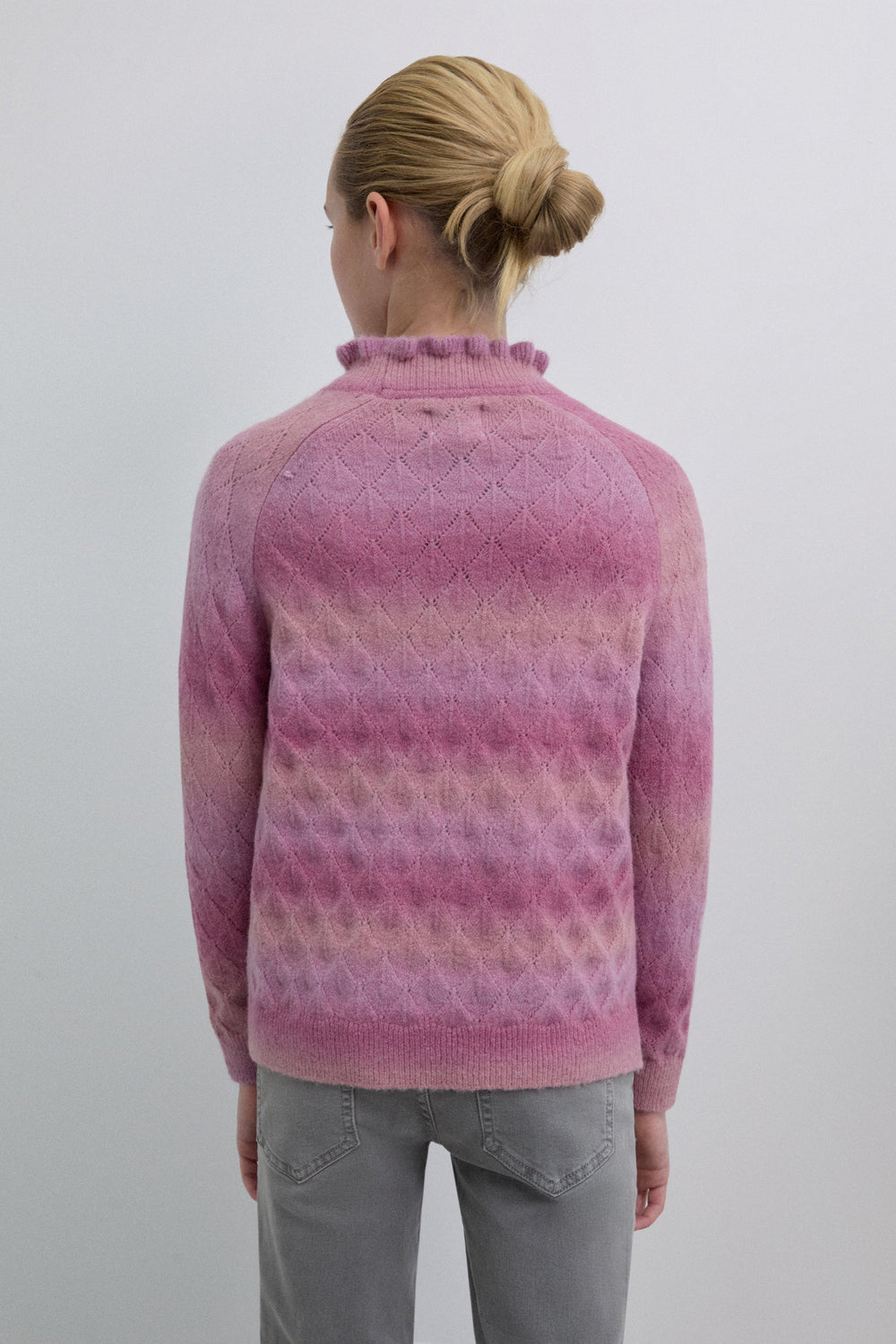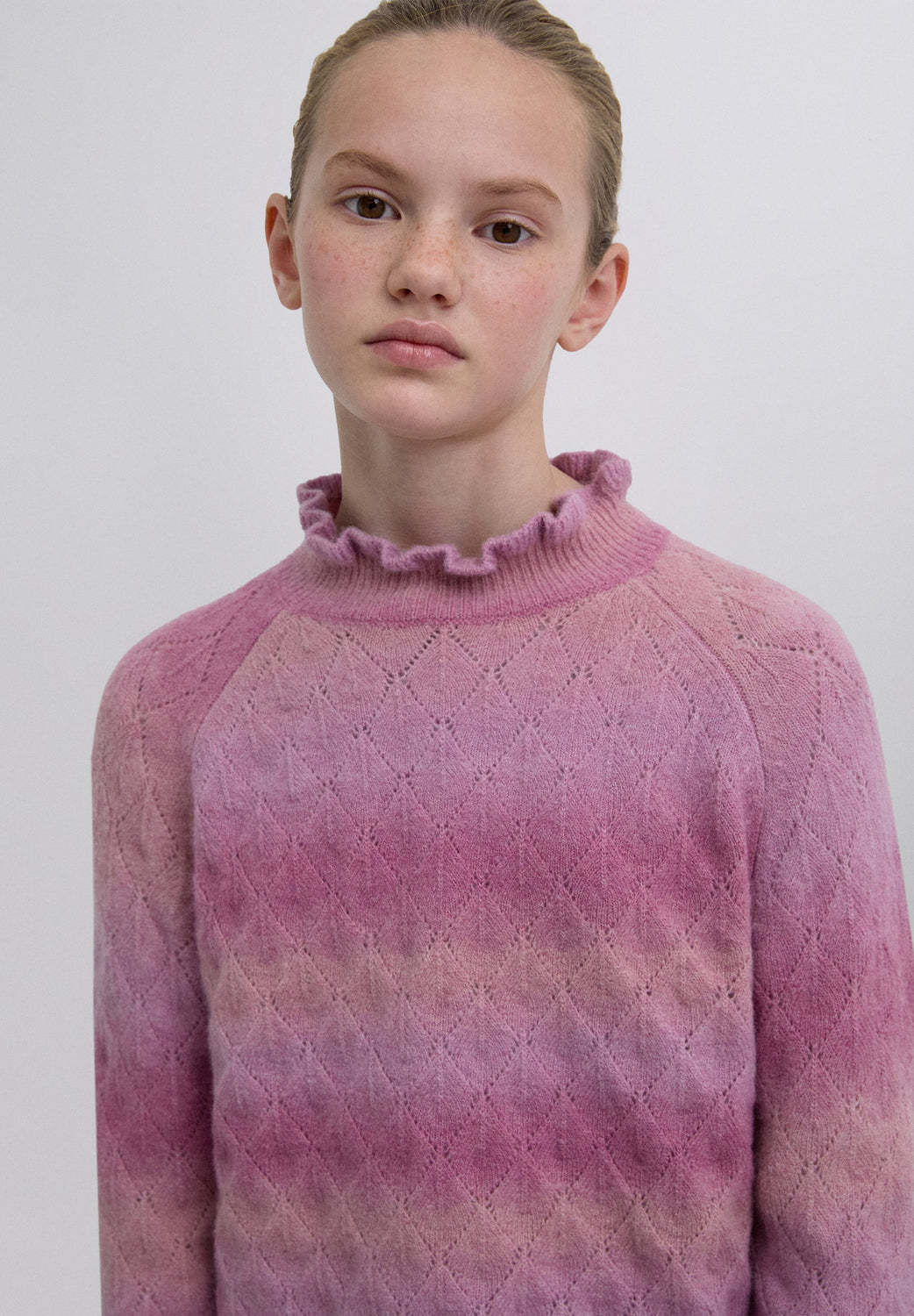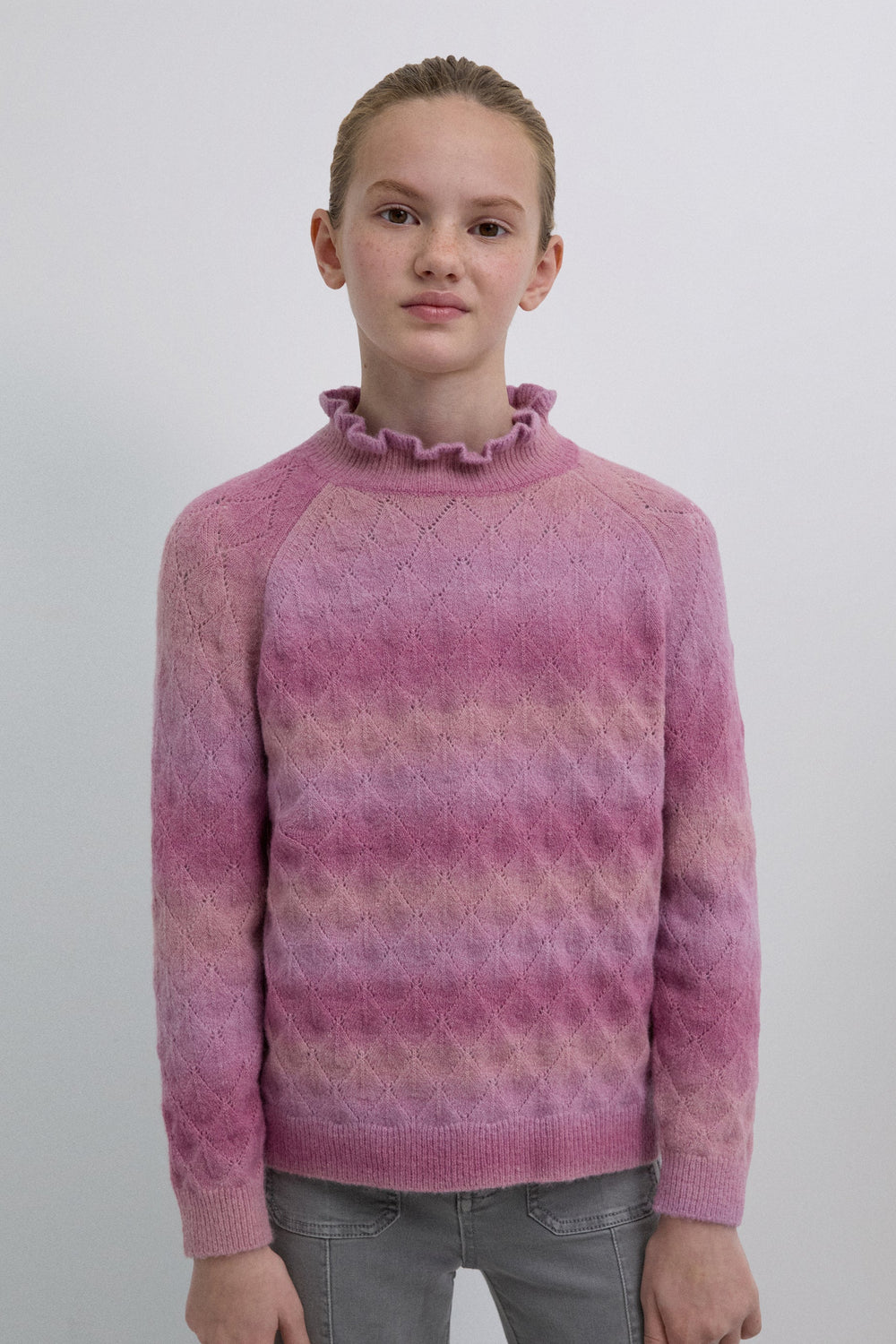 Knit sweater made of a merino wool blend. High neck with ruffles. Long sleeves with ribbed cuffs. Perforated diamond pattern.