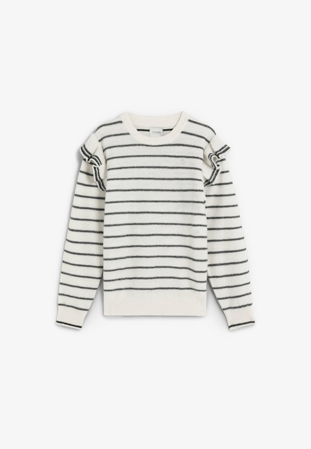 Striped sweater made of a wool blend. Round neck. Regular fit. Ruffle detail on shoulders and logo on chest.