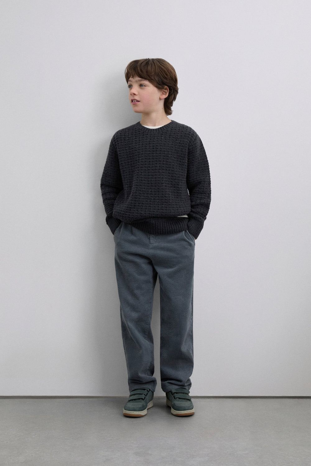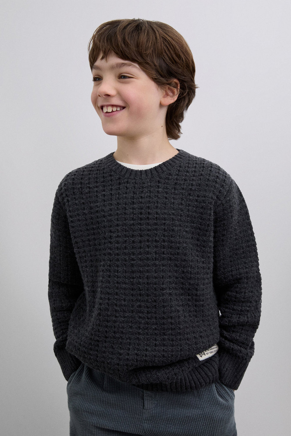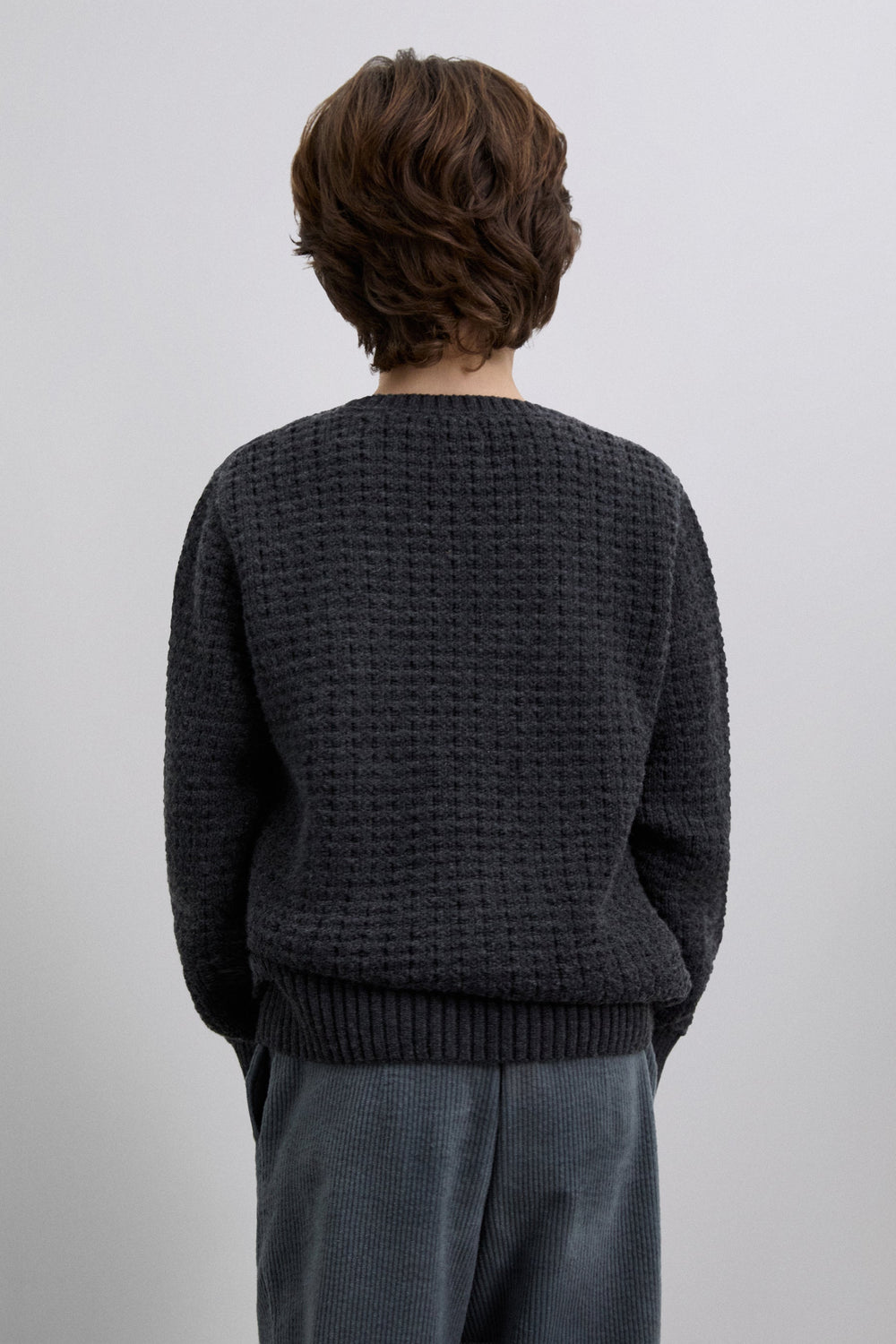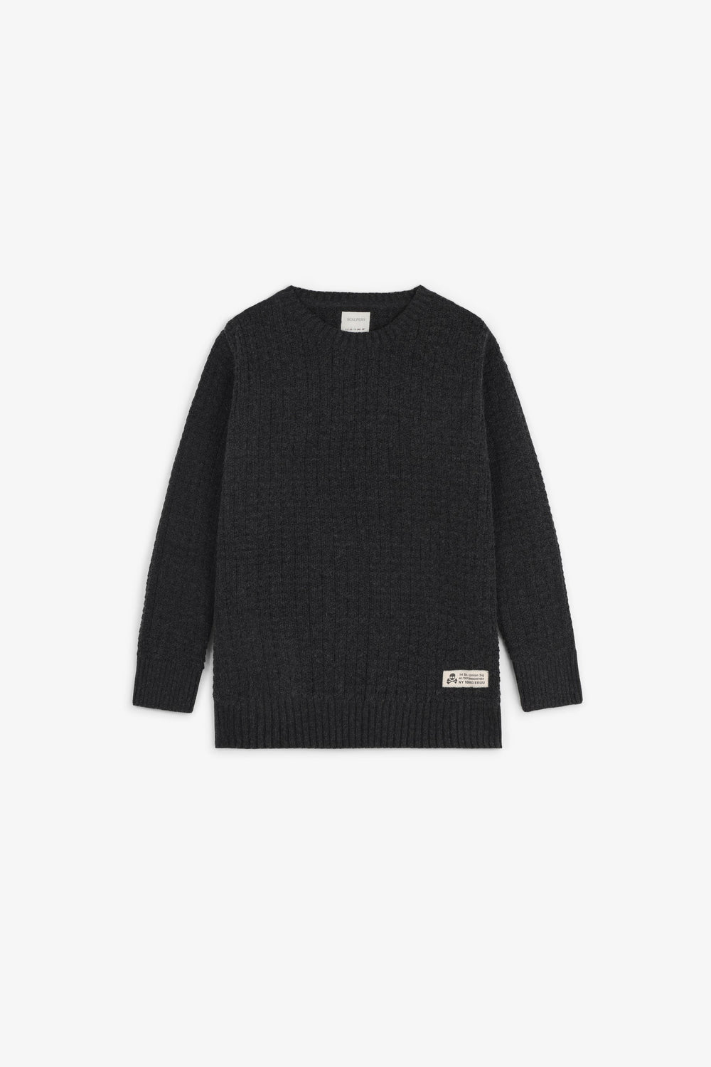 Round neck sweater Long sleeves. Ribbed trim. Embroidered logo detail at the bottom.